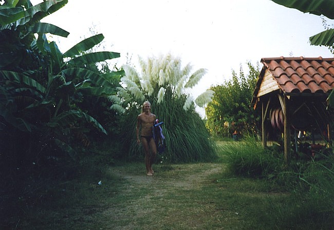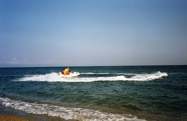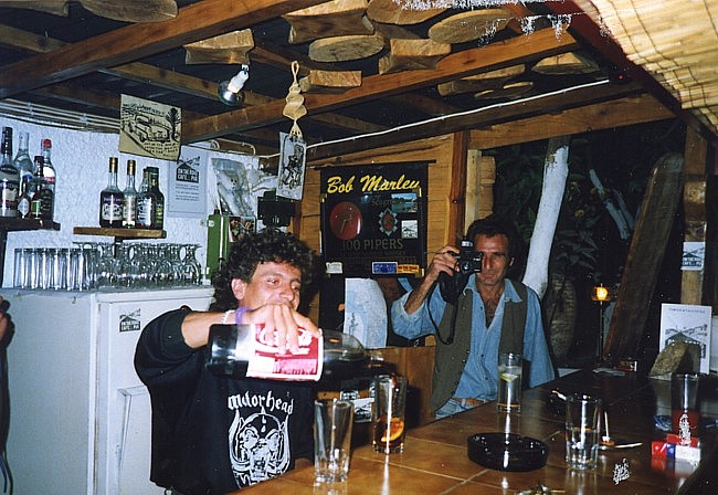 Nach einer herzlichen Begrüßung schlugen wir schnell unser Lager auf und ich freute mich, nun endlich wieder unter freiem Himmel schlafen zu können. Bei meinem ersten Urlaub in Griechenland hatte ich es geschafft, nicht eine Nacht unter einem Dach zu verbringen und nun wurde es nach einer Nacht im Waschhaus und vier Nächten in einem Bett im geschlossenen Raum auch höchste Zeit, beim Einschlafen wieder das Sternenzelt über mir zu haben. Torsten und Petra, so erfuhren wir, waren erst einen Tag vorher in Richtung Githio aufgebrochen und wir wollten erstmal eine weitere Woche auf dem Camping verbringen. Wir lernten eine Gruppe Münchener kennen, alle vier ebenfalls auf ihren Motorrädern unterwegs, und verstanden uns auf Anhieb sehr gut mit ihnen. Die Tage vergingen und die Jungs aus München mußten abreisen – wir verabredeten uns, auf dem Rückweg bei ihnen vorbei zu kommen, um zusammen zur Wiesn zu gehen. Am Abend, bevor wir runter nach Githio wollten, fuhren wir mit Lisa und Benni zur Panajiri nach Kypparissia. Sowas hatte ich noch nicht gesehen, ein irres Gewusel... Als ich die Fahrgeschäfte sah, und wie sich die Leute darüber freuten, war ich gleichzeitig fast schon etwas beschämt, wenn ich an den Hamburger Dom dachte... Lisa und Benni trafen natürlich auch viele Bekannte, die sich wunderten, was sie wohl mit den beiden Langhaarigen in den über und über geflickten Hosen wollten und fragten, ob wir entweder sehr arm oder Verbrecher seien Wir fuhren irgendwann mit dem Taxi zurück, und im Gegensatz zum Hinweg fuhr der Taxifahrer auch wie ein griechischer Taxifahrer – oder zumindest wie ich mir einen griechischen Taxifahrer vorgestellt hatte Am nächsten Tag fiel mir der Abschied einerseits schwer, andererseits wollten wir aber auch noch nach Githio. Ich hatte Friedel von Githio und von Takis und dem “On the road Pub” erzählt, jetzt mußten wir einfach dort hin. Statt wie im Jahr zuvor über das Taiyetos Gebirge zu fahren, nahmen wir den Weg an der Küste entlang bis Areopolis und von dort aus in Richtung Githio. Diesmal wollte ich allerdings nicht wieder auf den Camping Mani Beach, sondern auf einen Tipp von Ruben und Susanne fuhren wir den Camping Githio Bay an. Dort angekommen fanden wir schnell das Zelt von Torsten und Petra, und da die beiden grad nicht dort waren, machten wir uns den Scherz und schmissen unsere Klamotten einfach nur in ihr Zelt und verschwanden wieder – das Gesicht von Petra hätten wir aber schon gern gesehen Angekommen am Hafen freute ich mich, wieder dort zu sein, hatte ich mich doch ein Jahr vorher schon irgendwie in den Ort verliebt. ![]() Nach einem gemütlichen Essen düsten wir zurück zum Camping und trafen dort auch Torsten und Petra, die natürlich erstmal wissen wollten, wie es auf Zakynthos gewesen sei – wir berichteten ausführlich und fuhren dann zum “On the road Pub”. Richtig gelesen, wir fuhren die ~100m Neben einem jungen Griechen namens Thalis arbeitete Takis' neue Freundin Sissi aus Österreich ebenfalls hinter dem Tresen. Wir vereinbarten gleich, einen Zettel zu machen statt jeden Drink einzeln zu zahlen, und ließen es hoch her gehen – Torsten kam dabei auch nicht zu kurz, sehr zur Freude von Petra ![]() Irgendwann ging Takis nach unten, trat seine uralte BSA an und... ließ sie einfach laufen, ging wieder nach oben in den Pub und genehmigte sich erstmal einen Whisky und wir schauten seinem Motorrad beim Warmlauf zu. Torsten, Friedel und ich ließen uns nicht lumpen, gingen ebenfalls nach unten und zelebrierten schöne Burn-outs mit unseren wirklich nicht grad leisen Mopeds Morgens gegen 4Uhr verließen wir den Pub, nachdem wir die Zeche von ~10.000GDR gezahlt hatten – für insgesamt drei extrem durstige “Wilde” zur damaligen Zeit keine wirkliche Offerte, heutzutage aber warscheinlich dreimal so teuer. Am folgenden Tag fuhren wir zu viert in den Ort und nahmen erstmal ein kräftiges Frühstück zu uns – mittlerweile hatte ich mich vollstens an Omeletta oder Spiegeleier mit Speck gewöhnt Danach bummelten wir ein wenig durch die Läden, saßen auf der Platia und genossen zu viert das süße Nixtun Nachmittags entdeckten wir am Strand einen Verleih von SeaBikes, d.h. eigentlich war der Betreiber dabei, einzupacken weil die Saison vorbei war. Wir brauchten nicht lang, ihn zu überreden, daß wir doch noch fahren konnten – da hatten wir nun die SeaBikes, nachdem es auf Zakynthos ja nicht so geklappt hatte. Bei ausreichend Seegang pflügten wir abwechselnd durch die Wellen, Torsten und ich versuchten es auch zu zweit, was aber immer schnell im Wasser endete – für mich ![]() Am folgenden Tag sollte ich dann auch begreifen, warum der Betreiber auf Zykynthos uns belächelt hatte als wir nach einem ganzen Tag fragten... übermotiviert war ich die schrägsten Schräglagen gefahren und aufgrund des Wellenganges alles nicht im Sitzen, sondern immer aus den leicht angewinkelten Knien heraus, und das wurde mit solch einem intensiven Muskelkater quittiert, daß ich kaum laufen, geschweige denn schmerzfrei auf´s Moped steigen konnte Abends saßen wir wieder auf der Platia und als wir die Straße hoch zum Barbier gehen wollten, fiel mir ein bärtiger Typ auf, unsere Blicke trafen sich und er zwinkerte mir typisch griechisch mit dem rechten Auge zu… wir kamen schnell ins Gespräch, er hieß Henry, kam aus Berlin, fuhr eine alte Honda CB750 als AME Umbau und wohnte seit einem guten Jahr in Gythio. Wir verabschiedeten uns „man sieht sich“ und kehrten erneut bei Takis ein. Tags drauf fuhren Torsten und Petra ab, ihr Urlaub neigte sich unweigerlich dem Ende. Friedel und ich trafen Henry im Ort und er zeigte uns wo er arbeitete. Henry brachte jedem ein Getränk, und auf meine Frage, was das denn sei, antwortete er „kalter Kaffee mit Milch und Zucker“ – das war mein erster Frappe und ich wunderte mich, wie gut das schmeckte, vorher hatte ich mich irgendwie nicht getraut, das zu probieren... Wir verabredeten uns 