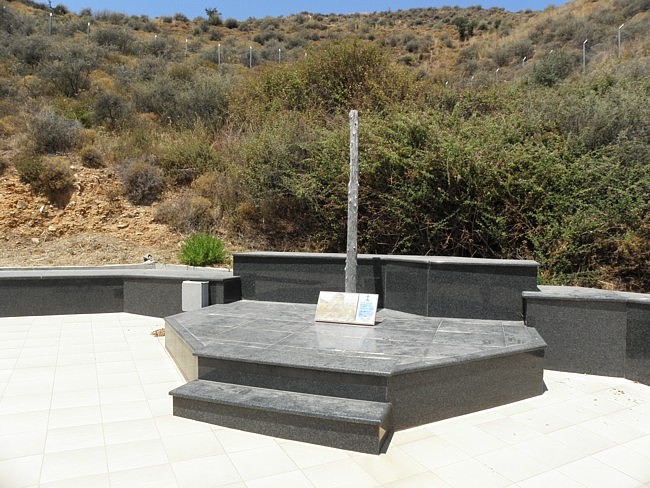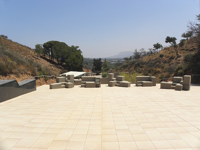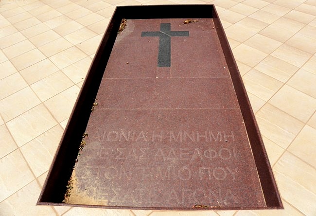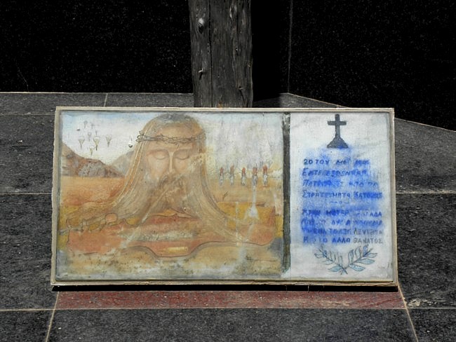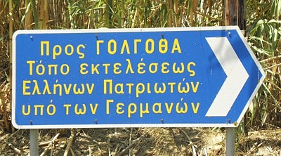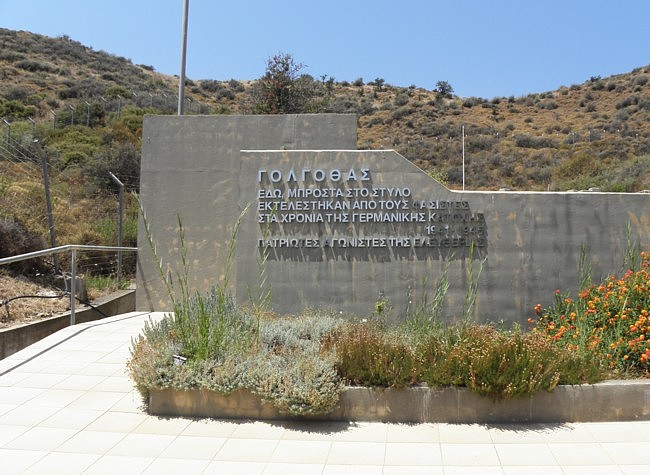Im nicht weit entfernt gelegenen, gleichnamigen Dorf Agiá, fragen wir eine Frau nach dem ausgeschilderten Ort. „Golgothá“, so sagt sie ernst, „ist eine Gedenkstätte für unsere Landsleute, die während der deutschen Besatzung dort hingerichtet wurden. Einmal im Jahr pilgern wir zu der Stelle und gedenken ihrer“. Direkt beim Schild sollen wir abbiegen. Wir fahren also wieder dorthin zurück. Der schmale Weg, der von dort abzweigt, endet an einem breiten Zaungatter. Es lässt sich leicht öffnen, und nach wenigen Metern stellen wir das Auto an einem kleinen Platz ab. Die menschenleere, sehr stille Gedenkstätte liegt etwas erhöht. Ein Betonriegel nimmt die Sicht auf den dahinter liegenden, ehemaligen Hinrichtungsplatz. An der Wand ist zu lesen: „Golgotha – hier, vor dem Pfahl, wurden in den Jahren der deutschen Besatzung 1941 – 1945 Patrioten, Freiheitskämpfer von den Faschisten exekutiert.“