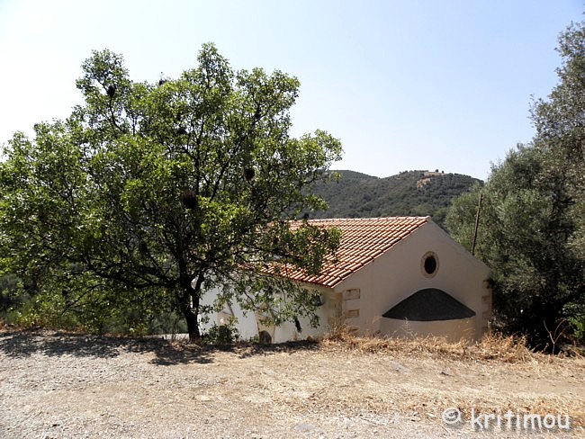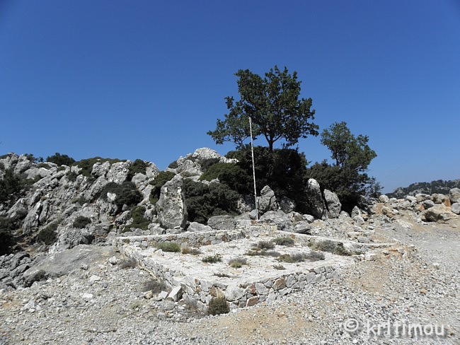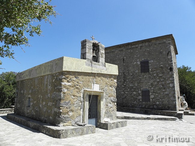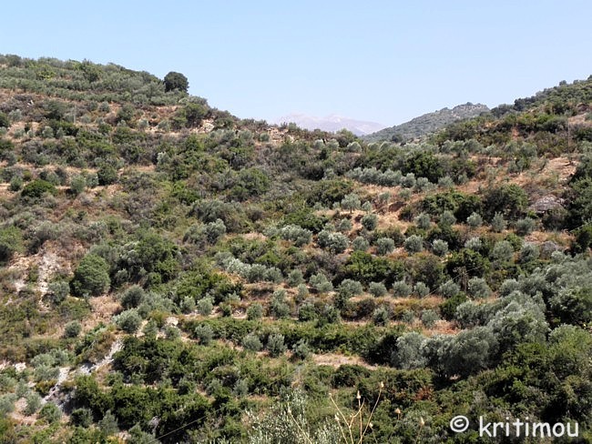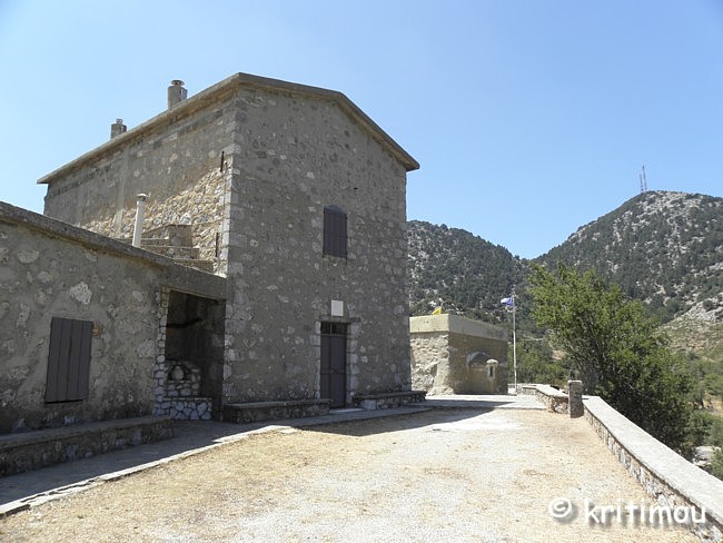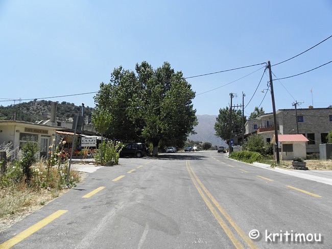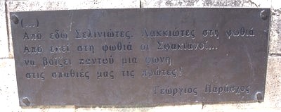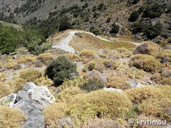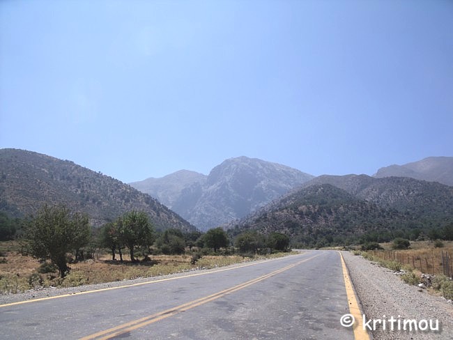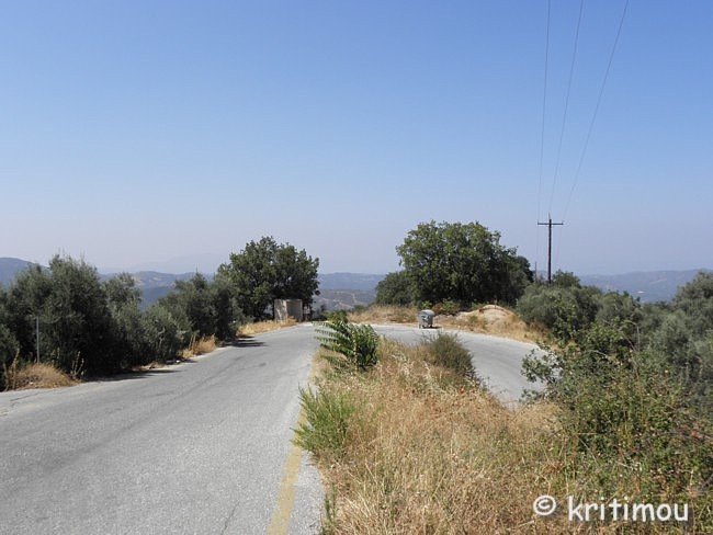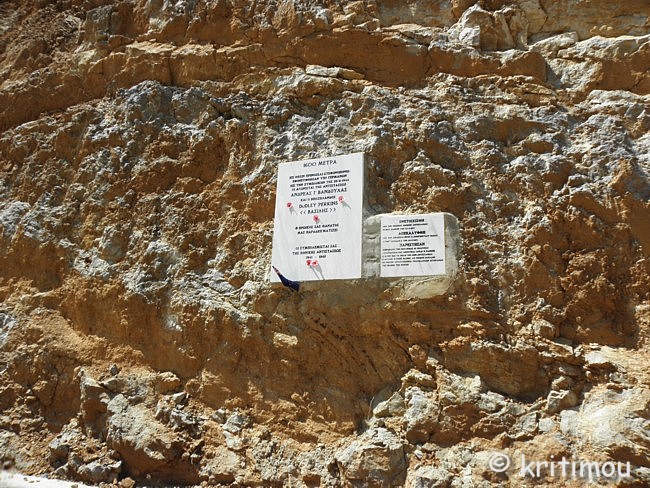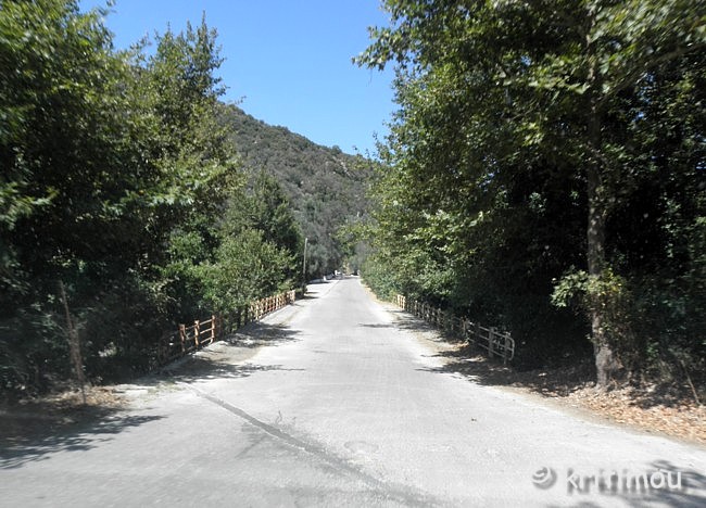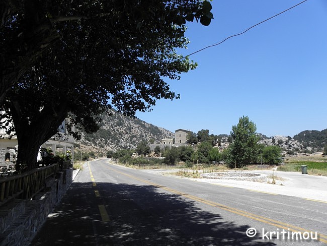 Stellenweise sind beide Seiten mit dünnen Oleandersträuchern bepflanzt. Später einmal wird sich ein rosa-weißes Band nach Omalós schlängeln. Die Vegetation wechselt jetzt merklich. Olivenbäume kommen seltener vor, die Hügel rundherum sind vorwiegend mit niedrigen Büschen bewachsen. ![]() Unterwegs fallen uns Hinweistafeln auf zwei Denkmäler auf. Das eine bezieht sich auf den Stützpunkt des lakkiotischen Helden Sarridantónis, einem Filikós (Mitglied des Geheimbundes Filikí Etería) und Anführer von tausend Kämpfern (1821).