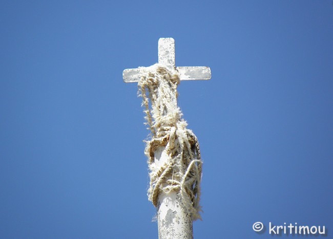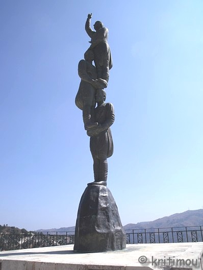 Nachdem wir uns am Vortag ausgeruht haben, steht für heute ein Ausflug nach Omalós an, mitten hinein ins Herz der Weißen Berge. Omalós, eine der drei großen Hochebenen Kretas, neben der Nída im Ida-Gebirge und der Lassíthi im Osten, Widerstandszentrum während der Aufstände gegen die türkische Besatzung, als es nur Eselspfade gab, über die man das auf über 1000 Meter hoch gelegene Plateau erreichen konnte, Startpunkt für eine Wanderung durch die berühmte Samariá-Schlucht oder hinauf auf den Gíngilos, den silbern glitzernden Fels hier am Ende der Schlucht, zum Besuch der Kallergie-Hütte und darüber hinaus, oder einfach Ausflugsziel, um die hohen, weiß-leuchtenden Bergspitzen der Lefká Ori aus der Nähe zu bestaunen und die Atmosphäre dort oben, die Abgeschiedenheit, Ruhe und Stille zu erleben. Am späten Morgen sind wir startklar. Wir folgen zunächst der langgezogenen Dorfstraße in Kalýves, die uns nicht direkt zur Schnellstraße bringt, sondern in ihrer Fortsetzung als Landstraße (Old Road) automatisch die kurze Strecke hinauf auf den Kalámi-Hügel. Rechts schweift der Blick über die Soúda-Bucht mit ihrer makellosen, tiefblauen Farbe, während wir linkerhand die Festung Itzedin umrunden, die noch zu Zeiten der türkischen Besatzung, Mitte des 19. Jahrhunderts, errichtet wurde. Bis in die 1970er Jahre hinein wurde sie später als griechisches Gefängnis genutzt. Für uns als flüchtige Passanten hinterlässt sie einen militärischen Eindruck, wie eine Trutzburg, abgeschottet, gesichert, auf jeden Fall kein Gelände, das uns zu einer näheren Besichtigung einlädt. Am höchsten Punkt des Kalámi-Hügels stehen wir unerwartet vor einer Auffahrt auf die Schnellstraße (New Road). Die wenigen Kilometer bis Chaniá sind schnell zurückgelegt, und irgendwie finden wir auch die richtige Ausfahrt, die uns zur Straße nach Fournés bringt. Der Abzweig nach Omalós mitten im Ort ist ausgeschildert. Während wir bis hierher durch weitflächiges Orangenland gefahren sind, wird die Vegetation nun etwas karger. Olivenbäume und später nur noch niedrige Büsche wechseln sich ab. Die Berge erstrahlen durch das Gegenlicht der Sonne in den verschiedenen Grautönen etwas unwirklich: die dunkel und geheimnisvoll wirkenden Bergketten im Vordergrund, dahinter reiht sich Gipfel an Gipfel in verschiedenen Abstufungen zum Hellen, bis zu den dunkelweißen Spitzen in der Ferne, den Zweitausendern, die märchenhaft in ihrer Umgebung zu verschwimmen scheinen. Als die Olivenfelder weniger werden und die Aussicht in die Täler grandioser, nehmen auch die Kräuterdüfte zu. Wir ertappen uns dabei, wie uns bei geöffnetem Fenster ein Hauch von Thymian umweht oder ein Duftstrom von Oregano, auch Gräser und Sträucher, die wir nicht identifizieren können, mit einem Mal die Nase kitzeln. Manchmal halten wir an, rollen zurück zu der Stelle, wo es am intensivsten riecht und versuchen schnuppernd zu erraten, um was für ein Kraut es sich handelt, das da einen so köstlichen Duft verströmt. Das letzte Dorf vor Omalós heißt Lákki (geschrieben: Λάκκοι, also im Plural) und bedeutet Gruben. Gegraben wird heute nicht, wohl aber an der neu geteerten Straßendecke am Ortseingang gewerkelt. Angenehm windig ist es, als wir im Zentrum, neben der Kirche, parken. Ein dort seit 2001 existierendes Widerstandsdenkmal mit drei übereinander stehenden Figuren wird einer kleinen Reisegruppe gerade von ihrem Fremdenführer erklärt. Das Denkmal erzählt von der unerschütterlichen Entschlossenheit der Bewohner von Lákki und der Umgebung Sélino im Kampf gegen die Besatzungsmächte, insbesondere gegen die Osmanen, auch oder vielleicht gerade, weil die dargestellten Männer eine Vráka, die traditionelle Pluderhose, tragen. Auch wenn man heute so gut wie niemanden mehr in der alten Tracht sieht (allerdings noch vor dreißig Jahren, zumindest in den Dörfern, fast alle älteren Männer), könnte sie in Verbindung mit diesem Denkmal auch als Symbol der Besinnung auf die traditionellen Werte verstanden werden, der Freiheitsliebe der Kreter, ihre Unbeugsamkeit über die Jahrhunderte hinweg und daraus entstanden die starke Motivation für ihren Widerstand gegenüber jedweden Eroberern. ![]() Die drei Männer, die sich gegenseitig nach oben hin stützen, könnten die Kämpfer aus Lákki, Sélino und Sfakiá in den Aufständen gegen die Osmanische Besatzung symbolisieren, in der auf einer der Inschriften, die am Sockel ringsum angebracht sind, Bezug genommen wird, dem Auszug aus der Kretischen Hymne mit den Versen von Giórgos Paráschos: