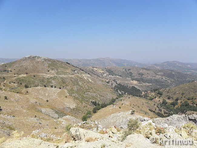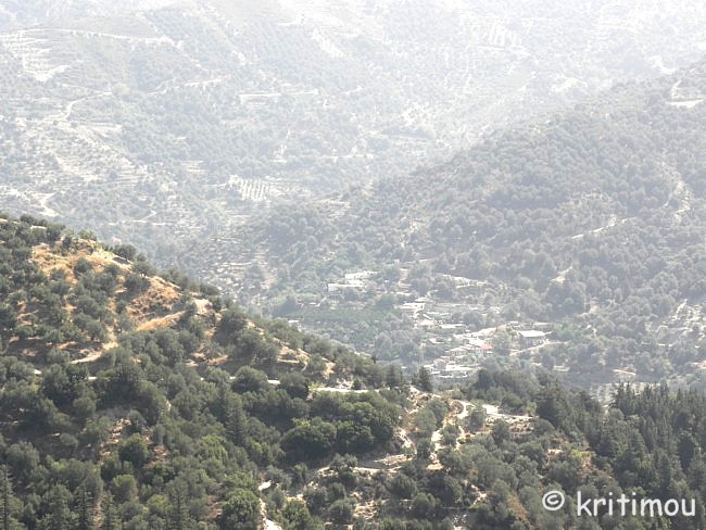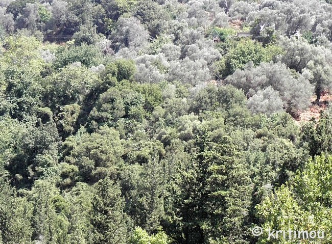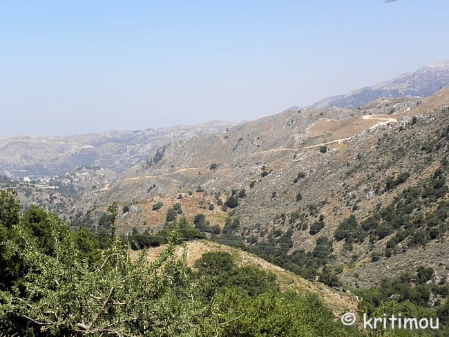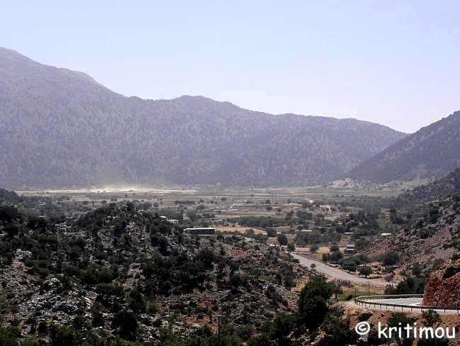 ![]() Das andere weist auf den Todesort zweier Widerstandskämpfer gegen die deutsche Besatzung hin: Andréas Vándoulas und der Neuseeländer Dudley Perkins, genannt Vassilis, geehrt mit dem Titel „Löwe von Kreta", die am 28.02.1944 den Tod fanden. Bei der Enthüllung des Denkmals im Jahr 1971 waren neben politischen und kirchlichen Würdenträgern vierzig neuseeländische Veteranen der Schlacht um Kreta zugegen, und Patrick L. Fermor, jener britische Offizier, der am 26. April 1944 maßgeblich an der Entführung des kommandierenden deutschen Generals Heinrich Kreipe auf Kreta beteiligt war. ![]() Kurz vor dem Eingang nach Omalós sind die Hügel mit Bäumen bestanden, vielleicht die Reste eines ehemaligen Waldes. Im Kapitel „Der letzte Wald“ des 1988 erschienen Buches „Blumen von Kreta“ resümiert der Autor Yanoúkos Iatrídis, dass schon seit der Antike Raubbau an den kretischen Wäldern betrieben wurde und als Ergebnis der „länger als 8000 Jahre anhaltenden menschlichen Exzesse“ der kretische Wald heute fast ganz verschwunden ist. Reste gäbe es nur noch in Form von kleinen Flecken. Zwischen den licht bewaldeten Hügeln führt die Straße wieder leicht bergab, und nach wenigen Kurven liegt die Ebene von Omalós vor uns.