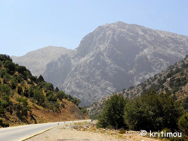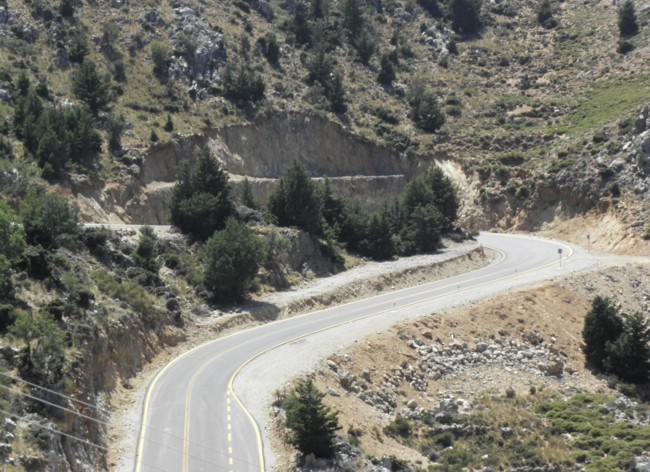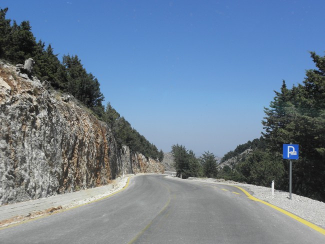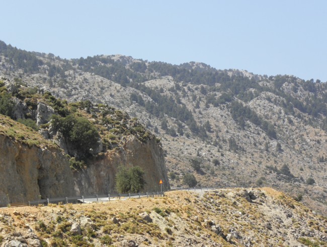 Mittlerweile hat sich die Reisegruppe eines der Lokale auf der Platía ausgesucht. Wir nehmen in dem Kafenío auf der gegenüberliegenden Seite Platz, wo ein paar einheimische Männer Karten zocken und Kaffee trinken. Leise tönt kretische Musik aus dem Radio. Uns dürstet ebenfalls nach einem kräftigen Kaffee, einem Frappé, der sich beim Servieren als Ellinikó entpuppt, lecker und ausreichend. Und erst die dünne Pita mit Honig und ganz wenig Feta (bekannt als Sfakiotische Pita) – ein himmlischer Vormittagssnack. Im Dorf ist es um diese Zeit recht ruhig. Einmal war ich hier, ein paar Stunden früher am Morgen, als es zuging wie auf der Autobahn. Ein Bus nach dem anderen raste um die Kurve, hinauf nach Omalós, um die begierigen Wanderer schnellst möglich zum Eingang der Samariá-Schlucht zu bringen. Heute fahren nur wenige Busse nach Ablieferung ihrer Personenfracht gemütlich zurück nach Chaniá. Sicherlich liegt das zum einen an der heißen Jahreszeit, in der sich so mancher vor der langen Wanderung scheut, andererseits an der schon fortgeschrittenen Stunde. Die Wanderung durch die Schlucht hat jedoch keinesfalls ihre Reize verloren und gehört, ganz im Gegenteil, mit zu den beliebtesten Unternehmungen von wanderfreudigen Urlaubern. Und so wird man im Frühjahr und Herbst zu früher Morgenstunden weiterhin bei einem Kaffee in Lákki in der Kurve sitzen und sich ob des vorbeirauschenden Verkehrs, der so gar nicht hierher passt, in einem Parallel-Universum wähnen. Lákki werden wir heute über die Platía hinaus nicht weiter erkunden. Die Atmosphäre ist zurückhaltend freundlich, ansonsten bleibt man wohl eher unter sich. Auf 450 Meter Höhe gelegen, kommen hier weniger Fremde hin als in die Dörfer an der Küste; für an- und abreisende Wanderer ist das 300-Seelen-Dorf eher ein Durchgangsort, für kurz Verweilende, so wie wir, ein einfach zu erreichendes, nettes Ausflugsziel mit einer schönen Aussicht in die Bergwelt. Bei unserer Weiterfahrt entdecken wir noch Reste der alten Straße, mit ihren engen und steilen Kurven. Heute dagegen gleitet man über eine breite, mit Parkbuchten und Leitplanken, gesicherte Strecke dahin.