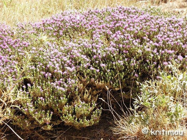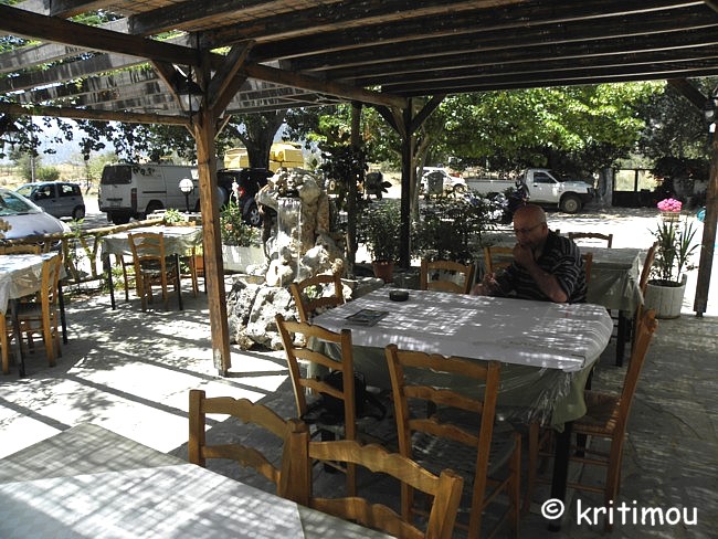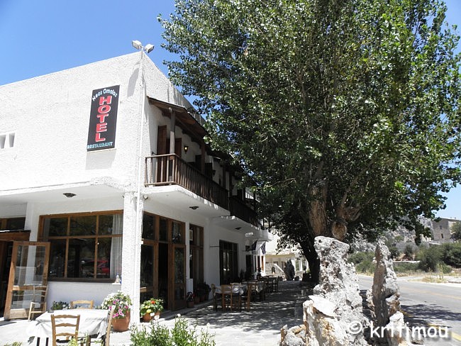 Schräg hinter dieser Tafel blüht ein riesiger Thymian-Strauch in seiner allerschönsten Pracht. ![]() Um Alex den Mund so richtig wässrig auf eine Wanderung zu machen, fahren wir die letzte Steigung hoch zum Lokal „Xylóskalo“. Leider müssen wir feststellen, dass das am Fuße des Gíngilos gelegene Café mit seiner fantastischen Aussicht vom Balkon bis tief in den Schluchtengrund leider geschlossen hat. Hoffentlich nur temporär. ![]() Zu einer anderen Jahreszeit (keinesfalls im Hochsommer!) werden wir wieder hierherkommen und die Schlucht gemeinsam durchwandern. Ich schwärme von den Düften des Waldes und den Maserungen des Sandsteins, den engen Stellen, an denen sich die hohen Wände fast berühren, dem klaren Gebirgswasser, dem Dorf Samariá und der Stille dort, wo der Bach unterirdisch weiterfließt und die Welt plötzlich zu verstummen scheint, wenn nicht der Mensch durch sein Getöse stört. Auf dem Rückweg möchten wir die Omalós-Ebene einmal umrunden. Die einst schmalen Schotterwege sind heute asphaltiert. Früher konnte man kreuz und quer über die Felder laufen, heute sind die Grundstücke fast alle eingezäunt. Schafe sehen wir keine mehr. Bei meinen vorherigen Besuchen grasten mehrere Herden wild (und ohne Hütehunde!) auf den Grasflächen. Die Ebene wird auch heute noch landwirtschaftlich genutzt; sie ist insbesondere mit Obstbäumen bepflanzt. Weizen wird jedoch nach unserem Ermessen nicht mehr angebaut. Vor Jahrzehnten war Omalós mit seinem fruchtbaren Boden bekannt für den Getreideanbau, wie Fotos aus jener Zeit belegen. Mit einfachsten mechanischen Mitteln und sehr viel menschlicher Arbeitskraft wurde gesät, gejätet, geerntet und gedroschen. Mitten in der Ebene, bei den Dolinen und Senken, in denen sich im Frühjahr das Schmelzwasser zu kleinen Seen sammelt, wird großflächig Erde bewegt. Vielleicht entsteht ein Speicher für das Schmelzwasser des Frühjahrs, der die benötigte Bewässerungsmenge für den Sommer festhält? Eventuell werden auch die Dolinen verfüllt. Oder man möchte vielleicht weitere Unterkünfte für die Schluchtenwanderer bauen. Auf jeden Fall ist die Staubfahne der Baustelle schon von weitem sichtbar. Am Abzweig nach Soúghia weist ein Riesenschild die Richtung. Von der Größe des Wegweisers könnte man auf eine breite Schnellstraße schließen, dabei geht es tatsächlich nur 1000 Meter über unzählige Serpentinen bergab. In der Nähe des Abzweigs standen die Hütten von Bauern oder Hirten, kleine Kuben aus Naturstein, die jetzt zu Unterkünften für Touristen umgebaut und modern hergerichtet sind. Und so finden wir auch die Hütte von Pávlos nicht mehr, der uns in seinem rustikalen Hof einst einen wundervollen Salat mit zwei riesigen, dicken, köstlichen Feta-Scheiben aufgetischt hatte. Nur das vor vielen Jahren in der Mitte zusammengekrachte Haus erkennen wir wieder, es rottet weiter vor sich. Im Hotel „Néos Omalós“ kehren wir ein, wo ich schon mehrmals in Gesellschaft oder alleinreisend übernachtet und mich jedes Mal sehr wohl gefühlt habe. Der holzvertäfelte Innenraum der Taverne sieht aus wie eh und je, nur der Fernseher ist eine Nummer größer geworden. Einige alte Fotos von Omalós zieren die Wände, sodass man einen Eindruck vom früheren Leben erhält. Eines davon zeigt Arbeiter im Jahr 1954, als sie die erste Straße von Lákki nach Omalós bauten. Der süße Raumerfrischungsduft an der Rezeption ist noch in meiner Erinnerung erhalten. Aus der Küche hört man Gewerkel, Vorbereitung auf den abendlichen Tavernen-Ansturm. Im Außenbereich setzen wir uns an einen der wenigen Tische in der gemütlichen, schattigen Pergola.