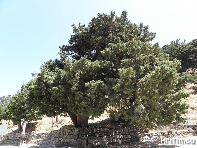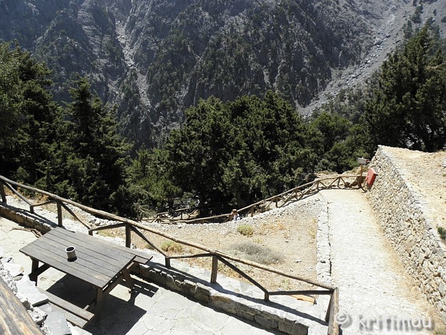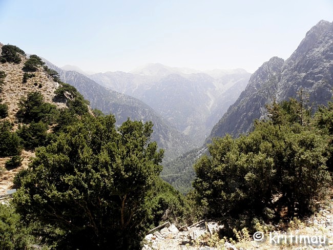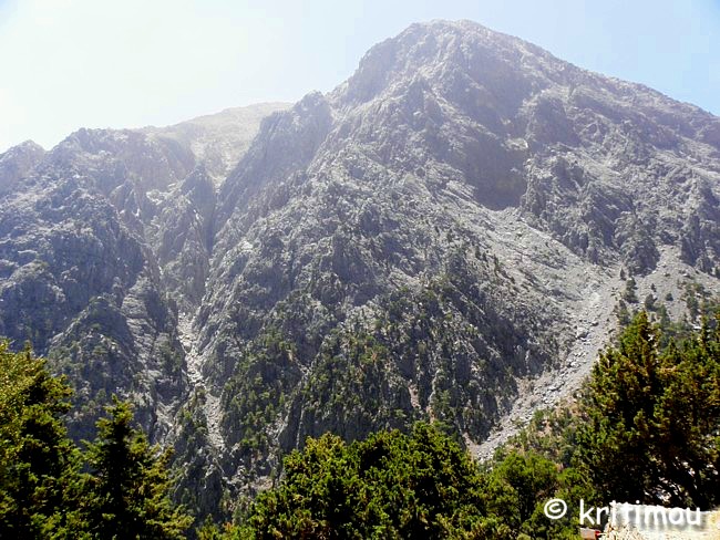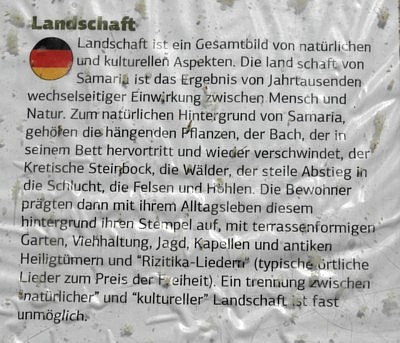 Wahrzeichen des Schluchteneingangs ist eine Italienische Zypresse (Cupressus Sempervirens) in einer Horizontalform, anders als die hoch aufragende, schlanke Art, die in der Regel bei Kirchen, Kapellen und Friedhöfen stehen. Dieser einzelne Baum könnte schon sehr alt sein. Weiter philosophiert der Autor im oben genannten Buch, dass die Omalós-Ebene vor ihrer menschlichen Nutzung einst mit einem Zypressenwald bedeckt gewesen sein könnte. Wenn man sich vorstellt, wie geheimnisvoll die Gegend gewirkt haben muss, begleitet von den Geräuschen des Windes in den Ästen der knorrigen Bäume; wilde Tiere, die den Wald bewohnten; Dämonen, die aus den Tiefen der Tzánis-Höhle, am Eingang zur Ebene hervorkrochen, und ihren Tribut forderten - eine Landschaft, wie geschaffen für die Entstehung von Mythen und Sagen. ![]() Landschaft - ein Begriff, dessen Ausführung nach dem Verständnis dieser Region, insbesondere der Samariá-Schlucht, an ihrem Eingang auf einem schon etwas in die Jahre gekommenen Plakat zu finden ist.