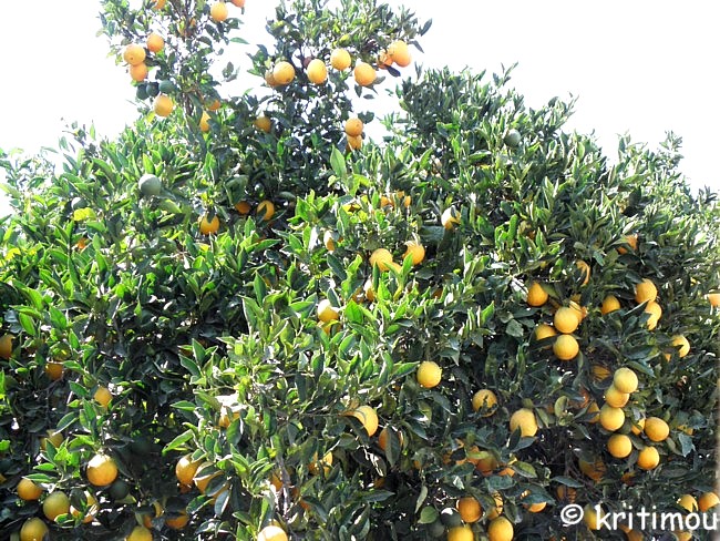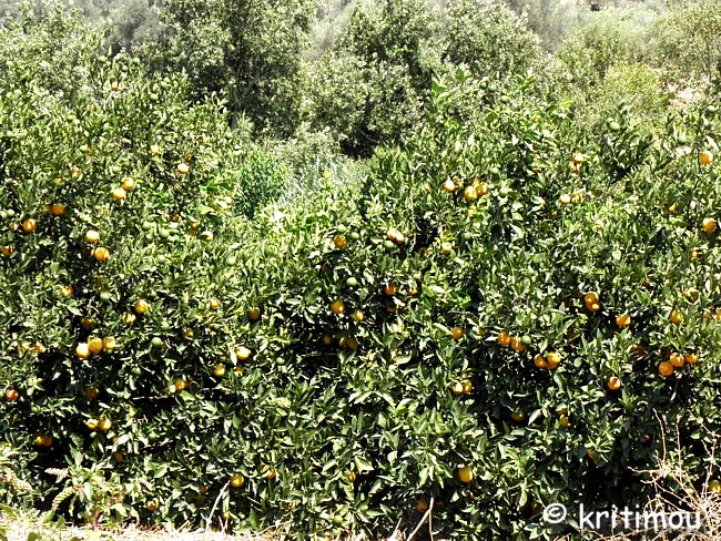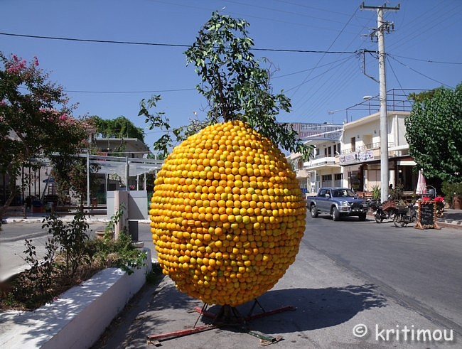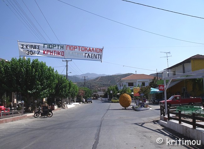 Eine nette Frau in einem Café, mitten im Dorf, fragt, wo ich herkomme. Nach Beantwortung der Frage legt sie mir sogleich einige Früchte auf den Tisch. Sie sehen äußerlich nicht wie die gelackten Orangen aus dem Supermarkt aus, haben dunkle Flecken oder Verwerfungen in der Schale, doch schon beim Schälen läuft der Saft über Hände und Arme, süß und saftig. So sollen Apfelsinen schmecken! Im Ort laufen derzeit die Vorbereitungen für das Orangenfest am 30.Juli, zum Abschluss der Orangensaison, wie ein über die Straße gespanntes Transparent ankündigt. Mitten im Dorf wurde dazu eine Riesenapfelsine aufgebaut. Früchte dafür scheint es tatsächlich im Überfluss zu geben. Zum Fest wird kretische Musik erwartet. Γιώργος Σκευάκης (Giórgos Skevákis) und Μανώλης Αγγελάκης (Manólis Angelákis) werden ab 21 Uhr aufspielen. Vielleicht fahren wir hin.