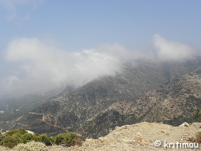 ![]() Nur etwa zehn Kilometer von Plátanos entfernt, doch durch das stete Auf und Ab und unsere langsame Fahrweise gefühlt schon viel weiter, erreichen wir Sfinári, ein Durchgangsdorf mit einigen Lokalen und Unterkünften für die Besucher des unterhalb gelegenen Sandstrandes. Nicht weit entfernt gibt es einen weiteren Ortsteil, das Obere (Ano) Sfínari, bestehend aus nur wenigen Häusern. Dahinter erwartet uns ein gutes Wegstück mit tiefgrüner Bewaldung entlang eines Tals. Keine Serpentinen, sondern einfach mal geradeaus geht es über einen Kamm. Intensiver Kräuterduft erfüllt die Luft und betört zusammen mit der berauschenden Aussicht unsere Sinne. Als wir den Nachbarhügel erreichen und bergan fahren, wird die enge Straße wieder kurviger. Hinter jeder Kehre erwartet uns eine Überraschung an Düften und landschaftlichen Leckerbissen. Um die 700 Meter über Meeresniveau sind wir bei tropischer Luftfeuchtigkeit schon bergan gefahren. Kleine Wölkchen bedecken den Nachbarhügel. Wir halten an und genießen die Stille hier oben. Niemand weit und breit außer uns, noch nicht mal ein vorbeifahrendes Auto stört unser Innehalten. Beim Blick zurück auf den Bergkamm, sehen wir, wie sich von Westen schnell eine große Feuchtigkeitsbank darüber schiebt. Die Ebene auf Meeresniveau ist im Dunst jetzt kaum noch zu erkennen. ![]() Das nächste Dorf, das sich abseits der Durchgangsstraße an einen Hang schmiegt, heißt Kámbos. Eine Ziegenherde verstopft die Straße und lässt uns anhalten, die Glöckchen läuten aufgeregt. Wir möchten hier nicht weiter verweilen, durchqueren ohne anzuhalten das Dorf und fahren weiter bergan. Einige Haarnadelkurven später steigen wir nochmals aus, um zu beobachten, wie schnell der Nebel in die benachbarten Bergkronen zieht. Augenblicklich kühlt es auch an unserem Standpunkt spürbar ab. Keramotí heißt eines der nächsten Dörfer, die wir passieren. Ein Arbeiter schuftet am Ortseingang an einem Betonmischer, sonst ist weit und breit keine Menschenseele zu sehen. Wirklich nicht zu beneiden, der schwitzende Mann. Ein anderer, der sich freiwillig in der sommerlichen Mittagshitze bewegt, ist ein touristischer Wandersmann, zu erkennen an den Nordic-Walking-Stöcken, der in unsere Richtung gleichförmig berganstapft. An der übernächsten Kurve liegt auf der Kuppe des Hügels exponiert und einladend die urige Kantina „Coffee with view“. Auf ein paar überdachten Holzbänken an schmalen Tischen sitzend überblickt man einen großen Teil der umgebenden Bergwelt bis hinunter zum Meer. Ein wirklich feines Plätzchen, um eine Rast einzulegen.
