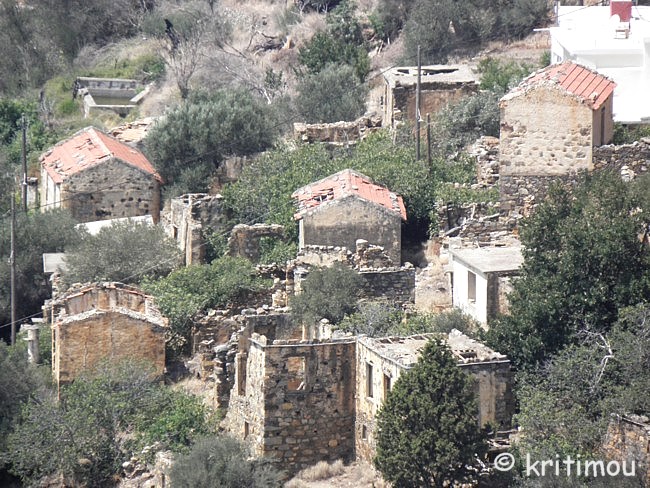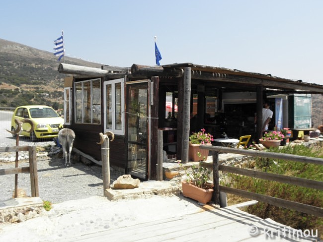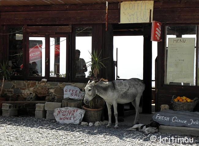 ![]() Ein großer, gelber Schmetterling labt sich an den Blüten im Blumenkasten, um uns danach vor der Nase herumzutanzen. In der Nähe zwei Vögelchen, die im Gleichklang die schrägsten Kurven fliegen. Bussarde haben sich in schwindelerregenden Höhen geschraubt und ziehen ihre Kreise. Fiepende Hundewelpen ziehen die Aufmerksamkeit auf sich, denen zwei Kinder bis zur Übelkeit das Schaukeln auf einem Holzpferdchen beibringen. In der übrigen Zeit toben die Kids herum, unbeeindruckt von den mahnenden Worten der Wirtin. Eine Katze, die plötzlich wie aus dem nichts auf den hohen Kühlschrank springt, betrachtet sich genüsslich die Szene von oben. Die Hauptattraktion ist jedoch ein Esel, der zunächst außen im schmalen Schatten der Kantina steht, aber immer mal wieder hereinkommt, zum Schauen und behäbigen Herumgehen, weil der Schattenbereich hier doch so viel größer ist und auch interessantere Dinge geschehen. Auch wenn die Kantina-Wirtin ihn immer wieder nach draußen drängt, vergehen kaum fünf Minuten, und schon lugt sein Kopf durch die Öffnung, und er schiebt seinen Körper in Zeitlupe wieder herein. Bei einem frisch gepressten O-Saft mit viel Eis macht es richtig Spaß, dem unterhaltsamen Treiben zuzuschauen. Der Wandersmann ist schließlich auch hier eingetroffen und hat ziemlich geschafft und mit einer knallroten Nase Platz genommen. Nachdem er sich etwas erfrischt hat, zückt er sein Fernglas und beobachtet die Umgebung. Grüßen tut er nicht. Als ein Freund der Wirtin von seiner Fahrt an die Küste zurückkommt, berichtet er nachdrücklich und sich wiederholend, dass Kastelli vor Hitze kocht. (I Kastélli vrási!) Das glauben wir ihm gerne, den Beginn dieses glühenden Garvorgangs haben wir heute Vormittag ja noch mitbekommen. Auf jeden Fall freut sich der Mann, dass er nicht an der Küste leben muss, sondern bei wesentlich erträglicheren Hochsommertemperaturen hier in den Bergen seinem Tagwerk nachgehen kann (außer man muss doch mal nach Kastélli). Mittlerweile fühlen wir uns erfrischt und freuen uns auf die Weiterfahrt. Noch eine Weile schauen wir dem bunten Treiben zu, auch wie sich der mit dem Mann neu dazu gekommene Hund in den schon vorhandenen Zoo integriert (zuallererst mischt er die Katze gehörig auf). Durch die Berichterstattung, wie es in Kastélli sonst noch so war, und das Ausladen von mitgebrachten Waren, hat niemand auf den Esel geachtet, der die Gunst der Stunde genutzt hat, um sich mitten in der Kantina zu etablieren. Als wir uns verabschieden, und im Auto sitzend noch ein wenig bis zur Abfahrt brauchen, trottet er zum Eingang und schaut heraus, als ob es sein eigener Laden wäre. Ante giá re gaïdouráki! ![]() Die Straße beschreibt zunächst eine 180-Grad-Kurve. Die Kantina liegt rechts oben, am Ende der Zickzack-Straße. ![]() Das unterhalb am Hang gelegenen Örtchen mit seinen vielen Ruinen und nur wenig erhaltenen Häusern heißt Amigdalokefáli (Mandelkopf). Auch wenn die Vorzüge des Lebens in den Bergen nicht von der Hand zu weisen sind, so sind solche Dörfer doch vom Aussterben bedroht, weil es keine Infrastruktur mehr gibt. Wie schade. Obwohl, ein paar der Häuser sehen doch recht neu renoviert aus - vielleicht Sommerhäuser für die Ruheständler?