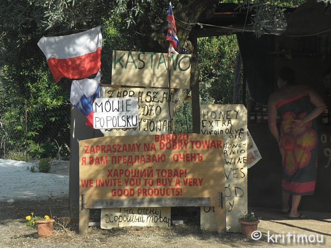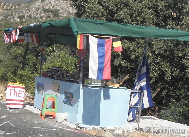 ![]() Und doch sind es diese abgeschiedenen Gegenden, die mir das Urgefühl zu Kreta wieder zurückbringen, das mir über die Jahre irgendwie abhandengekommen ist. Die weiten Blicke über das Gesamtgefüge der landschaftlichen Vielfalt, die Farben und Kräuterdüfte, ein Paradies in einer stillen Welt, die dafür umso präsenter und eindringlicher wirkt. Keine Ablenkung, allenfalls vielleicht ein Vogelpiepen oder das Gesumme von Insekten. Schmale Sträßchen und Wege zweigen von der Hauptstraße ins karge Bergland ab, Zufahrten zu kleineren Weilern. Langsam nähern wir uns dem Ort Kefáli, umgeben von Dörfern, die auf –ianá enden. An unserer Strecke liegen so klangvolle Ortsnamen wie Simandirianá, umgeben von Olivenhügeln und Oleander an (unterirdischen) Wasserläufen, und Pappadianá mit seinem exponierten Kirchlein nebst Friedhof auf einem Hügel; die Häuschen des Weilers wirken menschenleer. Vielleicht halten die Einwohner aber auch einfach nur Mittagsschlaf. Schließlich erreichen wir Kefáli, einen größeren Ort mit Unterkünften, Tavernen, Geschäften und Olivenbäume der älteren Sorte. Das Dorf liegt auf einer Höhe von 500 Metern, die Temperaturen sind also auch hier recht moderat. Doch wir halten nicht an. Schließlich wissen wir nicht, wann wir unser Ziel erreichen und ob wir eine Unterkunft bekommen werden, denn mittlerweile ist der Nachmittag schon weit vorangeschritten. Von Kefáli aus biegt eine Straße nach rechts ab, direkt nach Elafoníssi, dem schönsten, und wahrscheinlich auch am besten besuchten Badestrand von ganz Kreta. Wir folgen dem Weg jedoch in die entgegengesetzte Richtung. Elies säumen nun die schmale Straße, und Platanen überdachen sie. Unglaublich diese landschaftliche Abwechslung, von der kargen, in Teilen fast unwirtlichen Bergwelt, hinein in sattgrüne Dörfer. Es muss einen riesigen Wasservorrat geben, der die großen Flächen mit Kastanien- und Walnussbäumen speist. Kleinere Dörfer liegen neben oder direkt an der Durchgangsstraße, wie „der Luftige“ Aerinós oder Periovólia gegenüber auf dem Hügel. ![]() In Loúchi verkauft man sogar Gelee Royal, wie ein Schild in einer Kurve kundtut. Überall lesen wir Angebote traditioneller Produkte, die in den Dörfern, aber auch direkt am Straßenrand, in kleinen Büdchen, verkauft werden.