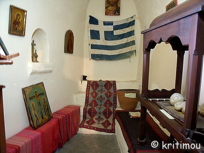 Wir stellen das Auto auf einem Parkplatz vor dem Eingang ab und betreten das Klostergelände, passieren ein kleines dazugehöriges Museum und steigen schließlich ein paar Stufen empor zur Kirche. Der Name Chrissoskalítissa bedeutet im Grunde Panaghía der goldenen Stufe. Somit ist das Kloster der Panaghía gewidmet (Orthodoxer Feiertag am 15. August), ausgehend vom Fund einer Ikone der entschlafenen Gottesmutter in einer Felsnische der Umgebung. Eine Andeutung befindet sich auf dem Weg hinauf zum Kirchengelände. ![]() Die Legende besagt, wer ohne Sünde ist, erblicke die goldene Stufe einer Treppe, die zum Kloster hinaufführt. Tatsächlich, so heißt es, bestand die letzte der 98 Stufen, die das Kloster bei seiner Errichtung hatte, aus purem Gold, die unter der osmanischen Besatzung abgebaut und verkauft wurde. ![]() Die Kirche ist außen und innen in schlichten Farben gehalten, Beige- und Brauntöne mit vergoldeten Accessoires. Bis zum 15. August, wenn das Namensfest hier gefeiert wird, ist es nicht mehr lange. Etwas Blumenschmuck ist dafür schon angebracht worden. Leider können wir uns nicht lange hier aufhalten, denn die Hitze im Kircheninnenraum steht förmlich. ![]() In anderen Gebäudeteilen sind kleine Museen untergebracht, wo Ikonen und liturgische Gegenstände ausgestellt sind. Am besten gefällt mir das Folkloremuseum. Die Einrichtung der winzigen Räume ist der früheren Lebensweise hier nachempfunden. Man könnte fast glauben, die Bewohner seien nur kurz mal außer Haus, so lebendig ist die Gestaltung. ![]() Im hintersten, kleinsten Räumchen gab es auch eine Geheimschule, in der die Mönche, wie in anderen Klöstern Griechenlands, griechische Kinder während der Osmanischen Besatzung unterrichteten, damit die griechische Kultur nicht verloren ginge. ![]() Während unserer Besichtigung haben sich die Wolken über den nahe gelegenen Bergen immer mehr verdunkelt. Weiter rückt die Regenfront jedoch nicht vor. ![]() Von der schwülen Hitze erschöpft, setzen wir uns auf dem Parkplatz noch ein wenig auf ein Mäuerchen unter einer großen, schattenspendenden Kiefer. Besucher kommen und gehen. Zwei dicke Pfirsiche tun uns jetzt gut, die wir von einem Pickup-Verkäufer erstehen. Danach verlassen wir das Klostergelände und fahren durch das Kastanien- und Olivenland wieder zurück, das wir von unserer Anreise nach Paleochóra her schon kennen. Die vorherrschende Landschaftsfarbe ist Grün. Eine Mischung aus Oliv-, Lind-, Flaschen-, Maien-, Gras-, Jade-, Smaragd- und Silbergrün. Alle Schattierungen sind in diesem Bild enthalten, ein verschwenderischer Überfluss. Bei Plemenianá kehren wir wieder an der alten Wassermühle „O Milos“ ein. Die idyllisch gelegene Taverne hat, was das Essen angeht, einen sehr guten Ruf. Wir verzehren jedoch nur Getränke: einen Frappé und einen gemischten Kräutertee, der bei den immer noch hohen Temperaturen gerade richtig kommt. Die Tische im Außenbereich stehen in einer Reihe in einer Straßenausbuchtung auf der gegenüberliegenden Seite des Gebäudes, neben einem schmalen Bach. Eine große Voliere mit verschiedenen Vögeln lädt zum Besuch ein; der angrenzende Kinderspielplatz wird gerade von herumplärrenden Halbwüchsigen belagert. Schade, ohne die Herumgrölerei wäre es sicherlich noch idyllischer. Tagesausklang In Paleochóra kommen wir bei wolkenlosem Himmel an, knallen das Auto in eine Parklücke, eilen zum Steinstrand zu unserem obligatorischen Abendbad und stürzen uns in die schon recht kühlen Fluten. Ein bisschen gestrampelt, und schon wird es wieder warm. Beschaulich ist es am Abend wieder geworden, und wunderbar, in dem glasklaren Wasser über den bunten Kieseln zu baden. Im Kopf sind wir aber immer noch in Elafoníssi. Ach, wie genießen wir unseren Urlaub! Das Kulturprogramm bei göttlichen Sousoukákia Smirneïka (selbstgemachte Hackfleischrollen mit Koriander in Tomatensoße) bestreiten am Abend wieder die beiden Rembétes. Später müssen wir noch den Spott unseres Vermieters über uns ergehen lassen. „Wie geht es euch“, fragt er. - „Wir sind geschafft!“ – „Wieso, habt ihr aufm Acker gearbeitet?“ – „Nein, wir waren in Elafoníssi...“ – „Doch nicht etwa von Sklavopoúla aus? Von dort geht man besser zu Fuß! Harharhar…“