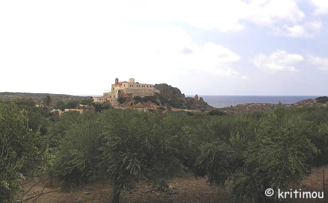 ![]() Wenn wir schnell fahren, können wir in einer dreiviertel Stunde in Paleochóra sein. Doch wir haben ja Zeit und genießen die Fahrt an sich, langsam, an exponierten Stellen mit kleinen Pausen, manchmal ein Foto wert. Immer mehr Wolken ziehen über den Bergen auf. Dort ist es sicherlich nicht so heiß wie hier. Nur wenige Kilometer von Elafoníssi entfernt liegt ein noch bewirtschaftetes Kloster mit langer Tradition. Auf einem Felsen errichtet wirkt es schon von weitem wie eine Festung.