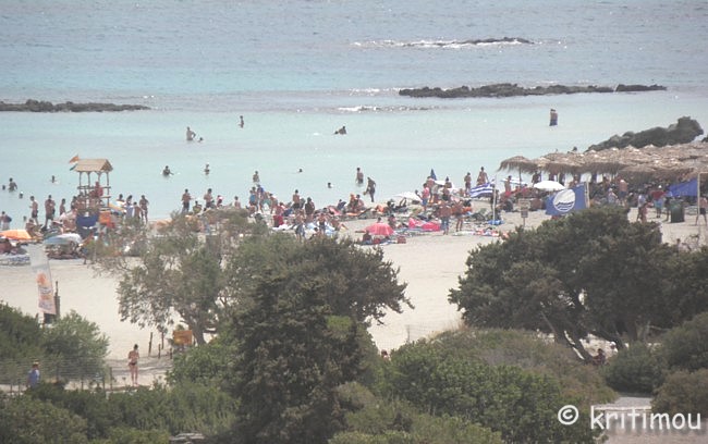 ![]() Auf dem Parkplatz finden wir sogar noch ein halbwegs schattiges Plätzchen. Flugs verlassen wir die Karosse und streben dem Strand zu, dem schönsten, eigenartigsten, wunderbarsten Strand Kretas. Genauso empfinden auch tausende andere Badewillige, die allerdings über einen anderen Zufahrtsweg, eine asphaltierte, breite Straße, hierhergekommen sind.