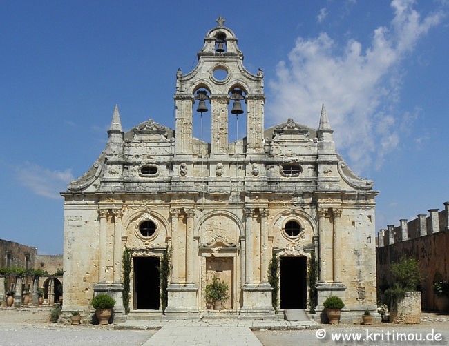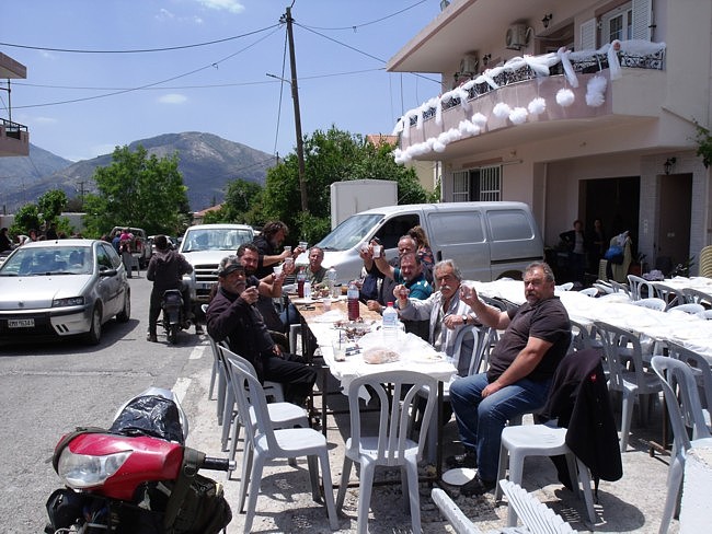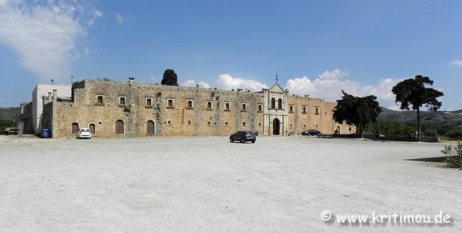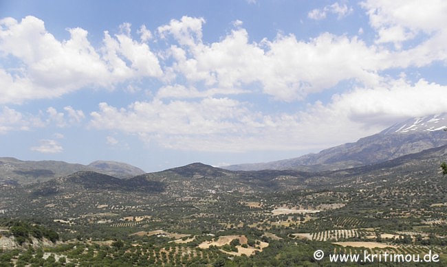 Auf diese Tour habe ich mich schon sehr gefreut, da der Hinweg fast durchweg am Fuße des Ida entlang führt und famose Ausblicke in ein weites Tal verspricht. Wie schon bei unserem Trip nach Zarós lassen wir Timbáki und Kókkinos Pírgos flugs hinter uns, biegen vor Agia Gálini rechts ab, nehmen aber dieses Mal an der Straßengabelung den Abzweig nach links. Kleine Ortschaften wie Apodoúlou, Níthiavris oder Kouroútes, die wir durchqueren, vermitteln den Eindruck von Abgeschiedenheit. Fast kein anderes Fahrzeug begegnet uns weit und breit. Ruhe und Stille erfahren wir auch bei einer Rast mit einem Wahnsinns-Blick in das weite, liebliche Amári-Tal. ![]() Mir fehlen die Worte, mit denen ich die Schönheit dieses Teils von Kreta realistisch beschreiben könnte. Natürlich sind es auch die kretische Musik und die vielen intensiven Erinnerungen über die Jahrzehnte, die bei unserem diesjährigen Aufenthalt auf mich hereinströmen, doch allein die unglaublich majestätische Landschaft und die weiten Blicke lassen mich vor Ehrfurcht beinahe niederknien. Sanfte gewellte Hügel, wenige kleinere Olivenfelder, grüne Sträucher und Bäume durchziehen abwechselnd die Talsohle, eingegrenzt vom Kédros im Osten und dem hoch aufragenden Ida-Gebirge im Westen. ![]() ![]() Der Psiloritis, grau, mit seinen großen, leuchtenden Schneefeldern, scheint uns immer wieder den Weg zu weisen. Je höher wir uns entlang des Ida bewegen, desto weniger sichtbar sind die weißen Flecken, da uns davor gelegene weitere Bergkuppen die Sicht versperren. Doch immer wieder blitzen sie zwischen den Hügeln auf, als wollten sie uns sagen: „Hier entlang, hier findet ihr mich, zuverlässig wie seit jeher.“ ![]() So gelangen wir schließlich in das größte Dorf auf der Strecke, den Ort Fourfourás. Da wir sowieso vorhaben, irgendwo Wasser zu kaufen, suchen wir einen Halteplatz an der langgezogenen Dorfstraße und legen eine Pause ein. Genau hier geraten wir in die Vorbereitungen eines Prógamos (einer Vorhochzeit). Sie wird eine Woche bis zur eigentlichen Hochzeit in Iráklio dauern und ab heute starten. Dieses Fest ist auch insbesondere für diejenigen, die nicht zum Hochzeitsort kommen werden. Die Vorbereitungen für den Prógamos laufen bereits auf vollen Touren. Tische und Bänke werden laut klappernd dicht aneinandergereiht aufgebaut – es sieht so aus, als ob das gesamte Dorf eingeladen ist. Einige der langen Tischreihen sind schon mit Essgeschirr bestückt und mit einer durchsichtigen Plastikplane sorgfältig abgedeckt. Am Straßenrand steht ein Kühlwagen, in dem etliche geschlachtete Tiere auf den Grill warten. Immer mehr Pickups mit weiterem Mobiliar kommen an, geschäftig rattert und scheppert es überall. ![]() Um für den Einkauf unserer Wasserflaschen nicht lange in diesem eifrigen Treiben herum zu suchen, zwängen wir uns durch die enge Pforte einer Abfüllstation für Anapsiktiká (nichtalkoholische Getränke). Die Verkäuferin oder Eigentümerin will uns im Überschwang unbedingt zwei Flaschen Limonade aus eigener Produktion schenken, doch uns als Zuckervermeider sind die Getränke zu süß. Am Ende nehmen wir langweiligen Touris zwei Flaschen Soda mit, Psilorítis-Wasser, ebenfalls aus eigener Abfüllung. Es handelt sich tatsächlich um Rülpswasser erster Güte, erinnert vom Kohlendioxidgehalt sehr an die früheren Produkte. Ein winziger Schluck genügt schon, um die Reflexe außer Kontrolle geraten zu lassen. Während ich noch zu einem kleinen Palaver in der Station verbleibe, läuft Alex ein wenig herum und wird von einer Paréa, die es sich schon reichlich gut gehen lässt, spontan zum Essen eingeladen. Mitten drin in all dem Gewusel brutzelt es nämlich schon verführerisch. Der höflichen Einladung würden wir gerne nachkommen, doch wir möchten uns hier nicht aufdrängen. Ach, wie freundlich, offen und nett die Leute spontan hier sind! ![]() Mit freundlicher Genehmigung zur Veröffentlichung - Yammas! Zurück im Auto und bereit für die Abfahrt kommt die Frau aus der Abfüllstation und reicht uns ein Hochzeitsbrot durch das Seitenfenster, das „ganz ehrlich nur ganz wenig süß ist“. Und herrlich duftend, noch warm, göttlich schmeckend. Wer kann da schon „Nein“ sagen? Hoch soll das Brautpaar leben! Von Fourfourás könnte man den Psilorítis auf einem Teil des E-4-Weges erwandern. Doch die Einheimischen kennen ihre eigenen Pfade hinauf, wie man uns lachend mitteilt. Mehrere führen nach oben, man fährt mit dem Auto, soweit es geht – und nimmt auf jeden Fall einen Grill mit. Ja, mit dem Auto fahren, nicht so viel zu Fuß gehen, weil zu anstrengend. Beschwingt durch diese netten Begegnungen setzen auch wir Autofahrer unseren Weg durch diese von Gott geküsste Landschaft in nördlicher Richtung fort. ![]() Eine halbe Stunde später biegen wir in den weit ausladenden Parkplatz des Klosters Arkádi ein, einem der bedeutendsten Wahrzeichen griechischer/kretischer Geschichte im Kampf gegen die osmanischen Besatzer. Wo, wenn nicht hier, wurde die Losung „Freiheit oder Tod“ im Befreiungskampf in die Tat umgesetzt. Nach 250jähriger Besatzung wurde im Jahr 1866 die Revolution gegen die Osmanischen Herrscher ausgerufen. Dabei kam es in der Nacht vom 7. auf den 8. November zur Belagerung und des Angriffs auf das Kloster Arkadi. Da ein Sieg der kretischen Widerstandskämpfer aufgrund zahlmäßiger Unterlegenheit nicht zu erreichen war, entschieden sich die Verantwortlichen, es nicht in Kauf zu nehmen, den angreifenden Feindestruppen in die Hände zu fallen und sich stattdessen zusammen mit den knapp tausend Menschen, unter ihnen viele Frauen und Kinder, die zu der Zeit im Kloster weilten, in die Luft zu sprengen. Alex kennt diese Geschichte natürlich, war jedoch noch niemals hier, und so freut es mich besonders, ihn mit diesem unverhofften Abstecher überraschen zu können.