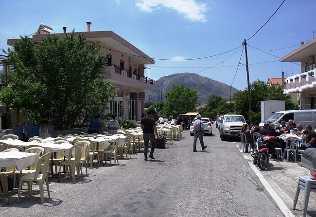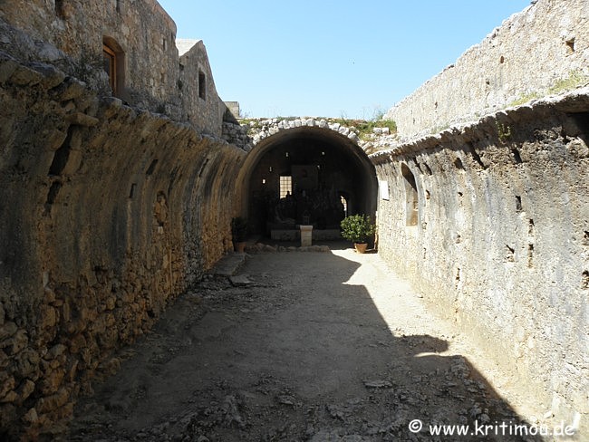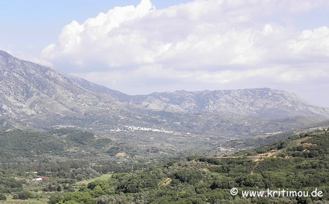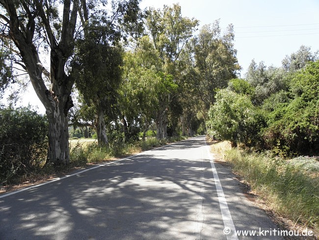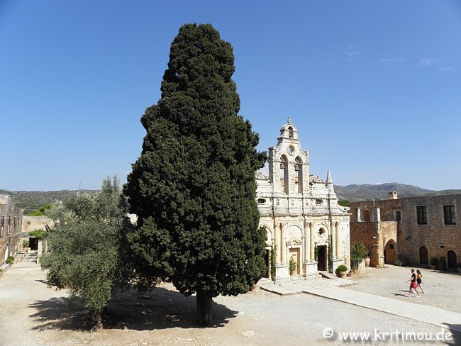 Um zum Inneren des Klosters zu gelangen, müssen wir den riesigen Parkplatz überqueren. Kaum auszudenken, wie sich die Menschenmassen stapeln, wenn der Platz zugeparkt ist. Heute jedoch sind nur wenige Besucher vor Ort. ![]() ![]() Durch den Bogeneingang in der äußeren Mauer schaut man direkt auf das gegenüberliegende Portal der zentral gelegenen Kirche, die wir zunächst besichtigen. Ihre schlichte Einrichtung besteht vorwiegend aus hölzernem Mobiliar. ![]() ![]() Entlang der Mauer, die das Klostergeviert umgrenzt, können auch weitere Räumlichkeiten des früheren Lebens hier besichtigt werden, wie z.B. das Refektorium. Nebenan befinden sich Gegenstände und Werkzeuge zur Ansicht, begleitet von Bildern, die ihren Gebrauch zeigen. Schließlich gelangen wir in das Pulvermagazin mit dem weggesprengten Dach, an deren einem Ende ein Altar mit einer bildhaften Darstellung der Menschen mit dem Abt im Vordergrund, einem Pulverfass und einer Laterne sowie einer Hinweistafel in griechischer Sprache an der Wand. ![]() Im oberen Stockwerk des Klostergebäudes lassen weitere Bilder und gestiftete Ausstellungsgegenstände den Besucher weiter in die Vergangenheit eintauchen. Nach der Besichtigung gönnen wir uns im Außenbereich eine kurze Verschnaufpause, um das Gesehene wirken zu lassen. ![]() Eine schon tiefer stehende Sonne wirft bereits lange Schatten der Säulen und grün umrankten Holzverstrebungen auf den Boden des Innenhofes der Klosteranlage, als wir uns auf den Heimweg machen. Dieser wird uns nicht mehr entlang des Psilorítis, sondern auf der anderen Seite des Amari-Tals, entlang der östlichen Ausläufer des Kédros zurückführen. Im schönen warmen Sonnenlicht können wir gegenüber die Orte erkennen, die wir auf der Hinfahrt durchquert haben, allen voran das große Dorf Fourfourás. ![]() ![]() Unser Weg führt über Klisídi, Thrónos, Amári, Vrísses, Drigiés, Ano Méros (ein Kato scheint es nicht zu geben), Hordáki, Orné und Néa Kría Vríssi zurück zur Hauptstraße, oberhalb von Agia Galíni. Eine ziemliche Gurkerei aber mit weiteren Blicken ins Amari-Tal, so grün, majestätisch, landschaftlich ereignisreich. Ich kann nicht genug davon bekommen. Ein wundervoller Ausflug in die ergreifende kretische Landschaft neigt sich leider dem Ende zu. Am Abend sind wir zum Namenstag unserer Zimmerwirtin Eleni zum Grillen eingeladen. Koteletts gibt es, Bataten aus dem Ofen, geschmorte Zucchini, Chórta und andere Leckereien, begleitet durch ungezwungenes Geplauder im Kreise der sehr netten Wirtsfamilie. Auf mein ausgiebiges Lob an die Köchinnen folgt unter behaglichem Schmatzen meine nicht ganz ernst gemeinte Frage, ob es eigentlich irgendetwas aus der kretischen Natur gibt, das NICHT gesund ist? Man antwortet mir mit einem entschiedenen und keinen Widerspruch duldenden OOOCHI! Und dann wird alles aufgezählt, was gesund ist: die Kräuter, Oliven, das Öl, die Meeresfrüchte usw. Einer der Enkel, der zu Besuch gekommen ist und ebenfalls Namenstag hat (es ist auch Kóstas-Tag), besucht die 5. Klasse und man gibt an, dass er gut in Mathe ist. Alex stellt ihm schnell eine rasend schnell vorgetragene Rechenaufgabe, die wahrscheinlich jedes griechische Kind im Laufe seiner Schulzeit x-mal gestellt bekommt: „Wieviel ist (3 x 11) + (3 x 12) + (3 x 15) + 11 + 7 + 8 + 17?“ Als Kind hat man sich die Antwort irgendwann mal ausgerechnet und antwortet dann, wie aus der Pistole geschossen: 157! Die Antwort dieses Jungen lautet jedoch: „Was fragst du mich? Frag‘ Pythágoras!“ Ein schlaues Kerlchen mit flottem Mundwerk! Der Tag wird am Ende noch mit einem ordentlichen Platzregen abgerundet, doch da liegen wir bereits mit vollem Bauch in der Koje, glücklich über den so schönen Tag. |