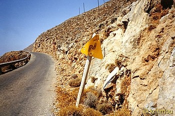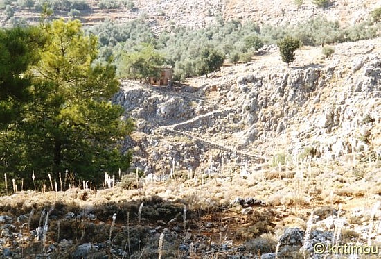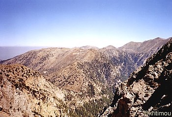 Zum Glück kommt tatsächlich noch jemand vorbei. Touristen, die nur bis zum Ilíngas-Strand wollen, die mich aber bis hoch nach Anópolis bringen. Richtig nett. Zunächst mal falle ich in die erste Cafeteria rechterhand ein und übersehe fast, dass die Wirtin auf der Bank im Schatten liegt und schläft. Unterhalte mich derweil mit der netten älteren Dame, die wohl auch dazu gehört. Das Klima hier oben im Ort ist angenehm, längst nicht so heiß wie an der Küste. So mache ich mich nach einer Weile auf den Weg zur Arádena-Schlucht. Der Ort Anópolis zieht sich noch eine Weile bergan. Bewaffne mich mit einem handlichen Stein, falls einer der Hunde, die hier auch frei herumlaufen, auf die Idee kommen sollte, mir zu nahe zu treten. Tatsächlich springen mir auch einige zähnefletschend entgegen, diese sind angebunden, jagen mir jedoch immer wieder einen ordentlichen Schrecken ein. Da vorne liegt ein schwarzes Monster faul auf der Straße herum. Äugt jetzt zu mir herüber. Keinen Millimeter rühre ich mich weiter. Nach geraumer Weile nähert sich eine Frau und begleitet mich an diesem (wahrscheinlich völlig harmlosen) Hund vorbei. Weiß man`s? An der großen Platía mit dem Dáskalojannis-Denkmal gabelt sich die Straße. Frage in einem Kafeníon einen ausdrucksvollen älteren Dorfbewohner in schwarzer Kleidung inklusive Mandíli nach dem richtigen Weg. Gleich soll ich mich setzen und über meine Familienverhältnisse (wie schon hundert Male vorher in den letzten Tagen) Auskunft geben. Wir trinken eine Portokaláda (Limonade), plaudern noch ein wenig. Der Weg zur Schlucht ist nun nicht mehr weit, vielleicht drei Kilometer. Menschenleer. Ein größerer Ziegenbock nimmt die Verfolgung auf, galoppiert mit gesenktem Gehörn hinter mir her. Vorsichtshalber werfe ich ein paar Steine in seine Richtung, bis er die Straßenseite wechselt. Bin froh, dass mich niemand beobachtet. Ein harmloser Ziegenbock..... Die steinigen Hügel sind übersät mit Millionen von Meerzwiebeln. Hinter einer Kurve sehe ich Arádena, bald auch die beiden Zickzackwege, die zum Grund der Schlucht führen.