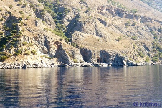 Viel später gelange ich durch den Hafen wieder zurück. Die „Samariá“ hat bereits festgemacht, die Fähre, die ich am nächsten Morgen nehmen möchte. Freue mich schon riesig. Mir geht’s in Pale so, wie vielen anderen wahrscheinlich in Mátala. Die alten Zeiten habe ich nicht miterlebt, die Neuen machen mich nicht an. Die Atmosphäre an der Ostseite des Halbinselchens finde ich jedoch sehr gemütlich. Endlich können wir wenigen Reisenden tags drauf die „Samariá“ betreten. Steige gleich auf das Oberdeck. Zum Glück weht eine liebliche Brise und die Küstenfahrt kann beginnen. Einfach umwerfend. Noch viel schöner, als ich’s mir gedacht habe. Versuche, alles aufzusaugen, die Felsen und Hügel, verfolge die Fahrt auf meiner Karte mit, knipse wie blöd, um möglichst viel festzuhalten, der Wind, der die Haare zerzaust, das Brummen des Schiffsmotors, die Besatzung gut drauf, Antónis Rémos schmettert aus der Cafeteria. Der eine Matrose, der sein Che-Guevara-Shirt schließlich doch mit dem blauen Einheits-Hemd tauscht. Vereinzelt mal eine Kapelle. Soúgia ist viel kleiner und unscheinbarer, als ich es mir vorgestellt habe, scheint etwas verschlafen. Der Aufenthalt nur ganz kurz. Nun Richtung Agia Rouméli, auf das ich mich so freue. Sanfte Wellen vor schroffen, braunen Felsen, höhlenartige Gebilde. Verschiedene Farbtöne des Gesteins, das Schiff recht nah an der Küste entlang. ![]() Agia Rouméli ist heiß und noch recht leer. Beziehe Quartier im „Oásis“, dessen Eingang von üppiger Pflanzenpracht fast zugewachsen ist. Auch hier kostet mich die Übernachtung nicht mehr als 20 Euro. Nun besichtige ich die wenigen Relikte des alten Tárra und erspähe auch das unscheinbare Mosaik außerhalb der kleinen Kirche. Mein Weg führt mich auch zur Agios-Adónis-Felsenkapelle. In ihrem angenehm kühlen Schatten sitzend sehe ich den Touristengruppen zu, wie sie sich aus der Schlucht dem rettenden kühlen Nass in Richtung Meer zuwenden. Morgen werde auch ich mir das Erlebnis der Pórtes gönnen, und erlebe in stiller Vorfreude den beschaulichen Abend im touristenarmen Agia Rouméli, als die Schluchtenwanderer des Tages mit den Fähren davongefahren sind. Viele Stunden lang darf ich diese Einzigartigkeit der Schlucht am Tag darauf erleben, und es wird nicht das letzte Mal gewesen sein. So tiefe Empfindungen angesichts der urgewaltigen Natur. Glücklich und zufrieden stelle ich am Abend meiner langen Wanderung in der Pension fest, dass ich doch ganz schön müde bin, lege mich für ein Stündchen aufs Ohr......und wache am anderen Morgen, zwölf Stunden später wieder auf. Kann mich nicht erinnern, wann mir das zuletzt passiert ist. Der darauffolgende Tag bringt mich per Fähre nach Chóra Sfakíon. Die Fahrt wieder ein einzigartiger Genuss. Insbesondere der Ausgang der Arádena-Schlucht beeindruckt mich sehr. Ich möchte sie mir heute auch noch von oben ansehen. Chóra Sfakíon ist bombenheiß,