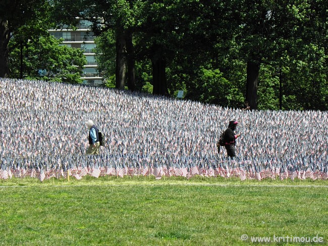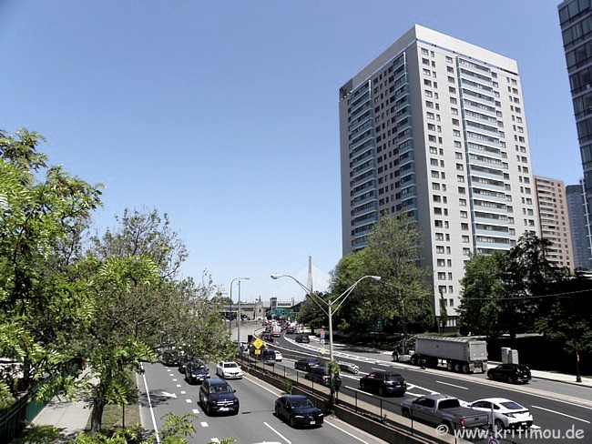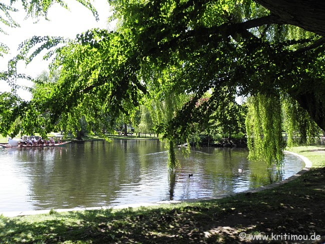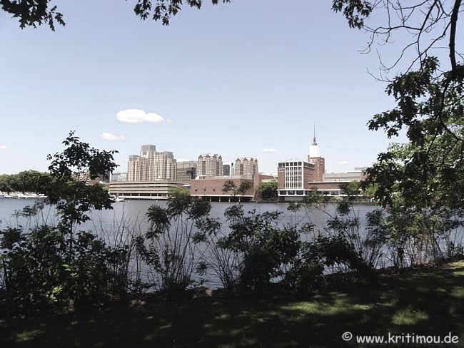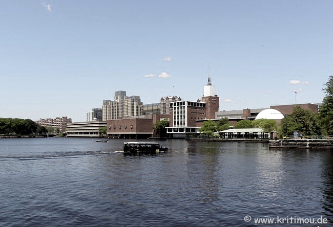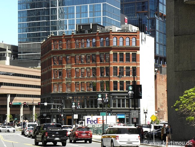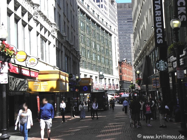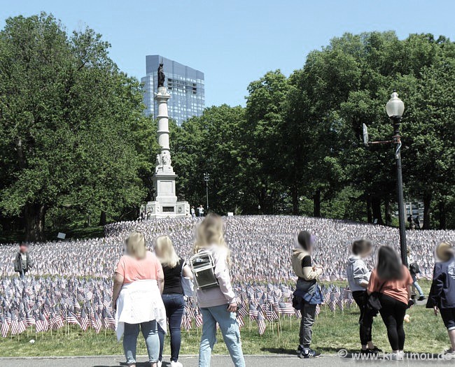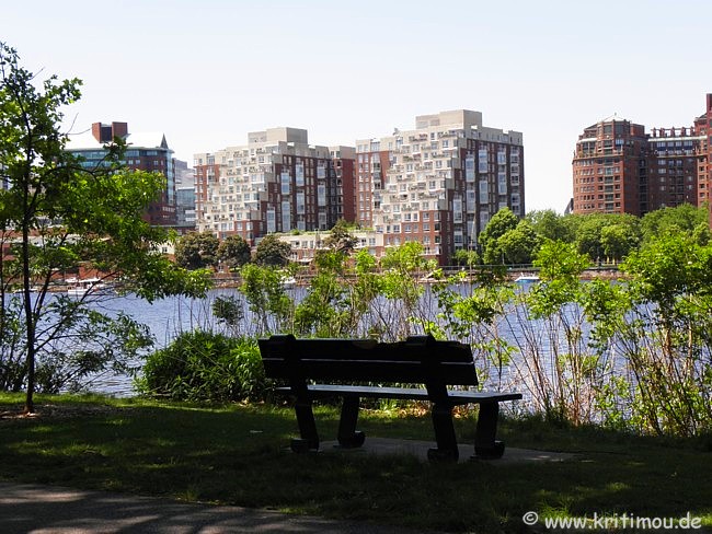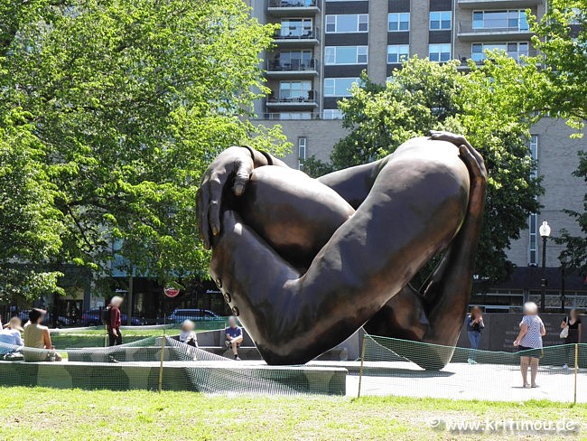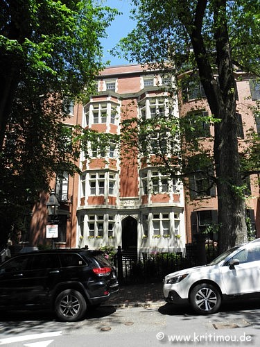 Mit der blauen U-Bahn-Linie fahren wir von Wonderland bis Gouvernment Center, von hier sind es mit der grünen Linie nur noch zwei Haltestellen bis Boylston Street. Doch für Ortsfremde ist es verwirrend, den richtigen der unübersichtlichen Zweige dieser Linie zu erwischen, wenn man die Endhaltestellen nicht kennt. Also heißt es sich durchzufragen, bis wir im richtigen Zug sitzen. Boston Common Park Direkt gegenüber dem U-Bahn-Ausgang Boylston Street liegt die grüne Lunge Bostons, der Common Park. Vom südöstlichen Zipfel aus betreten wir die Rasen- und Wiesenfläche, die sich im Morgenlicht unter den zahlreichen Bäumen ausbreitet. Bevor er 1830 als öffentlicher Park deklariert wurde, hatte er schon eine vielfältige Nutzung erfahren: seit der Stadtgründung über lange Zeit als Kuhweide, bis 1817 als Hinrichtungsort, als Militärlager, Mülldeponie, öffentlicher Rednerplatz und als Versammlungsort für Demonstrationen. An beiden Enden des Parks wurde zu unterschiedlichen Zeiten je ein Friedhof angelegt: der Central Burying Ground und der Granary Burying Ground. Im Laufe der Zeit hat man auch Denkmäler im Park installiert, die an herausragende Ereignisse und Personen erinnern sollen. Einige Kunstwerke und Statuen lohnen einen Abstecher, wie die aus Bronze gefertigte und im Januar 2023 enthüllte Skulptur The Embrace (Die Umarmung). Sie symbolisiert die Umarmung von Dr. Martin Luther King Jr. und seiner Ehefrau Coretta Scott King nach dem Erhalt des Friedensnobelpreises. In Sichtweite und exponiert steht seit über 100 Jahren der erhöhte Parkman Bandstand, ein Veranstaltungspavillon. Sogar der ehemalige Präsident, Barack Obama, hat im Jahr 2007 von dieser Stelle aus eine Wahlkampfrede gehalten - entsprechende Videos dazu gibt es bei YouTube. Den Park habe ich mir irgendwie größer vorgestellt, doch es dauert nicht lange, bis man ihn von einem Ende zum anderen durchschritten hat. Noch lassen mich längere schattige Passagen frösteln, doch später soll es laut Vorhersage noch richtig warm werden. Die ersten Limonaden-Verkäufer schleifen bereits ihre Utensilien für ihre rotbeschirmten Stände heran. Auf einer Parkbank, am Fuße des Beacon Hill, genießen wir die ersten wärmenden Sonnenstrahlen, als eine große Reisegruppe mitsamt verkleideter Führung neben uns Aufstellung nimmt. Ein paar Informationen schnappen wir auf, dann sind sie auch schon weitergezogen. Hinweise gab es unter anderem auf das Gebäude mit der Goldkuppel hinter uns, das Massachusetts State House (1798). Der Regierungs- und Gerichtssitz befindet sich an der höchsten Stelle des Stadtteils Beacon Hill, den wir jetzt besichtigen möchten. Beacon Hill Zu Beginn der Erschließung, ab dem 19. Jahrhundert, gehörte Beacon Hill dem sehr reichen und einflussreichen Geschäftsmann und Politiker Harrison Gray Otis, der den Architekten Charles Bulfinch mit der Errichtung von Herrenhäusern in diesem Stadtteil beauftragte. Schon sehr bald danach entstanden auch die ersten Reihenhäuser, die mehr Menschen Platz zum Wohnen boten. In der schönen und gepflegten Wohngegend lebten fortan die gut betuchten Stadtbewohner. Und so scheint es auch heute noch zu sein. Politiker, wie John F. Kennedy und John Kerry, Dichter wie Robert Frost, der Architekt Charles Bulfinch, zeitgenössische Künstler, wie Carly Simon und Uma Thurman, und viele andere haben sich diesen Stadtteil als Wohnsitz ausgesucht. Beacon Hill hat sich seinen diskreten Charme von Wohlstand bis heute bewahrt. Auch die Reihenhäuser lassen nicht erahnen, ob in ihnen jemals weniger gut situierte Bewohner gelebt hätten. An der Mount Vernon Street biegen wir nach rechts ab. Dort steht oberhalb das Nichols House Museum. Erbaut im Jahr 1804, wurde es vom Arzt Dr. Arthur Nichols 1885 erworben. Mit seiner Familie bewohnte er das feine Haus, das von Generation zu Generation immer weiter vererbt wurde. Neben den sehenswerten Gebäuden sticht eines an der Ecke Hancock Street/Myrtle Street besonders heraus. Es wurde in den 1870er Jahren im ägyptischen Revival-Stil gebaut, scheint zurzeit aber unbewohnt zu sein. Wir folgen jetzt der Hancock Street bis zur breiten Cambridge Street und verlassen den Beacon-Hill-Bezirk über die Stanfort Street. Gleich ändert sich die charakteristische rote Klinkerarchitektur des 19. Jahrhunderts hin zu den gewohnt kalten und funktionalen Gebäuden der heutigen Zeit. Umgeben und durchzogen von breiten, viel befahrenen Straßen gehört das Westend mit seinen Parkhäusern, Geschäftsläden, Hotels, Restaurants und Diners nicht zu meinen Lieblingsvierteln in der Stadt. So manche Fassade deutet aber noch darauf hin, dass die Architektur auch hier vielleicht einmal eine andere war. Am großen Krankenhauskomplex des Massachusetts General Hospital angelangt, erreichen wir wieder einen größeren Wohnbezirk. Kreuz und quer geht es für uns ohne bestimmte Richtung weiter, bis wir schließlich am sechsspurigen Storrow Drive landen. Unser nächstes Ziel ist die Charles River Esplanade, ein schmaler Grünstreifen in Ufernähe, am westlichen Fuße des Beacon Hill. Es bleibt uns nichts anderes übrig, schnellen Fußes an der lauten Straße bis zur Arthur Fiedler Fußgängerbrücke entlangzueilen. Andere Möglichkeiten, die Stadtautobahn zu überqueren, gibt es in der Nähe nämlich nicht. Sobald wir die Straße hinter uns gelassen haben, wird es augenblicklich ruhiger. Jogger und Radfahrer nutzen den schmalen Weg durch den langgezogenen, grünen Park. Der 130 Kilometer lange Charles River, der im Hafenbecken bald auf den Mystic River trifft, hat sich an dieser Mündungsstelle verbreitert. Auf einer Bank sitzend verschnaufen wir ein wenig vom Großstadtlärm und schauen auf die Silhouette von Cambridge, jenseits des Flusses. Auch diese Stadt ist sicherlich eine Besichtigung wert. Für uns wäre schon ein Spaziergang über den Campus der Harvard University von Interesse. Wer an dieser privaten Elite-Uni studieren kann, dem stehen alle Türen offen. Ich verm