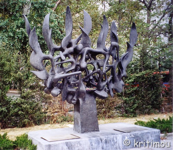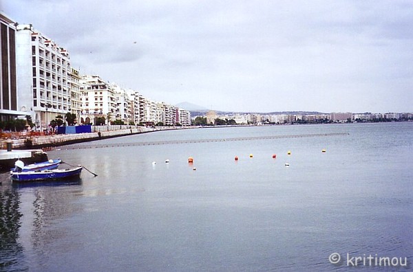 Der alte Hafen ist wie ausgestorben. Ein Wachmann klärt uns lässig darüber auf, dass uns der Hafen bis zum Pier 10 offen steht. Fotografieren: Oxi! Wir gelangen schnell zur alten Wartehalle. Ab hier fuhren Passagiere einst in alle Welt. An der Rückseite des Gebäudes, das nicht zugänglich und durch ein Gitter abgesperrt ist, stellen wir uns vor, wo man damals auf den noch vorhandenen Sitzbänken auf sein Schiff wartete, rauchend, redend, in Erwartung einer (längeren) Seereise und auf gutes Wetter hoffend, so wie wir, denn der Himmel bewölkt sich zusehends. Ein paar Schlenker über das Kopfsteinpflaster der Hafengassen, dann wieder aus dem Hafengelände heraus, gelangen wir zur ebenfalls nicht zugänglichen Vorderseite der großen Wartehalle. ![]() Nach einer Weile traben wir entlang einer breiten, unromantischen Autostraße in Richtung Aristotelesplatz und genießen Ausblicke über einen Teil der weit ausladenden Hafenfront der Stadt. ![]() Unweit der Platía entdecken wir ein Denkmal, das den jüdischen Bürgern der Stadt gewidmet ist, die dem Holocaust zum Opfer fielen. Eine Tafel wurde anlässlich des ersten Staatsbesuches des israelischen Präsidenten, Moshe Katsav, am 16. Februar 2006 angebracht. ![]()
