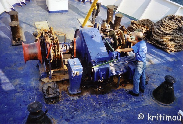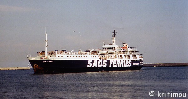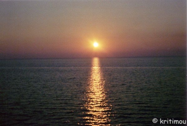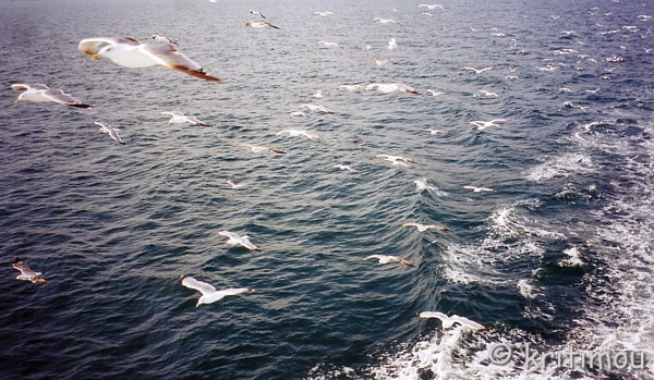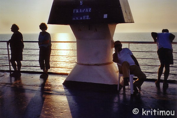Einige Schlepper haben festgemacht, von einem scharfen Hund bewacht. Mit dem ist nicht zu spaßen, so dass wir auf Abstand bleiben. Aus einiger Entfernung bestaunen wir die technischen Finessen und stellen uns vor, mit welcher Power diese verhältnismäßig klein wirkenden Schiffe bei hoher See ihren Dienst versehen. Einige Leute sitzen in der Nähe auf dem Betonboden und halten ihre mit Ködern gespickten Leinen ins Wasser. Noch hat niemand einen größeren Fang gemacht, doch zumindest jede Menge kleiner Fische sind im Wasser zu sehen. Nach diesem schon wieder schweißtreibenden Spaziergang begeben wir uns wieder in die Taverne und nehmen draußen Platz. Herrlich, hier zu sitzen. Es gibt keine augenfälligen Besonderheiten, mit denen der Kunde hierher gelockt würde. Doch die Taverne läuft sogar sehr gut, vermuten wir. Das Essen ist gut und die Lage.... ganz alleine dort, weg vom Lärm, die gelassene und wohltuende Atmosphäre einer ganz normalen Hafentaverne. So einige Stunden verbringen wir hier, ein richtig gutes Plätzchen. Später beschließen wir, noch einen kleinen Spaziergang hinaus bis zur Spitze der Mole zu machen. Etliche Leute sind hier am Fischen, Freizeitbeschäftigung. An einer Stelle, auf der Rückseite der Mole, im offenen Meer, wird auch gebadet. Immer noch ist es sehr heiß. Durch die Mauer, die die Mole meerwärts begrenzt, wird jegliche Brise abgehalten. ![]() Unsere Fähre, die Nona Mary, hat schon Kurs auf die Hafeneinfahrt genommen. Es wird jedoch noch eine Weile dauern, bis wir an Bord können, denn das Schiff wird im Hafen wenden, ein langwieriges Manöver. So wie es aussieht, sind viele Menschen an Bord, die ja auch erst einmal das Schiff verlassen müssen. Gemütlich schlendern wir also zurück zum Lokal, holen unser Gepäck ab und stellen uns an der Anlegestelle zu den anderen wartenden Fahrgästen. ![]() Viele Mitreisende stehen bereits in den Startlöchern, um den Run auf die besten Plätze auf der Fähre zu eröffnen. Konkurrenzdenken hat sich breitgemacht. Jeder will offensichtlich der erste sein, und so schiebt sich die Masse langsam, aber unaufhaltsam, in Richtung Betonkante, dorthin, wo die eiserne Rückklappe der Fähre aufschlagen wird. Kaum hat das Schiff angelegt, strömen schon die ersten Passagiere hinein und behindern natürlich alle, die heraus wollen, was ein wütendes Gepfeife der Verantwortlichen nach sich zieht. Allein - der Krach verhallt, kein Mensch kümmert sich darum, ein einzigartiges Chaos von Menschen, die in beide Richtungen strömen und Autos, die irgendwie dazwischen das Schiff verlassen, ist entstanden. Wir lassen uns mittreiben in diesem Gewühl, finden auf dem Parkdeck, gleich am Eingang eine Gepäckaufbewahrung für die schweren Teile. Einen tollen Platz bekommen wir ganz locker oben auf Deck, in einer der vorderen Reihen. Ganz schön voll wird der Kahn. Wie vermutet möchten viele Menschen die Feiertage auf Samothráki verbringen. Die Mischung ist ganz bunt und reicht von griechischen und ausländischen Freaks, in bunten, auffallenden Gewändern, bis hin zu griechischen Familien und Rentnern. Wir freuen uns schon sehr auf die drei- bis vierstündige Fahrt, endlich Wasser unter dem Kiel zu haben. Noch vor dem Ablegen strömen etliche Leute bis nach vorne zum Bug und schauen den Matrosen beim Ankerhieven zu. ![]() Die Prozedur dauert eine ganze Weile, dann verlassen wir den Hafen. Das Wetter ist famos und die Hitze auf offener See durch eine leichte Brise wesentlich erträglicher geworden. ![]() Langsam wird die Skyline von Alex/Poli immer kleiner. Wir halten Ausschau nach Begleitern der Fähre. Delphine sind nicht zu sehen, dafür aber jede Menge Möwen, die sich mit Kampfgeschrei auf jeden Krümel stürzen, der von den Touristen über Bord geworfen wird, wendige Flieger, die diese Ritual gut zu kennen scheinen. ![]() Nach einer Weile erkennen wir die Insel. Aus einem Dunstschleier, der sich wie ein Ring um ihren Fuß gelegt hat, erhebt sie sich aus dem Wasser bis auf über 1600 Meter Höhe. Details sind erst viel später zu erkennen, als wir schon fast angekommen sind. Einige grüne Flecken auf der Nordseite, von der aus wir uns annähern. Mir wird der Mund wässrig gemacht, ich bin sehr gespannt. Wir wollen in Thérma absteigen, und erst jetzt wird mir bewusst, dass der Ort nicht direkt am Meer liegt. Lass` dich überraschen, höre ich immer wieder. Na gut. Bin gespannt wie ein Flitzebogen. ![]() Vorfreude macht sich breit. Mittlerweile ist etwas mehr Wind aufgekommen, noch besser! Kinder und Hunde spielen ausgelassen auf diesem vorderen, freien Teil des Decks, auf dem sich nun stehend viele Menschen eingefunden haben, um die Szenerie zu genießen. ![]() Mit Sonnenuntergang werden wir in Kamariótissa, dem Hafen von Samothráki einlaufen. Weitere romantische Fotos werden gemacht in diesem wundervollen ägäischen Abendlicht, das die Welt in Frieden und Wohlgefühl hüllt. ![]() Ankunft in Samothráki Beim Anlegen in Kamariótissa ist es schon fast dunkel geworden. Die Reisenden, die an Land warten, sind genauso bekloppt, wie wir in Alex/Poli und schicken sich gerade an, dasselbe Chaos zu verursachen, als ein Mann sich vor der Meute aufbaut und sie minutenlang bedrohlich anbrüllt. Das wirkt, und so können wir doch recht zügig von Bord, bahnen uns einen Weg quer durch den Hafen und finden die Bushaltestelle. Um 20.45 Uhr soll ein Bus nach Thérma fahren, das dauert nicht mehr lange. Auch ein paar andere Reisende haben sich eingefunden. Wir warten, nehmen die vielen Menschen und Autos wahr, und hoffen, dass es in Thérma nicht so voll sein möge. Nach der Beschaulichkeit von Fanári ist das hier ein wahres Kontrastprogramm an Gewusel und Lautstärke.