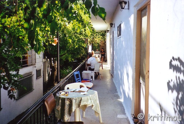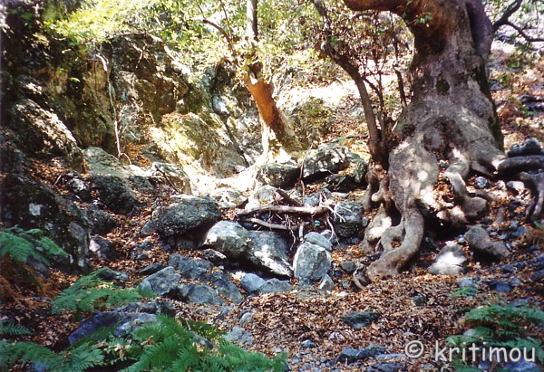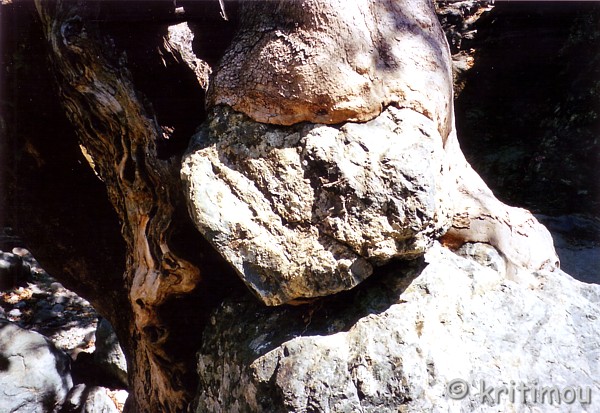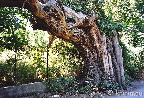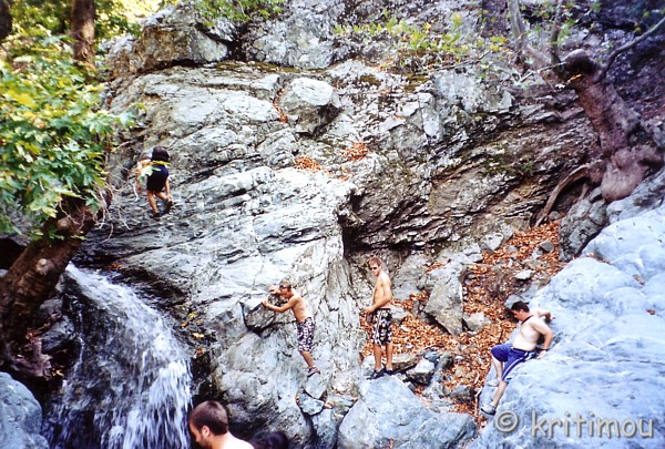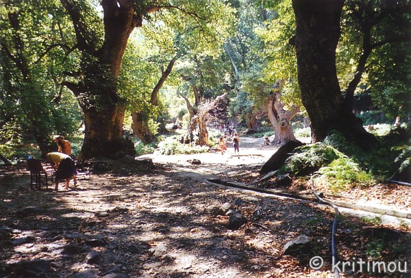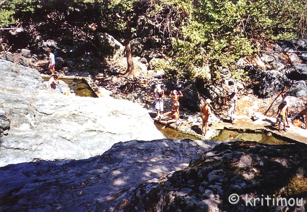 Durch den Platanenwald zu den Becken ("Wáthres") Gegenüber der Obstauslage des Minimarktes biegen wir in die Dorfgasse ein, die nach einer weiteren Linkskurve an der Bäckerei vorbei führt, und der wir im weiteren Verlauf folgen. Privathäuser und Tavernen säumen den Weg, doch zur Mittagsstunde sind die meisten Menschen noch nicht auf Essen eingestellt. Aus einem der Lokale an dem Weg, in den wir eingebogen sind, erklingt ein Lied, gesungen von Pantelís Thalassinós. Das gefällt mir gut und stellt uns in Aussicht, einmal bei Musik dieses von uns verehrten Künstlers zu speisen. In der Mittagshitze schwitzend gehen wir nun leicht bergan. Am Straßenrand tauchen immer häufiger Bäume mit enormem Umfang auf. ![]() Gleich hinter dem letzten Haus beginnt dann der Wald mit den uralten Platanen, knorrig, dick. Ein ausladender Platz, in den der Wind mit Sicherheit manchmal stürmisch hineinpfeift, bildet den Waldeingang. Wir sind sehr beeindruckt von den Ausmaßen der Bäume. In anderen Orten ist man "stolz" auf EINEN dieser Riesen, wie z.B. in Tsangaráda auf der Halbinsel Pílion oder auf dem zentralen Platz der Nekropole von Argiroúpolis auf Kreta. Hier, bei Thérma, findet man diese mächtigen Kolosse gleich dutzendweise. ![]() Einige Schmuckverkäufer haben hier am Waldeingang ihre Stände aufgeschlagen, gleich gegenüber den örtlichen Trinkwasserbehältern. Immer wieder bleiben wir ehrfürchtig staunend vor den vielen jahrhundertealten Platanen stehen. Die Äste vieler Bäume sind abgebrochen, wie tiefe Wunden in den Stämmen erzählen sie uralte Geschichten. Eine Platane steht auf Wurzelstelzen, dicker als Elefantenbeine mitten im trockenen Bachbett. Eine andere hat riesige Ausstülpungen am Stamm, in die Felsstücke mit Wucht hineingerammt wurden. Wie eine Märchenfigur, nimmt sich dieses Bild aus, eine Riesenechse, die den Stein im Mund festhält und sich in der nächsten Sekunde blitzschnell herumdreht, um ihn wegzuschleudern. ![]() Das Wurzelwerk einer weiteren Platane gleicht den Tentakeln eines Riesenkraken, die sich mit aller Macht in der Erde festkrallen. Urgewaltige Bilder in einem uralten Wald, dessen Faszination von der Ehrwürdigkeit seiner Bewohner herrührt. ![]() Ein Bach fließt durch einen schmalen Kanal, der von einem Pfad gesäumt wird und sich bergan schlängelt und dem wir folgen. Nach wenigen hundert Metern erreichen wir das erste Becken ("Wáthra"), in dem sich viele Menschen tummeln; eine von der Natur über tausende von Jahren hinweg gehöhlte Gesteinskuhle, die nur leicht von Menschenhand an den Rändern befestigt wurde, um von hier das Wasser durch den schmalen Kanal bergab zu leiten, lädt zur Abkühlung förmlich ein. Mehrere solcher Becken hat der Fluss von der Quelle, hoch oben in den Bergen, geschaffen, die jedoch nur schwer zu erreichen sind. ![]() Hinter dem ersten Becken suchen wir uns zunächst ein Plätzchen am Bach auf einem riesigen Stein, um etwas auszuruhen und die Füße ins Wasser zu halten. Ein friedlicher Ort, das Plätschern übertönt jedes menschliche Geräusch. Wir befinden uns nun in einer Schlucht, durch die sich das Wasser seinen Lauf sucht. Gerne möchte ich das Flussbett einmal im Winter oder Frühjahr sehen, bestimmt donnert dann das überschäumende Wasser mit ohrenbetäubendem Getöse herunter. Hier ist es wunderbar kühl, und die Stimmung am klaren und sauberen Wasser entschädigt uns für die Unannehmlichkeiten. Zum Weitergehen bzw. -klettern wäre jetzt gutes Schuhwerk angebracht, um auf den Steinen und den recht glatten Felshängen einen einigermaßen guten Halt zu haben. Doch fast alle sind mit Sandalen oder Badelatschen unterwegs, da man ständig mit Wasser in Berührung kommt. Nur ein paar Meter hinter dem ersten Becken befindet sich eine Senke mit mehreren Metern Durchmessern, in der das Wasser fast mannshoch steht. Jeder versucht, seine Sachen halbwegs trocken ans andere Ufer hinüber zu bringen und selbst möglichst nicht in das tiefe Wasser zu geraten, denn es ist SEHR kalt. Eine Möglichkeit bietet sich an der linken Seite der Wasserkuhle, doch die Felsen unter Wasser sind so glitschig, dass jeder, der diesen Weg versucht, automatisch im Wasser untertauchen wird - auch mit Kleidern. Nachdem wir uns amüsiert die halbherzigen oder auch wagemutigen Versuche angeschaut haben, um durch diese Senke zu kommen, müssen wir feststellen, dass es uns nicht erspart bleibt, uns bis auf die Badesachen auszuziehen, um uns ins Becken hineinzuwagen und nun unsererseits zum Amüsement der anderen Beobachter beizutragen. Es kommt, wie es kommen muss: Beide geraten wir in die tiefste Stelle, wo das Wasser fast bis zu den Schultern reicht und uns eine sehr erfrischende Abkühlung verschafft. Immerhin bleiben die Kleider und der kleine Rucksack (über dem Kopf) trocken. Der weitere Weg gestaltet sich als Kletterpartie. Rechts des Flusslaufes kann man sich auf glatten Felsen kaum festhalten, nur einige Vorsprünge helfen dabei, sich nach oben zu katapultieren. Belohnt wird man mit dem Blick auf ein weiteres Becken, in das sich ein schmaler Wasserfall aus einigen Metern Höhe ergießt. Eine "Massagedusche" unter dem Wasserfall ist auf jeden Fall zu empfehlen, doch uns kommt es vor, als ob das Wasser noch kälter ist als in den Becken vorher. Auf einem Handtuch machen wir es uns bequem und beobachten, wie sich die Leute ihren Weg weiter nach oben, am Wasserfall entlang suchen. ![]() Uns ist es zu gefährlich, ohne rutschfeste Schuhe weiterzuklettern. Nichts ist gesichert, betreten auf eigene Gefahr. Aber gerade das macht wohl den Reiz aus. Man berät sich über den besten Weg und hilft sich über Klippen und Abgründe hinweg. Bergan mag es noch nicht so schwer sein, doch die andere Richtung, wenn die Beine schon müde und zittrig sind, bietet eine andere Perspektive, nämlich die nach unten, die vielen nicht so geheuer vorkommt und die Hilfestellung der Mitwanderer erforderlich macht. Ein junger Mann klebt mit weit gespreizten Armen un