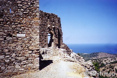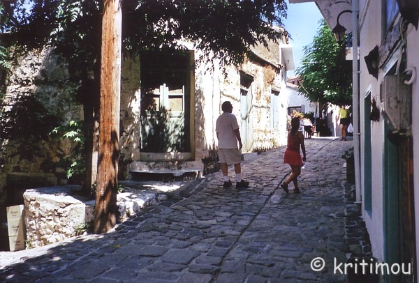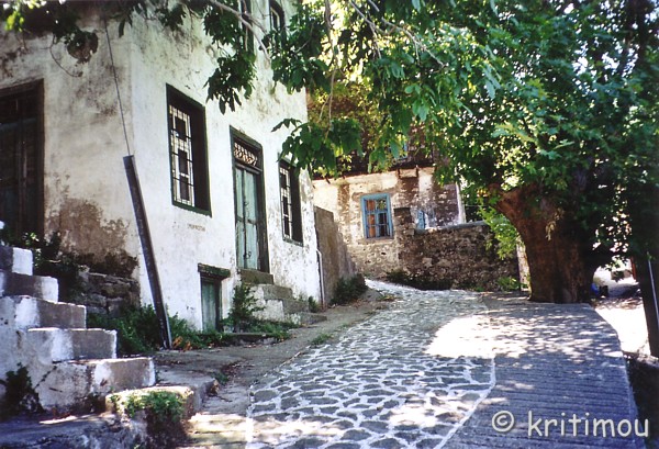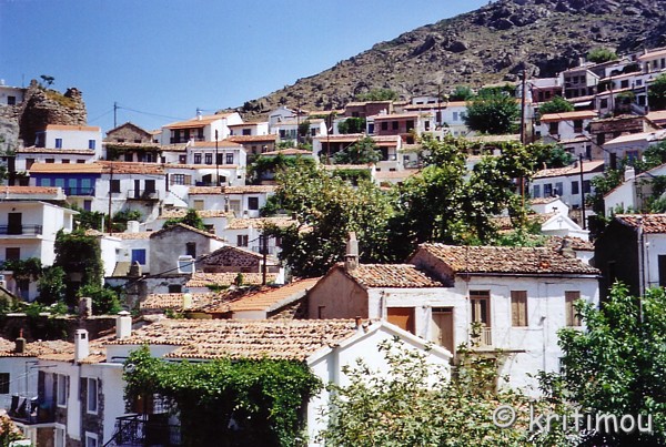 Um die Insel zu erkunden, möchten wir uns auf jeden Fall für einige Tage einen fahrbaren Untersatz besorgen. In Kamariótissa gibt es mehrere Motorrad-/Moped-/Autoverleiher. Einer befindet sich direkt an der Hafenstraße, der andere in einer Seitenstraße in Richtung Chóra. Folgt man dieser Straße, gelangt man auch zur einzigen Tankstelle der Insel. Wir entscheiden uns für ein Papáki, einem Moped mit halbautomatischer Schaltung (d.h. ohne Kupplung), mit dem wir zunächst einmal hoch zum Hauptort der Insel, Chóra oder auch Samothráki genannt, fahren möchten. In das Dorf, das ca. vier Kilometer von der Küste entfernt gelegen ist, zogen sich vor vielen Jahrhunderten die Menschen zurück, um den ständigen Angriffen durch Piraten zu entgehen. Schon von weitem erkennt man, inwieweit man hier tatsächlich Schutz finden konnte, denn der Ort liegt auf einigen hundert Metern Höhe, mit der Burgruine der Genueser Herrscherfamilie Gattilusi aus dem 15. Jahrhundert auf der Spitze. Wehrtürme in anderen Teilen der Insel, die sogenannten "Gattilusitürme", zeugen von weiterer Bautätigkeit der Genueser. In sehr gemächlichem Tempo quält sich das Moped mit uns zwei den Hang hinauf. Die Suche nach dem richtigen Gang wird jedes Mal mit einem "ACHTUNG, ICH SCHALTE JETZT!" laut angekündigt. Das bedeutet für den Sozius "Festhalten", denn entweder wird man energisch nach vorn katapultiert oder man läuft Gefahr, nach hinten abgeworfen zu werden. Außerdem unterscheidet es vom Fahrverhalten her wenig zwischen dem zweiten und dritten Gang. Und doch macht es Spaß, mit dieser Schleuder durch Sonne und Wind zu knattern. Mit Schwung nehmen wir die Kurve am Eingang von Chóra und ötteln in Richtung Ortsmitte durch die schmalen Gassen steil bergan. Auf einer winzigen Platía, wo ein paar Leute im Schatten sitzen und Getränke zu sich nehmen, stellen wir unser Moped ab. Für Autos ist dies jedoch nicht zu empfehlen, besser hält man noch vor dem Ortseingang, da die Straßen sehr eng und verwinkelt sind. ![]() Gemütliche Cafés und Lokale an den engen, gepflasterten Sträßchen laden zum schattigen Verweilen ein. Betritt man die obligatorische Terrasse, richtet sich der Blick komplett ins Freie. Die Häuser sind alle mit roten Ziegeln gedeckt, von denen die älteren mit Steinen beschwert sind, was vermuten lässt, dass der Wind hier gelegentlich ordentlich pfeift. ![]() Wir durchstreifen den seit 1978 unter Denkmalschutz stehenden Ort, steigen immer höher, auch durch die Hintergassen, bestaunen den alten Backofen einer über hundert Jahre alten Bäckerei, sehen, wo schon überall gewerkelt wurde, um die zumeist zweistöckigen Häuser zu modernisieren, erkennen aber auch noch etliche Ruinen. Die ruhige Atmosphäre des Ortes wirkt sehr entspannend.