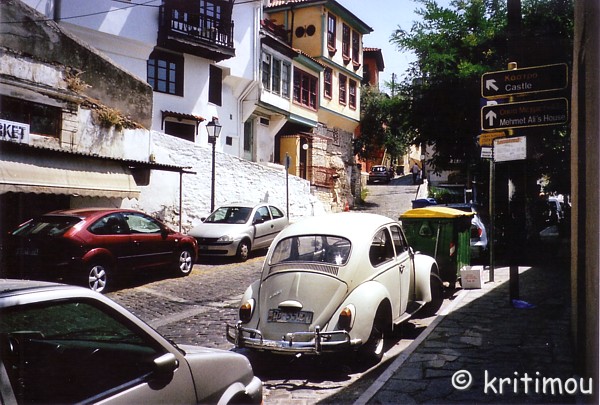 Sieben Jahre an Überzeugungsarbeit waren notwendig, um einen Pachtvertrag und die Genehmigung zur Restaurierung zu erhalten, denn sowohl die ägyptischen Eigentümer als auch die griechischen Behörden hatten ihr Augenmerk eher auf andere Objekte gerichtet als auf diese Anlage in Kavála, die von dem in dieser Stadt geborenen Mohamed Ali Pasha, Vizekönig von Ägypten, erbaut worden ist. Umso bemerkenswerter ist die Instandsetzung gelungen, in weniger als 2 Jahren, wie man liest. Das Hotel wird der europäischen Spitzenklasse zugerechnet. Mittlerweile gibt es ein ägyptisch-griechisches Abkommen zur Dokumentation des ägyptischen Erbes von Mohamed Ali in Griechenland und Ägypten, das im Mai 2007 in Kavála unterzeichnet worden ist. Durch enge Gassen, mit vielen sehr schönen, alten Häusern, gehen wir weiter den Hügel hinauf. Immer wieder suchen wir den Schatten. Unser Ziel ist das "Haus des Mohamed Ali Pascha". Das orientalische Flair wird zwischendurch von Provokationen unterbrochen, wie einem schreiend-bunt angestrichenen Wohnhaus oder anderen sonderbaren Details. ![]() Vor uns stapft ein Paar ebenfalls bergan, der Tempopack und der Labello in der Außentasche des kleinen Rucksacks identifizieren sie als Deutsche. Auch sie schwitzen. Hier oben haben vermutlich die engsten Vertrauten von Mohamed Ali Pascha, Offiziere, Politiker und Verbindungsleute in stattlichen, zweigeschossigen Häusern gewohnt. Viele kleine Details lassen diese Zeit auferstehen, z.B. Inschriften in arabischer Sprache, verwinkelte enge Gassen, kleine Innenhöfe, die heute offen einsehbar sind. Es gibt nur wenige, die noch von einer langen, hohen Mauer eingeschlossen sind. Irgendwann erkennen wir das "Haus des Mohamed Ali Pascha“, auf das als Restaurant auf der Interseite des Imaret-Hotels hingewiesen wird. Alles ist abgeschlossen, nur aus gebührendem Abstand kann man die architektonischen Details bewundern. Dafür prangt ein Denkmal auf einem kleinen Platz neben dem Haus. Uns faszinieren vor allem der Schatten eines Baumes und eine Bank, auf der wir uns erst einmal niederlassen. Von hier hat man eine fantastische Sicht bis hinüber zur Insel Thássos mit ihren davor installierten Bohrtürmen im Dunst. Der Panoramablick ist wirklich grandios. Zu unseren Füßen liegt der Hafen, die schmucke Neustadt Kaválas zu unserer Rechten reflektiert das Sonnenlicht in unterschiedlichen Schattierungen. ![]()