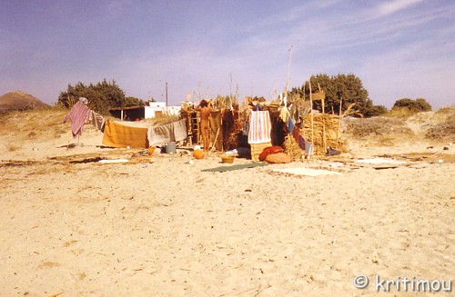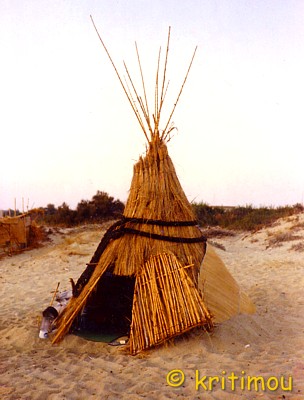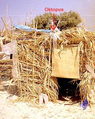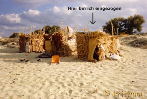 Mein Zelt war also als Unterkunft nicht mehr geeignet. Schade, es wäre wasserdicht gewesen. Doch einige Hütten standen leer, und so bezog ich die Eckhütte einer Reihenhüttensiedlung aus drei Würfeln mit Flachdächern. Sie bedurfte einer dringenden Ausbesserung. Meine direkten Nachbarn halfen mir dabei, mit dem bereits geschnittenen und nicht weggewehten Bambus das Hüttengerüst etwas solider zu gestalten. Pappe wurde als Sandschutz zwischen die Stäbe am unteren Ende gesteckt, Badematten halfen ebenfalls, die Sandmassen draußen zu halten und gewährten auch Schutz vor Nässe. ![]() In der Hütte befand sich ein winziger „Tisch“, ebenfalls aus Bambus gefertigt. Was man aus diesem Naturprodukt nicht alles herstellen konnte. Und an diesem Strand hatte es echte Künstler gegeben. Windspiele ließen ihr dumpfes Plock-Plock-Plock ertönen. Übriggebliebene Zeltstangen wurden von Jim, meinem nächsten Nachbarn, auf einem eigens angefertigten Bambusgestell aufgehängt. Ein neu kreiertes Musikinstrument. Jemand hatte eine Gitarre dabei. Abends am Feuer gab es nach dem Essen Musik. Amit aus Israel, der erst kürzlich angereist war, hatte eine Congatrommel mitgebracht. Mit Bambusstangen erzeugten wir unterschiedliche Rhythmus-Geräusche. Wir verstanden uns gut, erzählten von unseren Reiseträumen. Am liebsten wären wir um die ganze Welt gefahren. Mit fortschreitendem Herbst regnete es immer häufiger, insbesondere nachts. Nicht selten rissen uns dicke Tropfen aus dem Schlaf, denn unsere Hütten waren alles andere als wasserdicht. Fluchtartig stürmten wir dann nur mit dem Notwendigsten, Papiere und Schlafsack, davon, um in einem in der Nähe gelegenen Rohbau Unterschlupf zu finden. Ein Bauer hatte dort zusammengebundene Strohballen deponiert, die uns sehr willkommen waren und als Schlafunterlage benutzt wurden. Eines frühen Morgens stand der Bauer im Rohbau und jagte uns davon. Die Rindviecher würden das Stroh nicht mehr fressen, wenn wir darauf herumschliefen, meinte er. In der darauffolgenden Nacht waren wir wieder da, wo sollten wir auch hin in der Finsternis und bei strömendem Regen? Wieder erschienen Leute, ich war viel zu schlaftrunken und müde, um genau mitzubekommen, was los war. Wir hörten Vieh brüllen, ein greller Scheinwerfer leuchtete irgendwo in unmittelbarer Nähe unserer Unterkunft. In Erwartung eines erneuten Rauswurfs und durch vielfältiges Rufen irgendwelcher Leute da draußen war an Schlaf nicht mehr zu denken. Langsam graute auch schon der Tag. Wir stapelten die Strohballen wieder aufeinander und begaben uns zurück zu unseren Hütten, um die Einrichtung zu trocknen. Dieselbe Prozedur wie fast jeden Morgen, alle Gegenstände aus der Hütte herausräumen und in die Sonne hängen und legen, das große Badetuch an die Leine, ebenso die meisten Kleidungsstücke, die Wolldecke über das Hüttendach geworfen. ![]() Wir waren noch alle mit diesen Aufräumarbeiten beschäftigt, als es nicht weit von uns entfernt heftigst und laut schwäbelte: „.....die haben doch erzählt, dass es hier Zigeuner am Strand gibt, das hier, das müssen sie sein.....“, und zeigte schamlos mit einem nackten Finger auf uns. Augenscheinlich handelte es sich um ein deutsches Touristenpaar, das von der Chóra aus hierher nach Agia Anna spaziert war und sich solch ein einfaches Strand-Leben im Traum nicht ausmalen konnte. Wir müssen sehr exotisch gewirkt haben. Bald war uns nach einem warmen Getränk, das wir in der einzigen noch geöffneten Taverne einnehmen wollten. Da saß unser Landwirt aus dem Rohbau. Dem Alkohol, hatte er schon reichlich zugesprochen und begrüßte uns auf das Herzlichste. Von nun an dürften wir JEDE Nacht, wann immer wir es wünschten, auf seinem Stroh nächtigen. Er lud uns sogar ein, uns an seinen Tisch zu setzen, und mit ihm zu feiern. Was war geschehen? Eine seiner Kühe hatte in der Nacht gekalbt, daher auch der Auflauf und das Getöse! Ein gesundes Kälbchen, alles sei gut gegangen, wir hätten ihm Glück gebracht. Zum guten Ende feierten wir gemeinsam die gelungene Geburt.