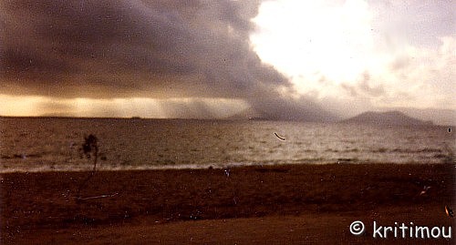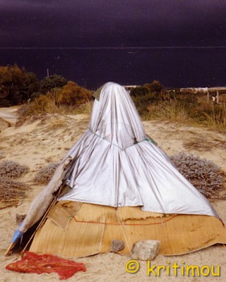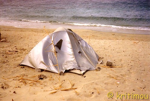 Der Sommer auf Náxos war nun unweigerlich vorbei. Mit dem ersten Herbsturm hatte sich die Uferlinie nach oben geschoben. In jener Sturmnacht mit Windgeschwindigkeiten, die mit bis zu 10 Beaufort beständig aus einer Richtung bliesen, war an Schlaf nicht zu denken gewesen. Die meisten Hüttenbewohner hatten tags darauf fluchtartig den Strand verlassen. Jetzt begann die wechselhafte Jahreszeit. Um mein Zelt herum waren alle Nachbarn abgereist, und so allein wollte ich am oberen Strandabschnitt doch nicht bleiben. Also raffte ich meine Sachen zusammen und fing an, alles strandabwärts in "belebtere" Gegenden zu transportieren. Zuletzt lag nur noch mein Rucksack im Zelt. Ich hatte nicht vor, das Zelt abzubauen, sondern das Iglu einfach so, wie es war, mitzunehmen und weiter unterhalb wieder im Sand zu verankern. Außerdem wollte ich einen Windschutz aus Bambus drumherum bauen. Da der Wind sich bis mittags wieder gelegt hatte, nahm ich meinen Rucksack aus dem Zelt, um diesen in die neue Wohngegend zu bringen. Gerade ein paar Meter hatte ich mich entfernt, als das Zelt plötzlich durch eine Böe empor gehoben wurde und zielgerichtet in Richtung Meer flog. Ich konnte überhaupt nichts tun, nur schauen. Ein aufmerksamer Strandspaziergänger hechtete ins Wasser und schnappte sich das Iglu gerade im Augenblick des Touch-Downs auf dem Wasser. Mit Triumpf im Blick überreichte er mir das Ding, ich war ihm sehr dankbar. Gerettet! Der Umzug konnte nun also beendet werden. Mittlerweile frischte der Wind wieder auf. Bambus musste geschnitten werden, und die Stangen sollten mit Wasser richtig fest um das Zelt herum in den Sand einzementiert werden. Ein paar Nachbarn halfen mit, doch es gelang uns nur, einige wenige Stangen halbwegs fest zu verankern. Ein paar Minuten später wurden sie einfach um- und davongeweht.