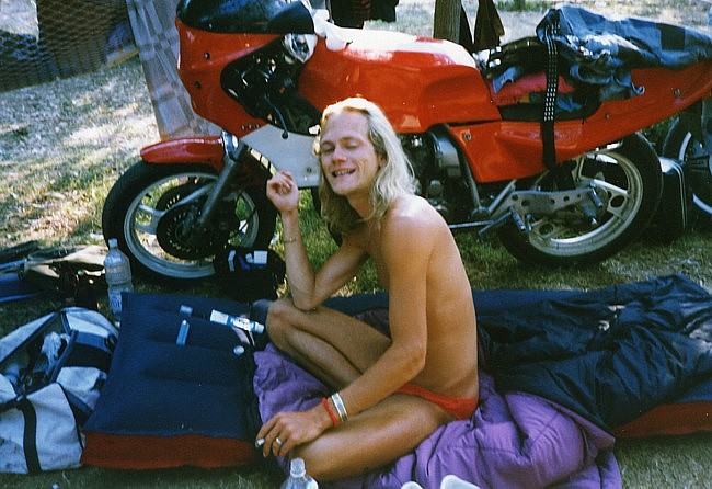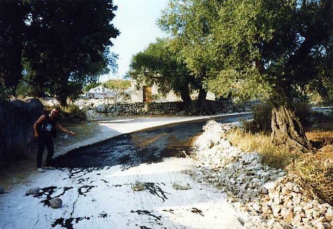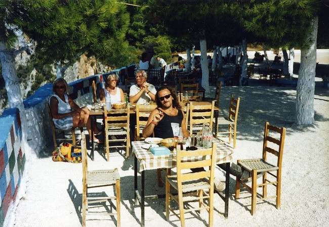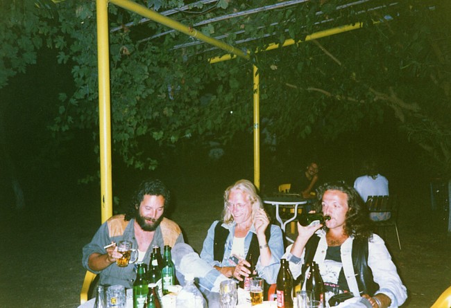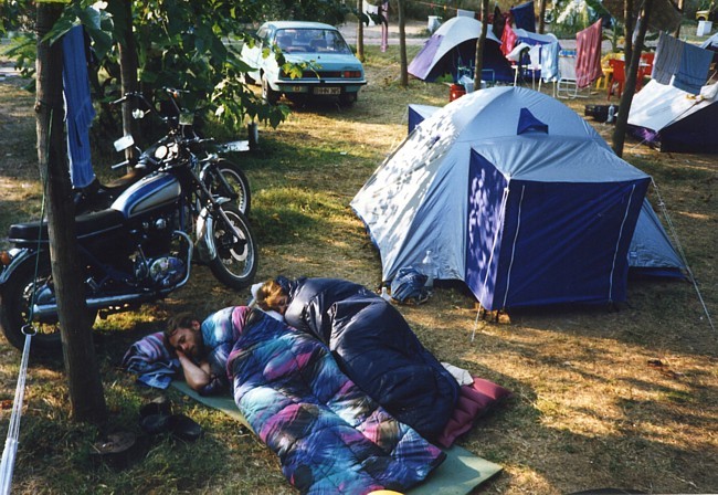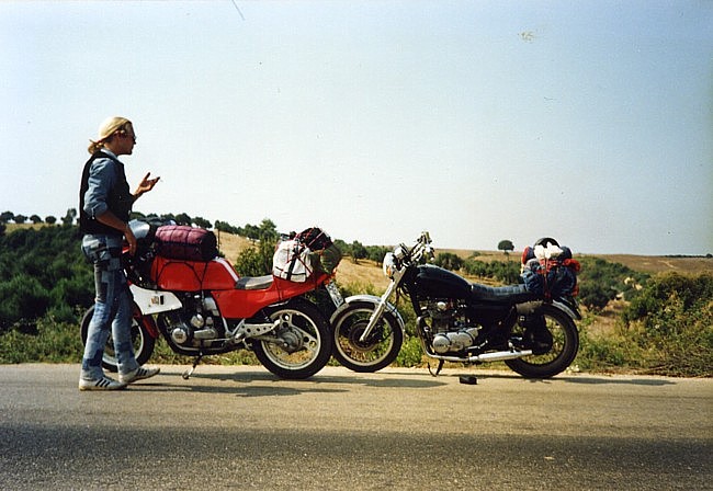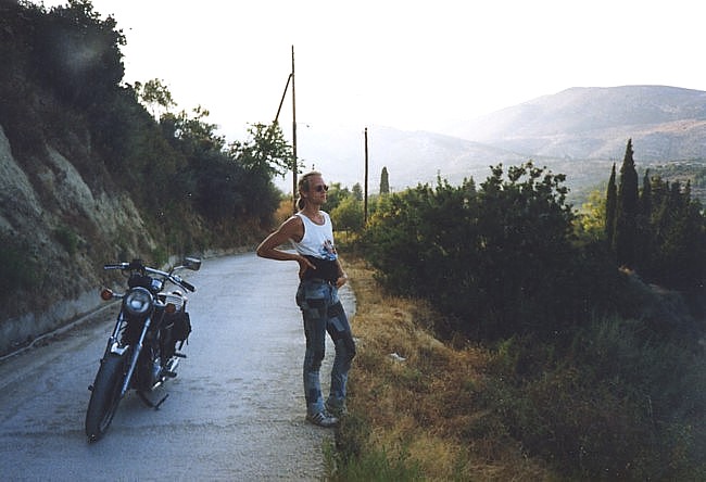 Mein Jahr 1991 begann wie 1990 endete – ich dachte pausenlos an Griechenland Kurz vor Weihnachten 1990 kaufte ich mir ein neues gebrauchtes Motorrad, eine XJ900. Sie war sportlich umgebaut, hatte noch keine 30tkm gelaufen und kostete beim Händler nur 4900,-DM. Bei solch einer Gelegenheit musste ich einfach zugreifen. Somit hatte ich schon mal den für mich perfekten fahrbaren Untersatz für den nächsten Urlaub. Eigentlich wäre ich gern ein weiteres Mal mit Ralf nach Griechenland gefahren, das scheiterte aber leider an Ralf´s damaligen finanziellen Möglichkeiten. Ich wäre daraufhin auch allein runter gefahren, es ergab sich aber, daß mein damaliger Freund und Schrauberkollege – wir teilten uns ab dem Herbst 1990 eine “Box” in einer Schraubergemeinschaft – auch Interesse an einem Motorrad-Urlaub in Griechenland zeigte. Ich erzählte ihm von der Fährfahrt mit Deckspassage, dem Land mit diesem traumhaften Licht, dem Fahren ohne Helm – und er war überzeugt, daß das genau das Richtige sei. Friedel (der eigentlich auch Michael heißt) und ich starteten die Saison ´91 zusammen Ende Februar. Es war seine erste Motorradsaison überhaupt und seine XS650 hatte einen von einer Firma überholten Motor. Wir spulten viele gemeinsame Kilometer ab, bis sein Motor verreckte... da er den Ölwechsel nicht in einer “Fachwerkstatt” hatte vornehmen lassen, verweigerte die Firma ihm die Garantie. Nun war guter Rat teuer, eine weitere Motorenüberholung konnte Friedel sich nicht leisten und so konnten wir nicht gemeinsam nach Griechenland. Im Mai erfuhr ich von einem Händler in Flensburg, der aus den USA importierte japanische Motorräder für ganz kleines Geld verkaufte. Da ich eh schon länger eine XS650 als Zweit- und Bastelmotorrad haben wollte wurde ich bei ihm fündig und griff kurzentschlossen zu – als Student ging sowas irgendwie. Und so hatten wir den Motor für den Griechenland-Urlaub. Zu meinem Geburtstag hatte ich den “Velbinger”, einen alternativen Reiseführer bekommen und verschlang ihn wie einen spannenden Roman – für mich war es ein spannender Roman. Zu meinem damaligen Lebenswandel passte es mittlerweile immer besser, daß ich mit Friedel zusammen fahren wollte. Wir wollten Ende August los fahren und dann erst Anfang Oktober wieder zurück sein, diesmal also deutlich länger als das Jahr zuvor. Anlaufstation sollte natürlich der Camping Tholo sein, von dort aus wollten wir viele Touren ins Landesinnere machen, sowie mehrtägige Ausflüge nach Githio und nach Zakynthos. Zur selben Zeit wollten auch Torsten und Petra, sowie Ruben und Susanne aus Braunschweig nach Griechenland. Wenn ich auch alle gern mochte war es mir doch wichtig, diesmal auf gar keinen Fall einen weiteren Gruppenurlaub zu machen, sondern legte Wert darauf, daß wir separat reisten. Der Sommer kam und ein paar unerwartete Ereignisse nahmen ihren Lauf, hatten aber nichts direkt mit unserem ersehnten Urlaub in Griechenland zu tun. Der Tag der Abfahrt rückte näher und näher, beide Motorräder liefen perfekt und ich konnte es kaum noch erwarten. Endlich war es soweit, das Wochenende um den 25ten August war gekommen. Am Samstag packten wir die Motorräder und wollten am Sonntag morgens gegen 7Uhr starten. Am Sonntag morgen schien die Sonne und irgendwie glitzerte alles – endlich ging es los. Wir fuhren von Anfang an nebeneinander, Friedel rechts und ich links, und da war sie wieder, diese grenzenlose Freiheit, die ich so lange vermisst hatte. Die Fahrt durch Deutschland lief völlig easy, Sonntags gibt es keinen nervigen LKW-Verkehr. In Kufstein angekommen war es wieder so, daß wir “eigentlich noch stundenlang hätten weiter fahren können”. Natürlich konnten wir nicht und fuhren zur Pension “Zum Bären”. Dort buchten wir ein Doppelzimmer für ~60,- DM, gingen kräftig Abendbrot essen und dann bald pennen. Am kommenden Morgen fuhren wir wieder im Sonnenschein weiter und schon am zweiten Tag war zu Hause so herrlich weit weg. Am Brenner tauschten wir kurz Geld, setzten uns dann ein wenig abseits, um die Alpen nicht nur unterm Helm zu sehen, um danach die herrlichen Autobahnkurven herunter zu swingen – wir waren so far out... Hinter Bologna bekam Friedel erste Konzentrationsschwächen – ich wunderte mich, wieso er langsam aber sicher in Richtung Standstreifen driftete und wir gingen erstmal einen doppelten Espresso trinken. Weiter ging die Fahrt, und das erste Schild “Ancona 179km” begrüßten wir mit erhobenem Zeigefinger am hoch erhobenen linken Arm. Das machten wir ab da bei jedem Ancona-Schild so. Als die Abfahrt Ancona Nord kam reckte ich beide Arme in den Himmel und stand in den Fußrasten, auf diesen Moment hatte ich mich riesig gefreut. Torsten sagte mal zu uns, dass Italien das Land sei, das man am besten schnell durchquert um zur Fähre nach Griechenland zu kommen. Ich hingegen fand Italien ein schönes Land – aber auch nur, weil von dort die Fähre nach Griechenland fährt. Ich hatte mich vorher schlau gemacht, welche Fähre wann ausläuft und so nahmen wir wie geplant die Ionian Galaxy der Strintzis Lines. Wie schon auf der Hinfahrt buchten auch wir diesmal nur One-Way, wußten wir doch nicht genau, wann wir wieder zurück fahren würden. Die Ionian Galaxy hatte damals nicht so nett überdachte Schlafplätze wie die El Greco ein Jahr zuvor, das störte uns aber nicht, wir nahmen einfach die nächsten freien Plätze an der Reling. Im Self Service flirteten wir mit einer jungen Griechin (oder sie mit uns? Nach dem Abendessen saßen noch eine Zeit an der Sun Bar beim Pool und kippten ein paar Bier, und irgendwie konnte Friedel den Barkeeper überreden, seine Lenny Kravitz Kassette zu spielen. ![]() Da wir schon ziemlich platt von der Fahrt, waren wurde es dann aber doch ein recht kurzer Abend an der Bar. Später, schon an unserem Schlafplatz, gab es noch ein Gute-Nacht-Amstel, dann war Ablage. ![]() Am nächsten Morgen dann das amtliche Rockerfrühstück im Self Ser