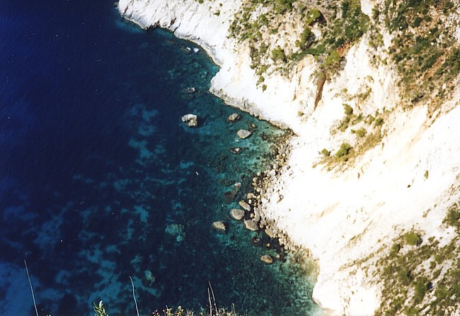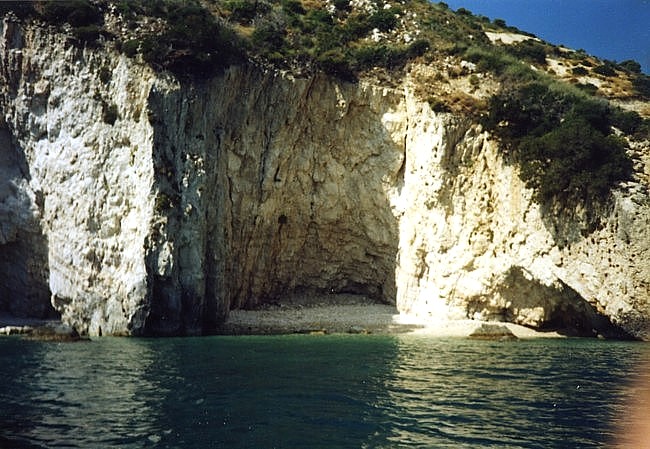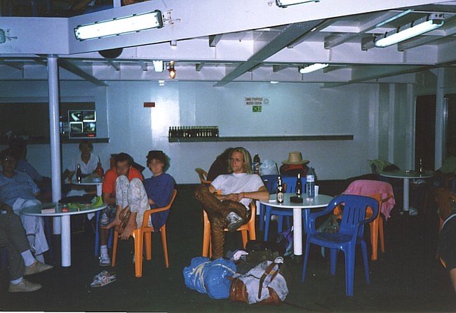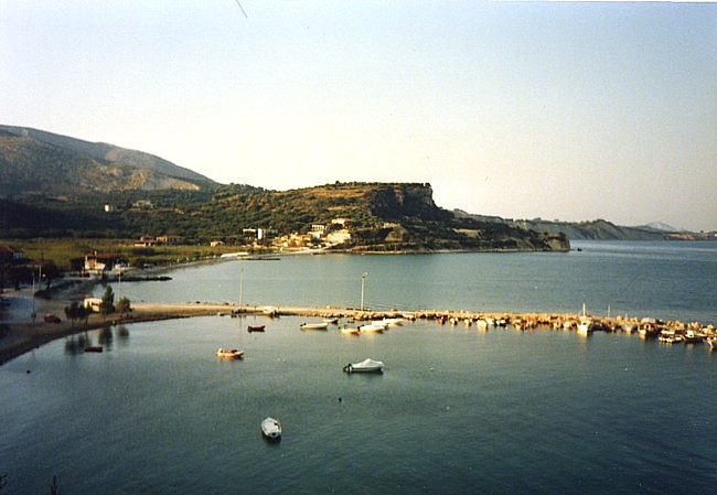 Der letzte Abend auf Zakynthos endete wie die Abende zuvor: Friedel freute sich, sich so früh abzulegen, ich saß noch auf dem Balkon und lauschte die griechische Nacht. Ich freute mich schon drauf, zum Camping zurück zu kommen, zu Costas, zu Lisa... Morgens gab es ein letztes Mal das Frühstück von Dennis “ans Bett” geliefert und gestärkt packten wir unsere sieben Sachen auf die Mopeds, um in Richtung Fähre zu düsen. In Zakynthos Stadt tranken wir noch einen Nes-Kaffee und “gruselten” uns vor den kurzbehosten blassen Engländern mit ihren Kameras vor dem Bauch. Die Fähre brachte uns zurück zum Peloponnes und wir sahen zu, daß wir zackig nach Tholo zurück kamen, welches uns nach den intensiven Tagen und Nächten nun schon wie eine zweite Heimat vorkam. |