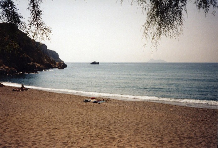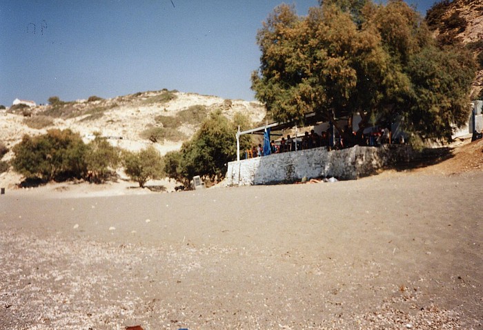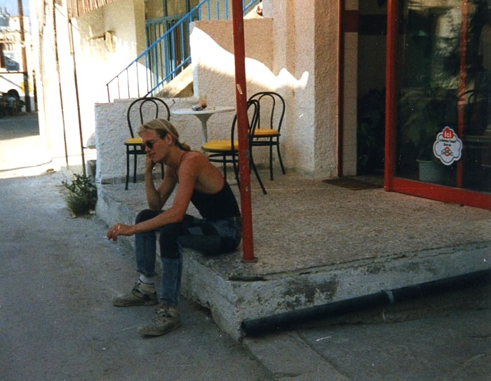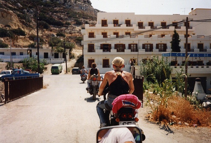 Aus meinem Plan, “so bald wie möglich” nach Kreta überzusetzen waren mittlerweile unvorhergesehen viele Tage geworden, doch dann sollte es vom Camping aus wirklich mal weiter gehen. Zu Ruben und Susanne war der Kontakt mittlerweile so weit, daß die beiden sich uns anschließen wollten. Das genaue Datum erinnere ich nicht mehr, den Abend vor der geplanten Abfahrt nach Kreta um so mehr: im völligen Überschwang der Euphorie tranken Torsten und ich den Ouzo als wenn er Wasser wäre... das konnte ja nicht gut gehen... ich krachte irgendwann, nachdem ich mich mit einer “Notlüge” von der Bar gestohlen hatte, in meinen Schlafsack, um Ralf´s Erzählung nach auf der Stelle in den extremem “Säge-Modus” zu verfallen, eine kleine Katze machte es sich auf meinem Bauch bequem und fühlte sich anscheinend stark an ihre Mami erinnert. Torsten machte den Angaben zufolge noch ein paar “sportliche Übungen” mit seinem Moped, ging schließlich wohl noch kotzen und war nur schwerlich zur Ruhe zu bringen (im Nachherein war niemand begeistert von der Nummer). Der nächsten Morgen war grausam, ich hatte zwar (noch) keinen Schädel, war aber immer noch ziemlich breit und entsprechend planlos und mußte trotzdem meine Sachen packen. Einen Teil meines Gepäcks durfte ich glücklicherweise auf dem Camping lassen und auf dem Rückweg von Kreta abholen. Torsten bekam von Petra ein absolutes Fahrverbot verhängt und wurde kurzum unter einen als Sonnenschutz aufgestellten Regenschirm verfrachtet. So fuhren wir dann also zu neunt mit insgesamt sechs Motorrädern und einem Bedford Blitz in der gleißenden Mittagssonne gen Githio. Bis Kalamata war es ob des vorangegangenen Abends schon recht anstrengend, die Sonne brannte erbarmungslos auf uns nieder und ich schwitze unter meinem Helm wie selten zuvor. Hinter Kalamata ging es mir besser und ich begann wieder, die Landschaft wahrnehmen zu können, statt mich nur rein mechanisch auf das Fahren an sich konzentrieren zu müssen. Bevor es die ersten Serpentinen, für mich seitdem quasi der “Eingang” zur schönsten mir bekannten Motorradstrecke, ging, machten wir Pause. Zufällig pausierten wir gegenüber einer Hochzeitsfeier und ich war beeindruckt von der Fröhlichkeit, die von dieser Feier ausging. Die knapp 60 km bis Sparti waren Fahrgenuss pur, eigentlich viel zu schnell vorbei, obwohl wir recht langsam und bedächtig unterwegs waren – mir war klar, daß ich diese beeindruckende Strecke nicht zum letzten Mal gefahren war. In Githio angekommen besorgten wir uns die Tickets für die Nachtfähre nach Kastelli und gingen am Hafen etwas essen. Nach dem Essen zeigten Ruben und Susanne aus Braunschweig uns den „On the road pub”. Ca 5km von Githio in Richtung Areopolis auf der echten Seite lag die wohl originellste Kneipe, die ich je gesehen hatte. Der Wirt namens Takis hatte in liebevoller Detailarbeit eine Open Air Bar errichtet, die man am besten als „Puppenstube” bezeichnen kann. Nach einem viel zu kurzen Zwischenstop mußten wir uns auf den Weg zu Fähre machen, die um 23Uhr ablegen sollte, meine zweite Fahrt „oben ohne”. Die Fähre war ganz anders, als ich das vom Hinweg ab Italien kennen gelernt hatte: diese Fähre war nur ca 70m lang und in Proportion vielleicht die Hälfte der „El Greco“. Zudem war es im Fährbauch unglaublich heiß und stickig, während die Einweiser irgendwie immer noch genügend Luft hatten, uns mit ihren Trillerpfeifen in beträchtlicher Lautstärke „dirigieren” zu können. Es gab zwei höher gelegene Parkdecks für Motorräder, die über eine recht steile Rampe zu erreichen waren. Olaf und Gabi wurden von den Trillerpfeifen-Männern getrennt, beiden gingen die Nerven durch und sie mußten sich erst mal kräftig zoffen. Das Schiff fuhr ab, ich saß mit Gabi am Bug und versuchte sie zu beruhigen, was schließlich auch klappte. Nachts gegen 1Uhr machten die Bars auf dem Schiff zu und es wurde Zeit, schlafen zu gehen, schließlich sollten wir morgens gegen 7Uhr in Kissamos anlegen. Irgendwie hatten Ralf und ich es verpennt, uns einen guten Schlafplatz an Deck zu suchen, so blieb nur der Platz zwischen den Sitzbänken über – dummerweise kamen wir genau im Abfluß der Aircondition zu liegen und wachten nach kurzer Zeit auf nassen Schlafsäcken liegend auf. An Schlaf war nicht mehr so richtig zu denken, wir dösten ein wenig auf den harten Sitzbänken vor uns hin und im Morgengrauen kam endlich Kreta in Sichtweite. Olaf und Gabi hatten sich zwischenzeitlich glücklicherweise wieder vertragen. So erreichten wir Kreta am frühen Morgen, ziemlich unausgeschlafen und hungrig. Bevor wir das Schiff verlassen konnten mußte allerdings der klapprige Ziegenlaster, der am Abend zuvor als eines der letzten Fahrzeuge auf die Fähre gekommen war, das Schiff wieder verlassen – nach vielen Versuchen ließ sich der Motor tatsächlich durch Anschieben zum Starten überreden und hüllte den Schiffsbauch und alle sich noch im Innern befindlichen Passagiere in eine schwarze Wolke ein... jetzt war es nicht nur stickig und heiß, man konnte zudem kaum noch etwas sehen. Irgendwann hatten wir dann aber die Rampe hinter uns gelassen und das erste Mal kretischen Boden unter den Rädern. Ein weiteres Mal waren wir Helden! Die erste Taverna hatte zwar noch nicht geöffnet, aber wir klingelten die Betreiber quasi aus dem Schlaf, machten ihnen klar was wir wollten und bekamen kurze Zeit später auch eine weitere Variation dessen, was man damals als “Breakfast” ansah. Derart gestärkt machten wir uns auf den Weg nach Rethymnon, die New National Road gab es noch nicht und so schraubten wir uns die kurvige Küstenstraße entlang. Ich stellte ein weiteres Mal fest, wie unglaublich heiß es in Lederkleidung und mit Helm auf dem Kopf werden kann. In Rethymnon fragten wir uns zur Straße “To the south coast?” durch und fuhren dann in der Mittagssonne Richtung Matala. Das Erste, was ich von Matala sah, war hinter Pitsidia ein Schild 