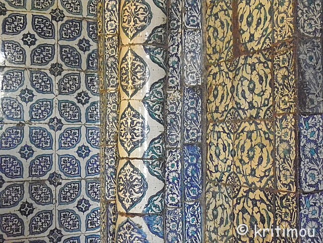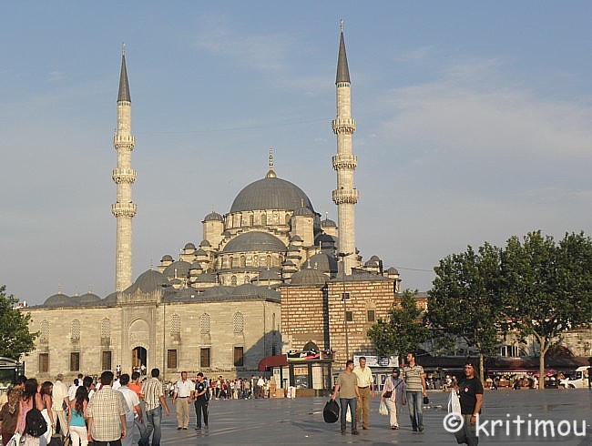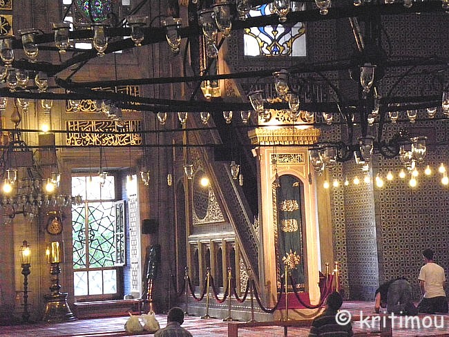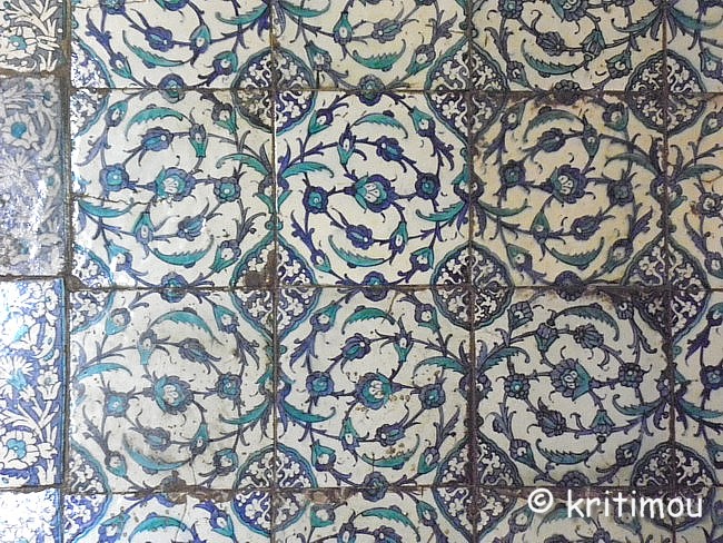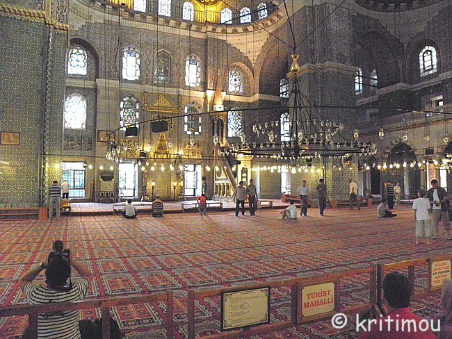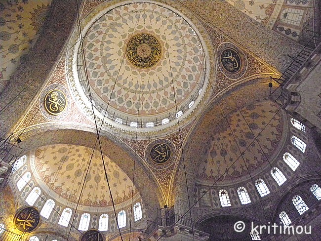 Der Platz vor dem Ägyptischen Basar beherbergt eine Vielzahl von Tauben. Auch hier werden sie gefüttert. Am liebsten sitzen sie jedoch in Reih und Glied auf einem Mauervorsprung der Neuen Moschee (Yeni Camii), die wir uns anschauen möchten. Das Prozedere kennen wir ja mittlerweile: Schuhe in Plastiktüte und Tuch über den Kopf. Die Moschee wurde ab 1597 in zwei Bauphasen errichtet. Da sowohl Bauherr als auch Architekt zwischenzeitlich verstarben, blieb die Kirche bis Mitte des 17. Jahrhunderts unvollendet. In wenigen Jahren gelang dann der Abschluss der zweiten Bauphase bis 1663. ![]() Als wir die Moschee betreten, fallen die großflächigen Wandverzierungen aus blau-gemusterten Kacheln ins Auge. Sie wurden in Iznik (das frühere Nicäa) hergestellt. Die Stadt liegt etwa hundert Kilometer südöstlich von Istanbul und ist seit dem Mittelalter ein Zentrum der Keramikkunst. ![]() ![]() ![]() Bei einer Rast auf dem flauschigen Teppich betrachte ich die Kuppeln. In welch mühevoller Kleinstarbeit und geometrischer Akurresse diese in luftiger Höhe gestaltet worden sind! ![]() Die Kanzel (Minbar) ist ein Prunkstück, das von alten Zeiten kündet.