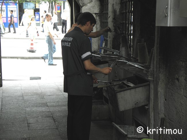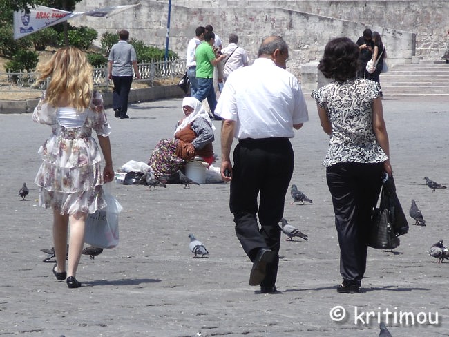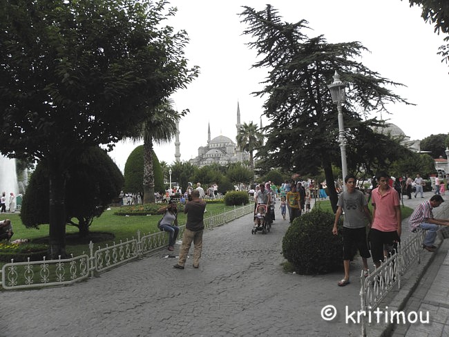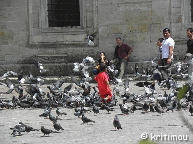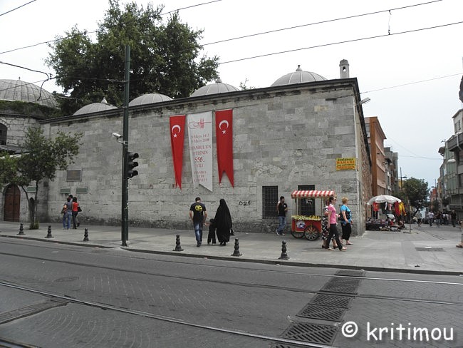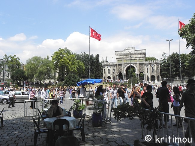 Es ist Sonntag, ein Wochenendtag, den viele Istanbuler Familien für Ausflüge, Spaziergänge und kleinere Unternehmungen nutzen. Als wir uns, gestärkt durch ein üppiges Hotelfrühstück, auf den Weg in die Altstadt machen, führt unser Weg zunächst wieder zum Beyazıd-Platz mit dem Eingangstor zur Universität, wo uns auch schon am Vortag die Musik hingelockt hatte. In der Gewissheit, noch einige Tage in Istanbul vor uns zu haben, können wir uns Zeit lassen. Im Café unter den Platanen, bestellen wir leckeren Kaffee. Im Hintergrund trillert ein Vogel in seinem Käfig. Entspannende Instrumentalmusik vom Band füllt diesen Teil des Platzes. Hier lässt es sich leben. Erholung pur. Direkt vor dem Eingang zum Universitätsgelände säumen viele Menschen die Türen und Mäuerchen und sämtliche irgendwie gearteten Sitzgelegenheiten. Wir erfahren, dass heute Prüfungstag ist und die Angehörigen jetzt, am späten Vormittag, auf die Prüflinge warten. Vom benachbarten Minarett der Beyazıd-Moschee ruft ein Muezzin zum Gebet. Gläubige strömen in den Vorhof. Derweil sorgt ein Kehrwagen auf dem Platz für Sauberkeit. Zwei Frauen verkaufen Taubenfutter, ein kleiner Junge scheucht die wartenden Vögel auf und amüsiert sich köstlich. ![]() ![]() Auch wir genießen den sonnigen Sonntagmittag auf diesem gemütlichen Platz, den Kaiser Theodosius im Jahr 393 anlegen ließ und der zu jener Zeit den Namen Forum Tauri (Stierplatz) trug. Gegen dreizehn Uhr ist es dann soweit, die Studenten verlassen ihre Fakultäten und zusammen mit ihren Verwandten auch den Platz. Hoffen wir, dass die Prüfungen für alle gut verlaufen sind. ![]() Nach erholsamen Stunden starten wir über die Hauptstraße in Richtung Altstadt und gelangen bald zu einem hochaufragenden Gerüst. Schilder klären darüber auf, dass die sagenumwobene Konstantinsäule (auch Verbrannte Säule genannt), die sich hinter dem Gerüst verbirgt, im Jahr 328 mit speziell aus Rom angelieferten Steinen errichtet wurde und seit einigen Jahren restauriert wird. Diese berühmte Säule symbolisierte das Bekenntnis des Kaisers Konstantin zum Christentum und bedeutete daher für die Christen, die zur damaligen Zeit Verfolgung und Folter aufgrund ihres Glaubens ausgesetzt waren, ein Symbol der Freiheit. Nicht weit davon entfernt ragt der Stumpf einer anderen Säule als Teil eines byzantinischen Triumphbogens aus dem vierten Jahrhundert aus der Erde empor. Von hier aus wurden in alle Richtungen des Kaiserreiches die Entfernungen vermessen. Wir sind in Sultanahmed angekommen. Hier spielt sich ein großer Teil des touristischen Lebens ab. Menschen aus aller Welt besichtigen die Sehenswürdigkeiten, und heute, am Sonntag, eben auch viele türkische Familien. Herrlich, diese bunte Treiben. Zwar sind die Basare geschlossen, doch die vielen Straßenhändler versuchen, die Gunst des Tages zu nutzen und ein paar Lira zu verdienen. Die Straßen sind sauber, die Anlagen gepflegt. Dafür wird ständig gesorgt. An dem Gebäudegiebel eines Moscheekomplexes hängt eine Fahne herab, auf der auf den 556. Jahrestag der Eroberung Konstantinopels durch die Osmanen erinnert wird. Das mutet uns ziemlich merkwürdig an. ![]() Nur wenige Meter daneben ein dunkler Eingang, in dem Holzkohlestückchen erhitzt werden.