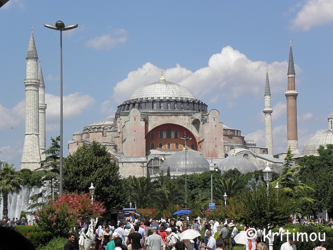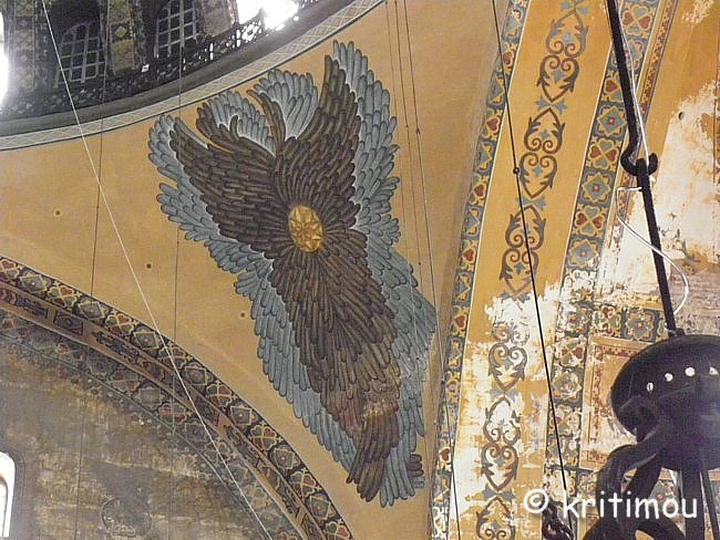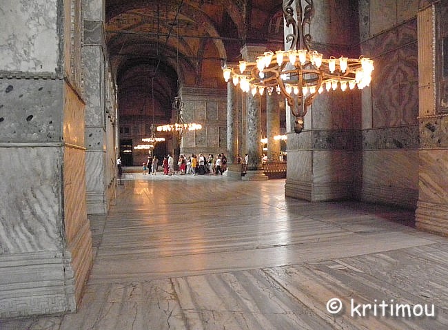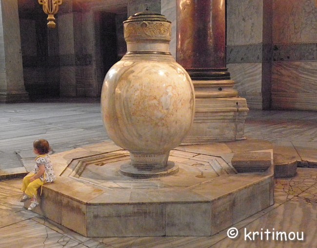 Es ist nicht verwunderlich, dass sich in Sultanahmed viele osmanische Herrscher verewigt haben, wie im Topkapı - Palast oder durch den Bau verschiedener großartiger Moscheen. Inmitten all dieser Gebäude jedoch steht die Agia Sofía, ein sehr besonderes, schon seit seiner Vollendung im sechsten Jahrhundert berühmtes, symbolhaftes und einzigartiges Bauwerk, Krönungskirche der byzantinischen Kaiser im Zentrum der Weltpolitik, religiöser Mittelpunkt der Orthodoxie, bedeutsames Beispiel hoher architektonischer Baukunst mit einer gigantischen Kuppel, die wagemutig auf nur vier Pfeilern ruht, um den Innenraum noch großartiger erscheinen zu lassen. In dieser Kirche schlug das Herz des Byzanz. Auch die Osmanen erkannten die Großartigkeit des Gebäudes und haben es zigfach kopiert: Fast alle Moscheen in Istanbul erinnern mit ihren Kuppeldecken an die Agia Sofia. Nach der Jahrhunderte währenden Nutzung als Moschee ist die Agia Sofia letztendlich seit 1935 ein Museum. Mit dem Gedanken an die Agia Sofía ist Alex aufgewachsen, mit den Geschichten, die er im Schulunterricht erfahren hat, die damals auch zu Hause erzählt wurden, und die für ihn wie Märchen waren. Doch heute steht er leibhaftig hier und wird dieses Welt-Kulturerbe endlich besichtigen können, wie wohl für viele Griechen die Erfüllung eines großen Wunsches. ![]() Wir stellen uns in einer langen Schlange an und zahlen am Kassenhäuschen 10 Euro Eintritt pro Person. Unsere Mini-Stative müssen wir abgeben. Im Außenbezirk der Kirche kann man umherwandern, antike Fragmente bestaunen oder einfach auf einer Bank verweilen, bevor man mit den vielen anderen Besuchern den Innenraum der Kirche betritt. Unausgesprochen trennen sich unsere Wege einstweilen, denn jeder nimmt anders wahr und konzentriert sich auf andere Einzelheiten. Unerwartet fallen zunächst die überdimensionalen Schilder unterhalb der Kuppel mit den arabischen Kalligraphien auf. Mit ihren fast acht Metern im Durchmesser ziehen sie den Blick gezielt auf sich. Das habe ich so nicht erwartet, nicht die osmanische Geschichte am Anfang, sondern die byzantinische. Wo sind denn diese Symbole? ![]() Das riesige Gerüst, das mitten in der Kirche steht, reicht vom Boden bis zur Decke und verdeckt fast die Hälfte der Kuppel. Es steht dort seit Jahrzehnten. Der sichtbare Teil der Kuppel ist ebenfalls mit arabischen Schriftzeichen bemalt und scheint mit ebendiesen Symbolen neu gestaltet zu werden. Ich wende mich nach rechts und mein Blick schweift von der Seite erneut durch die lichte Höhe. Die Schilder, die unterhalb der Kuppel angebracht wurden, ziehen immer wieder die Blicke an. Das Gerüst stört enorm. So sind meine ersten Eindrücke. Langsam gehe ich am Rand entlang. Mir fallen die Strukturen der Steinblöcke auf, aus denen das Mauerwerk besteht. Nichts war dem Erbauer teuer genug, um die Kirche zu einem einzigartigen Bauwerk zu machen. Porphyr- (vulkanisches, rötliches Gestein) aus Ägypten und Marmorplatten von den Marmara-Inseln wurden verarbeitet. Auch der Boden besteht aus geschliffenen Marmorplatten. Auf Marmorsäulen ruhen korinthische Marmor-Kapitelle mit durchbrochenen Blattmustern. Zwei gigantische Marmorgefäße zieren den Eingangsbereich. ![]() ![]() Bemalte Deckenabschnitte fordern meine Bewunderung. Ein Teil der hohen Decken- und Kuppelbemalung ist neu, ein anderer Teil ist dunkel, die Farben sind verblasst oder rußgeschwärzt. Keine Mosaiken oder bildlichen Darstellungen sind bisher für mein Auge sichtbar geworden, und so vermittelt die Agia Sofia von ihrer Innenausstattung her den Eindruck einer Moschee. Das habe ich nicht erwartet und bin ziemlich enttäuscht. Fast alle religiösen Symbole des Byzanz liegen hinter dickem Putz, wurden abgenommen oder vernichtet. Die Kirche mit ihrer bis zur Eroberung im Jahre 1453 fast tausendjährigen Geschichte wurde danach zur Hauptmoschee umfunktioniert. „Die Ikonen wurden entfernt und die Mosaike verschwanden hinter einer Putzschicht, was vor allem dem islamischen Bilderverbot geschuldet war. Auch das große steinerne Kreuz auf der Kuppel wurde abgenommen. Die Steine verbaute man in der Eingangstreppe.“ Quelle: Kirchengucker, Stand 13.09.2009 Das stimmt mich traurig. Es ist zwar so, dass Symbole aus der osmanischen Zeit für moslemische Pilger heute sicherlich auch einen hohen Stellenwert besitzen, doch die Mosaiken und Malereien aus den Vorjahrhunderten sind einfach bis zu eintausend Jahre älter. Wer mag entscheiden, was erhaltenswerter ist? Für die Bewahrung der wertvollen christlichen Symbole machte sich Sultan Abdülmecid I. Mitte des neunzehnten Jahrhunderts verdient, als er die renommierten Schweizer Architekten Gaspare und Giuseppe Fossati mit der Restaurierung der mittlerweile baufällig gewordenen Moschee beauftragte. Dabei wurden die noch vorhandenen christlichen Wandmalereien und Mosaike sorgfältig in Stand gesetzt, danach jedoch gleich wieder mit Putz oder Farbe bedeckt. Insbesondere den Bemühungen des in Thessaloniki geborenen Kemal Atatürk ist es zu verdanken, dass die byzantinische Agia Sofia zumindest in dem damaligen Zustand erhalten blieb, indem die Moschee 1935 in ein Museum umgewandelt wurde. Mehr noch: Archäologen konnten und können jetzt die verborgenen und noch erhaltenen Bilder wieder freilegen. Wie man liest, waren die überdimensionalen Schilder ein Zugeständnis an die Muslime. Zuletzt wurde Ende Juli 2009 ein Mosaik, das einen Seraphim darstellt, unter mehreren Putzschichten und einer Metallmaske an einem Pfeiler der Hauptkuppel freigelegt. Das Entstehungsdatum des „Engels“ ist nicht eindeutig, doch man schätzt, dass er älter als 700 Jahre ist. Wer weiß, welche Kunstschätze noch im Verborgenen schlummern, würde man den Putz der Kirche nach und nach gänzlich abtragen.