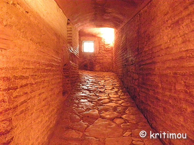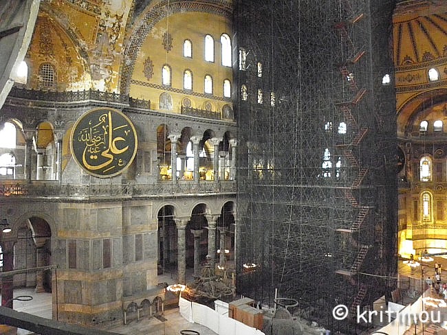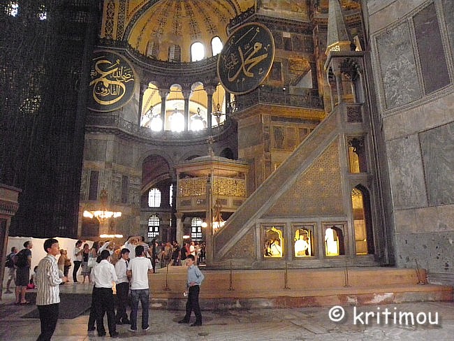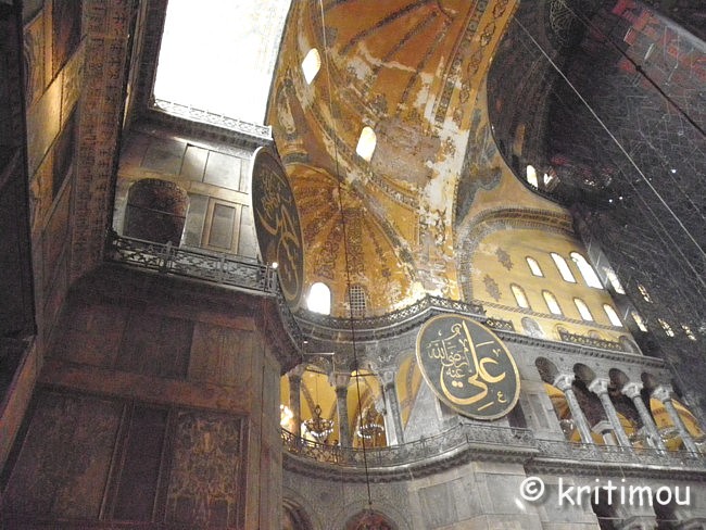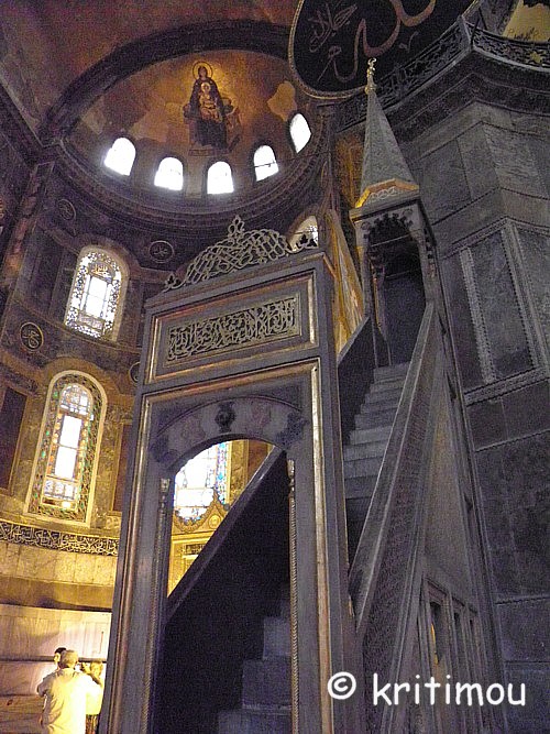 Die oberen Abschnitte der tragenden Pfeiler sind mit solchen Figuren bemalt. Unter dem hellen Schild in der Mitte - wie auf diesem Bild - verbarg sich der Seraphim An der Decke der Apsis sind die vergoldete Darstellung der Panaghía mit Kind und zweier Erzengel freigelegt worden, von denen nur noch einer teilweise erhalten ist. So muss die gesamte Decke in byzantinischen Zeiten ausgesehen haben: künstlerische Darstellungen in vergoldeten, eindrucksvollen Mosaiken. Den Kontrast erkennt man wiederum im Erdgeschoss. Direkt unter der Panagía-Darstellung befinden sich die Gebetsnische (Mihrab), daneben die Kanzel (Minbar) der Moschee und die Sultansloge. Viele moslemische Besucher stehen voller Bewunderung davor. Was mag durch deren Köpfe gehen? Hochachtung vor den alten Insignien? Freude über den Sieg des Islam über die „Ungläubigen“? ![]() ![]() Ein stufenloser Gang, windet sich hinauf auf die Empore.