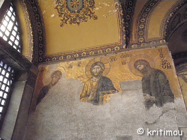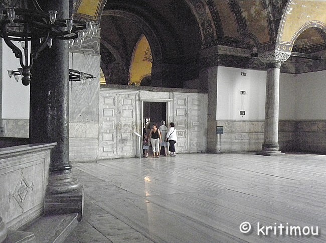 ![]() Aus dieser Perspektive kann man die Größe der Kirche noch besser einschätzen, erkennt man den Widerspruch der Religionen deutlich, mit dem die Kirche weiterlebt. ![]() Diese Etage scheint den christlichen Symbolen gewidmet. Große Fotos der freigelegten Mosaiken mit entsprechenden, informativen Begleittexten sind hier ausgestellt. Durch ein marmornes Tor betreten wir auf der Galerie einen ehemals nur hohen Würdenträgern (Teilnehmern an Synoden) vorbehaltenen Bereich. ![]() Einige Stunden sind wir jetzt schon in der Agia Sofía, nehmen die erhabene Stimmung auf, geben uns auch einer aufkommenden Traurigkeit hin, während wir das Mosaik Jesus als Weltenrichter bestaunen, als von der benachbarten Blauen Moschee der Gebetsruf herüberschallt.