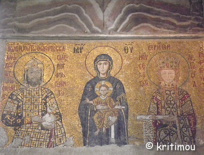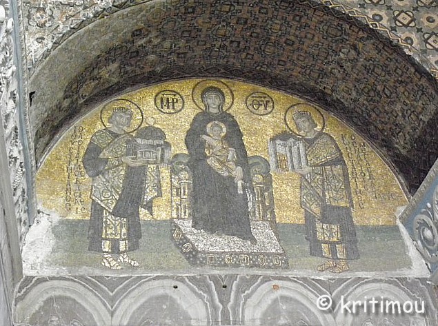 Panaghía mit Kind, Kaiser Johannes Komnenós II. und Kaiserin Iríni (Mosaik aus dem 12. Jahrhundert) Wieder im Erdgeschoss passieren wir auf dem Weg nach draußen das Prächtige Tor, wo unter der hohen Decke ein weiteres Mosaik zu erkennen ist: