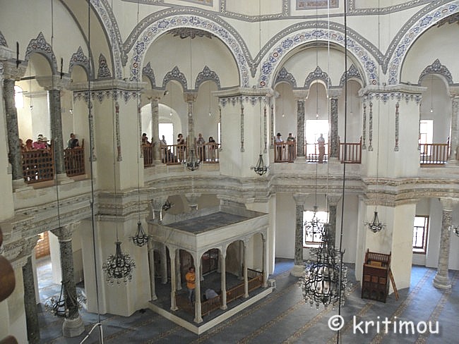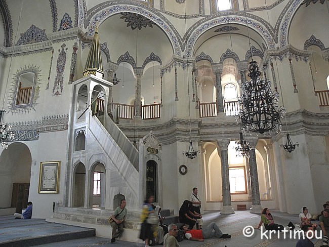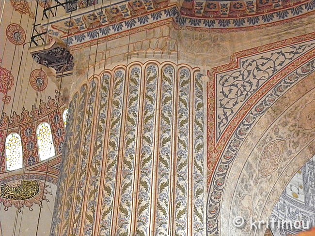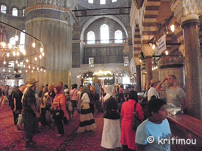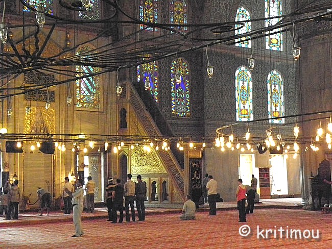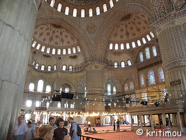 ![]() Der Ägyptische Obelisk wurde im Jahr 390 im Hippodrom aufgestellt, stammt jedoch aus Ägypten und wurde dort um 1490 v. Chr. errichtet. Er ruht auf einem steinernen Sockel mit interessanten Darstellungen und Inschriften, die wir jedoch nicht übersetzen können. ![]() ![]() Nach einem gemütlichen Bummel durch das Hippodrom lassen wir uns in einem Outdoor-Café auf einen Tee nieder. Apfeltee ist überhaupt eines der tollsten Getränke, die ich kennengelernt habe: Es schmeckt ganz intensiv nach frisch gepflückten, grünen, noch nicht ganz reifen Äpfeln. In unmittelbarer Nähe zur Blauen Moschee und direkt gegenüber dem Deutschen Brunnen (im Jahr 1900 zum Gedenken an einen Besuch des Deutschen Kaisers Wilhelm II. errichtet) lässt es sich auf unserem Bänkchen bestens aushalten. ![]() Wir genießen es, das Leben ein wenig an uns vorbeiziehen zu lassen, „verdauen“ während einiger Stunden die vergangenen drei Tage, die so prall gefüllt mit Besichtigungen und Erlebnissen waren. Die Stadt hat uns definitiv in ihren Bann gezogen. Erst jetzt wird uns klar, was wir alles nicht sehen können, und dass fünf Tage gerade einmal ausreichen, sich einen groben Überblick zu verschaffen. Von der Blauen Moschee ertönt der Gebetsruf. Nachdem die Straßenfegemaschine diesen fast völlig verschluckt hat, nehmen wir die Rasenmäher wahr. Ständig wird hier gewerkelt, um alles in Schuss zu halten. Wie man einigen Aushängen entnehmen kann, ist das Picknicken auf den Rasenflächen verboten. Eine Ibero-Reisegruppe fährt im Bus vorbei. Ihr folgt zu Fuß eine kleinere, sehr ruhige japanische Reisegruppe. Dann fahren wieder Ibero-Busse vorbei, dazwischen ein Polizeiwagen, aus dem ständig Lautsprecherdurchsagen auf Türkisch zu hören sind. Besichtigung der Blauen Moschee (Sultan-Ahmed-Moschee, erbaut 1609-1616) Eine größere Menschenmenge hat sich im weiten Hofgeviert eingefunden. Wir stellen uns dazu, können den Eingang in die Moschee jedoch nicht erkennen, so dicht gedrängt stehen die Menschen. Langsam schieben wir uns alle zusammen nach vorne. Bald werden wir gefragt, ob wir Besucher oder Betende sind. Als Besucher werden wir angesichts des Andrangs um die Ecke zu einem anderen Eingang geschickt. Auch hier hat sich bereits eine lange Schlange gebildet. Kurz vor dem Eingang in die Moschee – die Schuhe sind bereits in Plastiktüten verstaut und mein Tuch liegt lose auf dem Kopf – schaut eine junge, freundliche Frau noch mal nach dem Rechten. Mein Dekollete muss ganz bedeckt werden. Mit geübten Handgriffen hat sie dies im Handumdrehen bewerkstelligt. Nun können wir das Gebäude betreten. ![]() Die Größe des Innenraums und die Ausgestaltung von Wänden und Kuppeln sind überwältigend. Vier stämmige Säulen stützen die Hauptkuppel, ähnlich wie in der Agia Sofia. So vermittelt auch diese Kirche das Gefühl von lichter Weite und Größe. Prächtige blau-grüne, kunstvoll gearbeitete Kacheln zieren die Wände. ![]() Auch viele Fenster sind in verschiedenen Blautönen gehalten. Auf einem schönen weichen Teppich kann man gemütlich herumlaufen und die Schätze bestaunen. Eigentlich sollte diese Moschee die Agia Sofía in jeglicher Hinsicht übertreffen. Beide jedoch haben unterschiedliche historische Bezüge. Die Agia Sofía in der heutigen Gestalt ist über eintausend Jahre älter als die Blaue Moschee. Die Blaue Moschee wird auch weiterhin als Kirche genutzt, ist sogar Hauptkirche Istanbuls, die Agia Sofia ist ein Museum. Die Innenausstattung ist komplett verschieden. Aber ist es tatsächlich wichtig, wie viele Minarette jede Kirche und welche Kuppel den größeren Durchmesser, die höhere Höhe hat? Warum weitere Unterschiede aufzählen? Nach meiner Wahrnehmung sind beide Gebäude absolut einzigartig! Und daher sollte der interessierte Besucher auch beide besichtigen. Auf jeden Fall. Die Blaue Moschee vermittelt durch ihre Erhabenheit trotz des Besucherandrangs ein Gefühl von Ruhe. Viele Gläubige verrichten ihre Gebete in den dafür bestimmten Zonen: Die Männer im Innenraum der Moschee, die meisten weit vorne vor der Gebetsnische, die Frauen ganz hinten, hinter der Besucherzone. ![]() Drei tiefschwarz verschleierte Frauen sitzen dort und führen anschließend eine von ihnen, die offensichtlich sehbehindert ist, wieder hinaus. Ihre teuren Gewänder aus edlem Tuch werden hinten mit schmuckvollen Spangen gehalten. Eine Großfamilie setzt sich neben mich auf den Boden. Kinder tollen herum. Ausgerechnet an der einen Säule, wo ein großes Schild besagt, dass man sich dort nicht hinsetzen soll, hat ein Teil von Nippon 3 Platz genommen. ![]() Mir scheint, dieser Ort ist auch eine Pilgerstätte; Gläubige kommen nicht nur zum Gebet, sondern besichtigen die Moschee sehr ausgiebig. Das vielstimmige Gemurmel und Kindergeschrei verhallt in der Weite des Raumes und wird teilweise vom Teppich wieder verschluckt. Die Atmosphäre ist allgemein locker und gelöst. Bloß denke ich, dass sich die Betenden vielleicht gestört fühlen. Doch niemand lässt Unmut erkennen. Fotos werden gemacht: Vier Kinder, wie die Orgelpfeifen, an einer dieser beeindruckenden Säulen, unter einer arabischen Kalligraphie. Ein junger Mann durchschreitet schnellen Schrittes mit erhobenem Handy den Besucherraum und filmt dabei die blaue Wandverzierung. Beim nachträglichen Anschauen der Bilder wird einem mit Sicherheit schwindlig werden. Eine junge Frau mit arabischen Gesichtszügen hat sich in etwa einem Meter Abstand zu mir auf den Teppich gesetzt und schaut mir unverhohlen beim Schreiben zu. Mein Blick zu ihr und sie schaut schnell weg. Doch immer wieder ruhen ihre Augen auf mir und dem Tagebuch. Sehr offen ist ihr Gesicht, hübsch und freundlich. Sie lächelt und ich lächle zurück. Doch wir sprechen uns nicht an. Es wäre ganz leicht gewesen. Manchmal hinterlässt das Unausgesprochene eine tiefere Erinnerung als nichtssagende Fragen nach dem Woher und Wohin. Am Ausgang steht die Miniaturausgabe des Grabes des Prophet