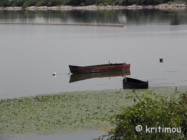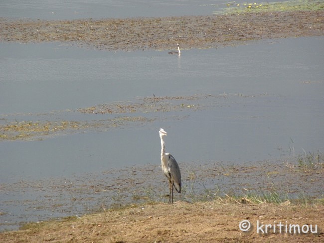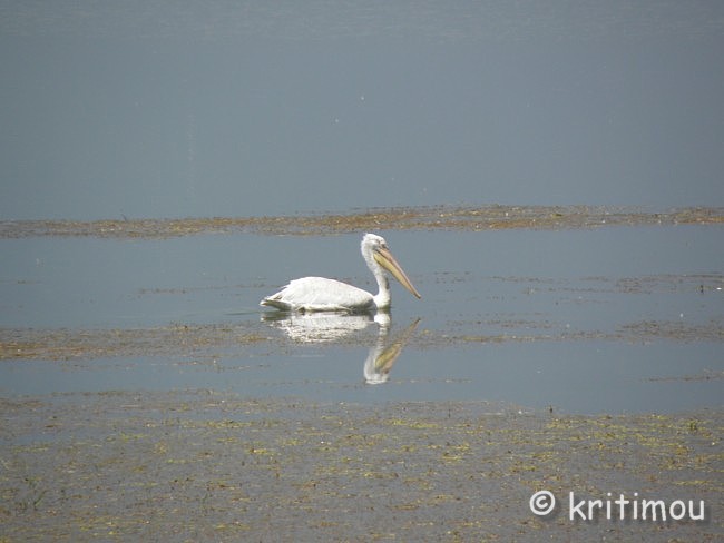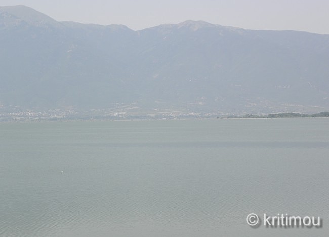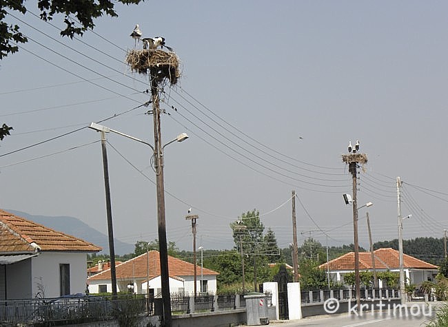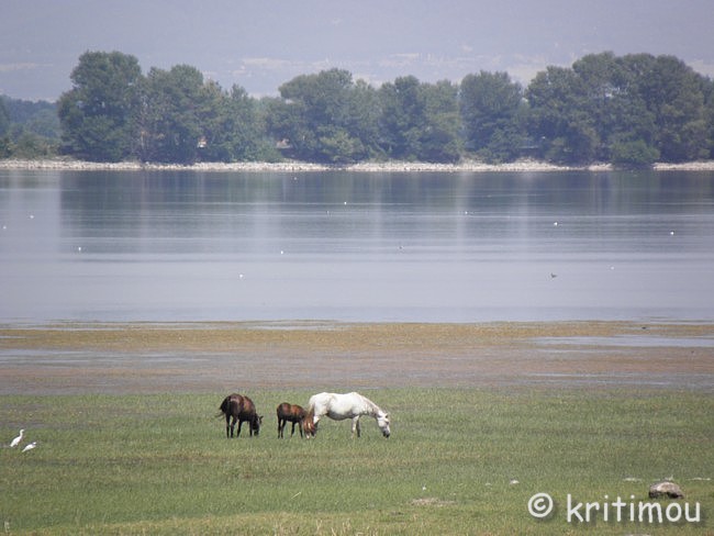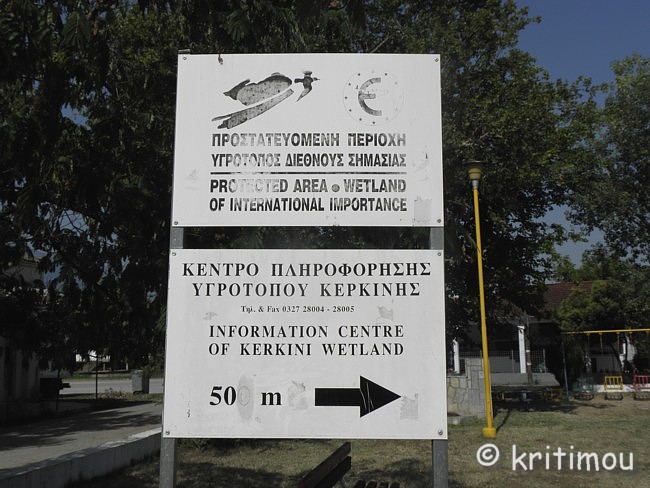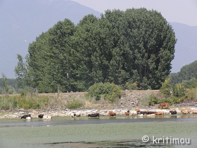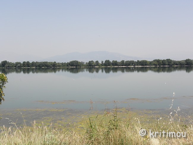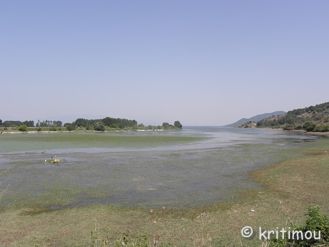 Am Dorfeingang erinnert ein Kriegsdenkmal an die Schlacht von 1913 während des Balkankrieges. Die aufgereihten Kanonen zeigen alle in Richtung Bulgarien. Ein Hund liegt faul mitten auf der Straße. Wir brauchen nur der Musik zu folgen, die uns in ein winziges Lokal lockt. Thalassinós at his best! Neben einer kleinen Paréa gutgelaunter junger Leute nehmen wir an dem zweiten Tisch im Außenbereich Platz und singen einfach das Lied mit, was uns augenblicklich in einen freundlichen Kontakt mit den Sitznachbarn bringt. Die zusammengestellte Disk trifft voll unseren Musikgeschmack, und der Frappé ist reichhaltig und preiswert. Itane mia fora singt Níkos Xyloúris, einfach zum Schwärmen. Aber sorry, Kreta ist gerade weit weg. Vielmehr begeistert uns die Momentaufnahme in diesem kleinen nordgriechischen Dorf und prägt sich ein. Ein Auto mit zwei jungen Männern hält vor dem Lokal. Unsere Sitznachbarn rufen: “Kommt her, setzt euch dazu!“ – „Geht nicht, wir haben zu tun, müssen 4 Autos waschen!“ Wir schauen uns noch ein wenig im Dorf um. Keine Villen gibt es hier, dafür aber normale Einfamilienhäuser ohne Schnickschnack. Es wird gewerkelt. „Lachanás ist ein lebendiges Dorf“, hat uns auch das Dorfmagazin vom Juni verraten. Nach unserer Rast streben wir wieder zur Nationalstraße und erreichen schon bald Strimonikó. Von hier führt eine schmale Straße zunächst links am Strimónas-Fluss und im weiteren Verlauf am linksseitigen Ufer des Kerkínisees entlang. Dort, am Ausgang des Sees, befindet sich ein Staudamm. Auf dem weiteren Weg begegnet uns fast niemand. Ganz langsam rollen wir fast lautlos am Rand des ruhigen, graufarbigen Sees vorbei. Direkt am Ufer erkennt man, wie viel Wasser jetzt im Hochsommer der See bereits eingebüßt hat. Doch der breite sumpfige Uferstreifen ist ein Paradies für Wasservögel, die hier bequem der Nahrungssuche frönen. Immer wieder bleiben wir stehen, genießen den Blick auf die spiegelglatte Wasseroberfläche und das mächtige Kerkinigebirge im Hintergrund. Doch am meisten fasziniert uns die Vielfalt der hiesigen Vogelwelt. Scheu sind sie, die Reiher, Pelikane, Löffler, Störche und Kormorane. In Ermangelung ornithologischer Kenntnisse versuche ich einfach nur, mit meinem Kameraobjektiv möglichst nah an die Vögel heranzuzoomen. Was mir allerdings nicht gelingt, ist, einen Reiher im Flug zu erwischen. Zu schnell ist er aus dem Blickfeld verschwunden. Beeindruckend die Flügelspannweite. Irgendwo auf der Strecke begegnet uns eine Viehherde. Die gut genährten Tiere suchen Schatten unter den Bäumen und das kühle Nass zur Erfrischung. An einer Stelle möchte ich aussteigen, werde jedoch gleich von großen Käfern bombardiert. Nein, es sind Zikaden, die sich einerseits auf meinen Kopf fallen lassen, andererseits die Gummidichtung der Beifahrertür belagern. Merkwürdig! Die Insektenwelt ist so nah am Süßwasser vielfältig und zahlreich. Libellen vollführen sogar Yogaübungen! Immer weiter rollen wir am westlichen Ufer des Sees entlang und erreichen am westlichsten Zipfel den Ort Kerkíni. Ein wenig Tourismus hat sich hier entwickelt. Es gibt Unterkünfte und Esslokale. Mittlerweile ist die Mittagszeit schon überschritten, sodass wir uns zu einem Imbiss entschließen. Etliche Tavernen bieten Süßwasserfische aus dem See an. Für unser sehr reichhaltiges Mal (ohne Fisch) zahlen wir gerade mal 12 Euro. Von unserem Platz aus sehen wir auf fast jedem Strommast Storchennester oder einzelne Störche stehen, die sich in der Hitze mit offenem Schnabel Kühlung verschaffen. Im Ort gibt es ein Infozentrum, in dem ich mir Material zum See besorge.
