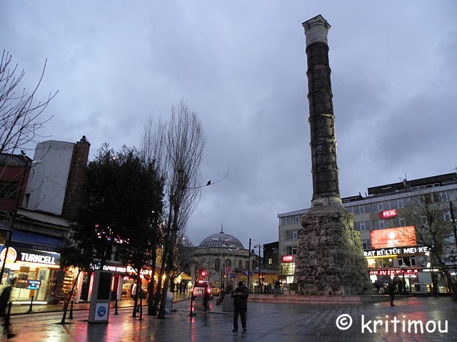 ![]() Als uns die Augen langsam übergehen, ist auch das Ende der Ausstellung erreicht. Insgesamt war die Besichtigung sehr informativ und anregend. Der Querschnitt durch die türkischen und islamischen Künste hat nicht nur unseren Horizont erweitert, sondern uns Gelegenheit gegeben, einen verregneten Nachmittag in Istanbul mit der Betrachtung schöner Dinge zu verbringen. Zum Ausgang hin gelangen wir in das Museumscafé, einen geschmackvoll eingerichteten großen Raum, bei dem man zuerst nicht erkennt, welche der Einrichtungsgegenstände noch zum Museum gehören, welche zur Zubereitung von Kaffee und Tee dienen oder welche zum Verkauf bereit stehen. ![]() ![]() Nachdem wir in dem voll besetzten Café ein wenig gewartet haben, beschließen wir, zum Abschluss ein anderes Lokal aufzusuchen. Um die Ecke liegt der Arastar-Basar (hinter der Blauen Moschee), und dort am Eingang befindet sich ein großes Open-Air-Café, dessen Sitzplätze im Außenbereich von Heizstrahlern gewärmt werden. Mit einem heißen Tee kann man es hier gut aushalten. Am frühen Abend bummeln zurück. In der Nähe des Großen Basars, wo sich früher das ovale Konstantin-Forum befand, steht die gleichnamige Säule, die Konstantin der Große, aus Rom im vierten Jahrhundert an diese Stelle bringen ließ. Früher war sie noch um einiges höher, heute misst sie etwa 35 Meter. Auf ihrer Spitze thronte zunächst eine Bronzestatue mit der Darstellung des Kaisers als Sonnengott, später ein Kreuz. Diese Säule wird auch Çemberlitaş oder Verbrannte Säule genannt. Die Bezeichnung Çemberlitaş bedeutet soviel wie „Reifensäule“ und spielt auf ihre Erscheinung mit den Metallringen an, die die Säulentrommeln aus Porphyr nach den Zerstörungen durch Erdbeben und Feuer zusammenhalten. ![]() Das Besondere ist ein Hohlraum, den man unter dem Marmorsockel fand. Angeblich sollen hier christliche Symbole aus der Zeitenwende als Reliquien aufbewahrt worden sein, doch der Wahrheitsgehalt solcher Mutmaßungen erscheint uns sehr zweifelhaft. Obwohl die Säule zum UNESCO-Weltkulturerbe gehört, gibt es dort keinen einzigen schriftlichen Hinweis auf ihren Namen und ihre frühere Bedeutung. Schließlich schlendern wir zurück in Richtung Hotel. Mittlerweile hat der Regen wieder aufgehört. Plätze und Straßen sind noch nass, und die Temperaturen auch nicht wirklich einladend. Wir freuen uns auf unser letztes Abendessen in der wohligen Wärme des Restaurants „Venezia" im Hotel „Vicenza" in Laleli. Bei einem gediegenen Mahl nehmen wir Abschied. Wir wissen jedoch, dass dies nicht unser letzter Istanbul-Besuch war und freuen uns schon auf das nächste Mal.