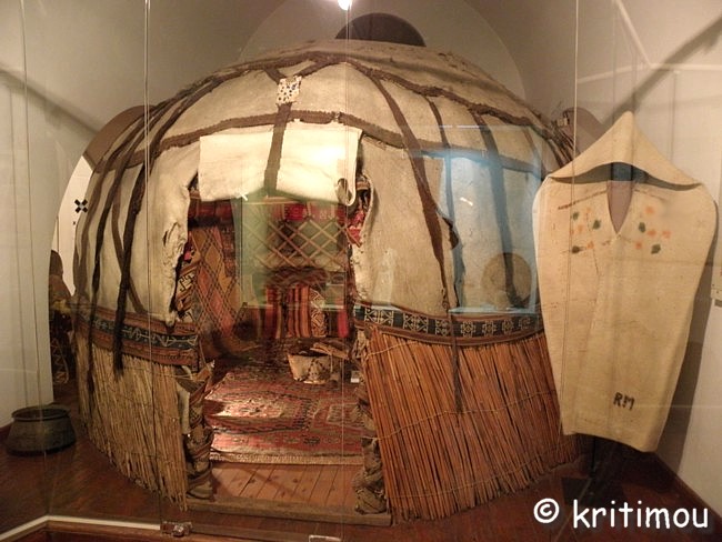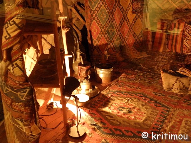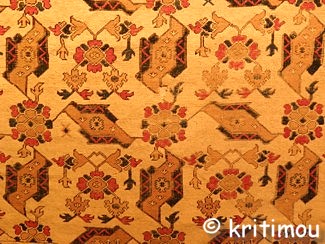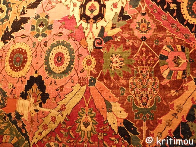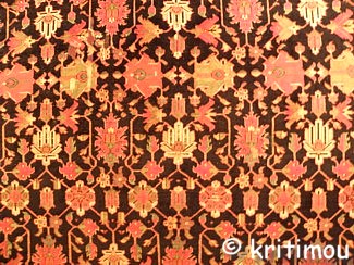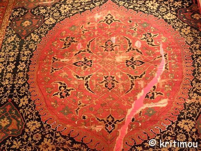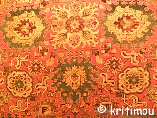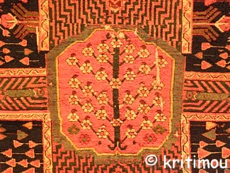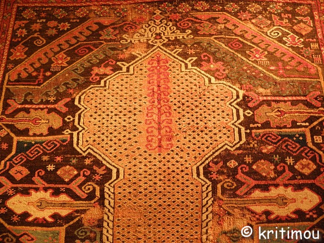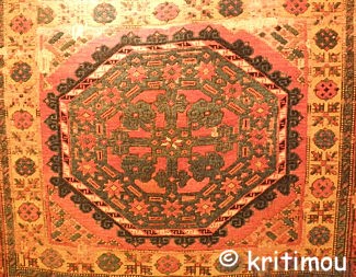 ![]() Den weitaus größten Teil des Museums nimmt jedoch die Teppichausstellung ein. Herstellung und Färbung werden, wie überall im Museum, auf Türkisch und Englisch erklärt. Wir staunen nicht schlecht über die Vielfalt in Muster, Farbgebung, Darstellung und Verwendung. Nicht nur die kalten Steinböden der Paläste waren mit Teppichen (Kilims) ausgelegt, sondern auch die Häuser einfacher Familien; sie kleideten sogar Nomaden-Jurten aus.