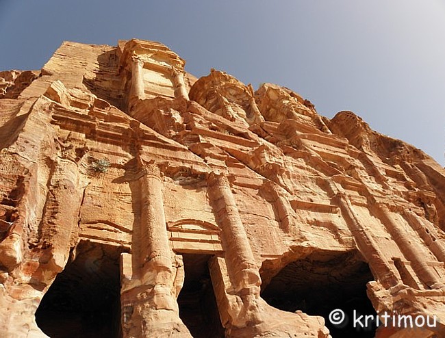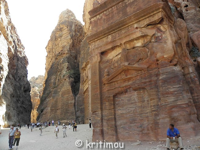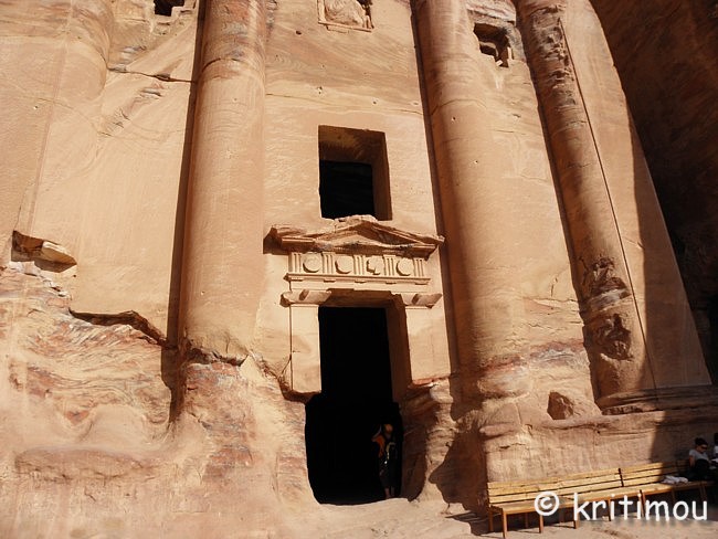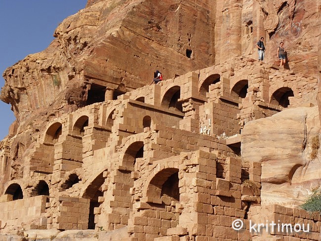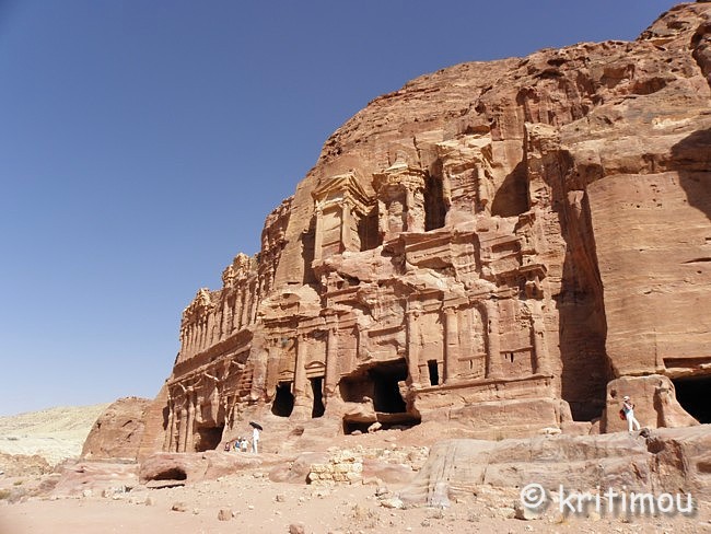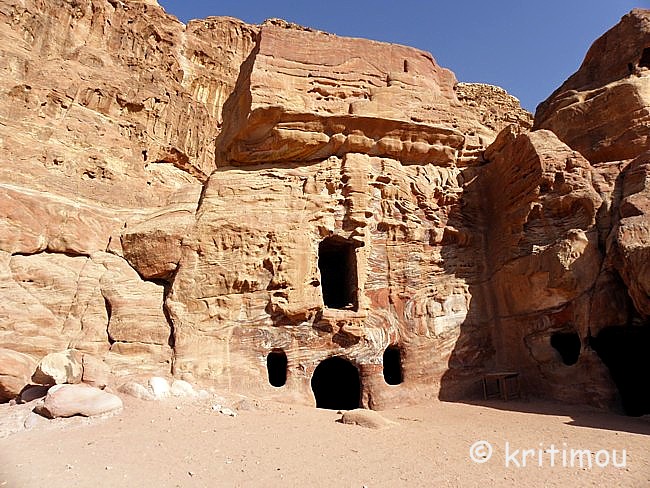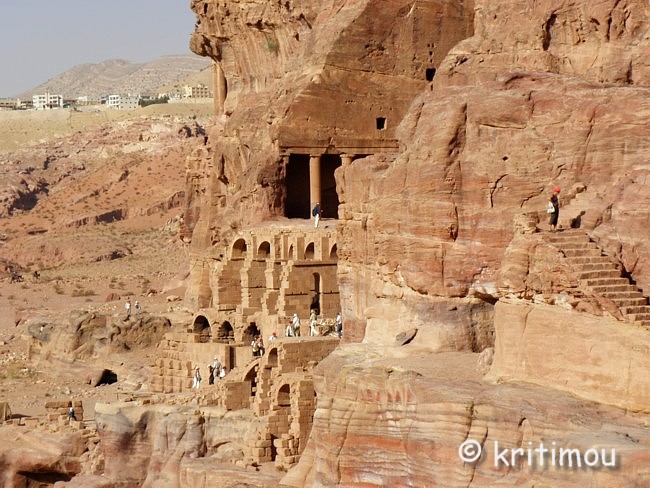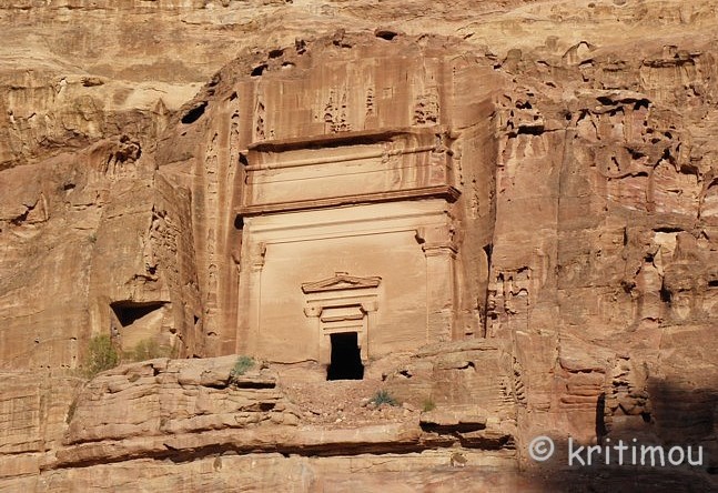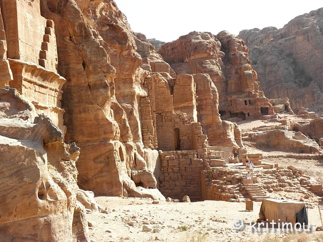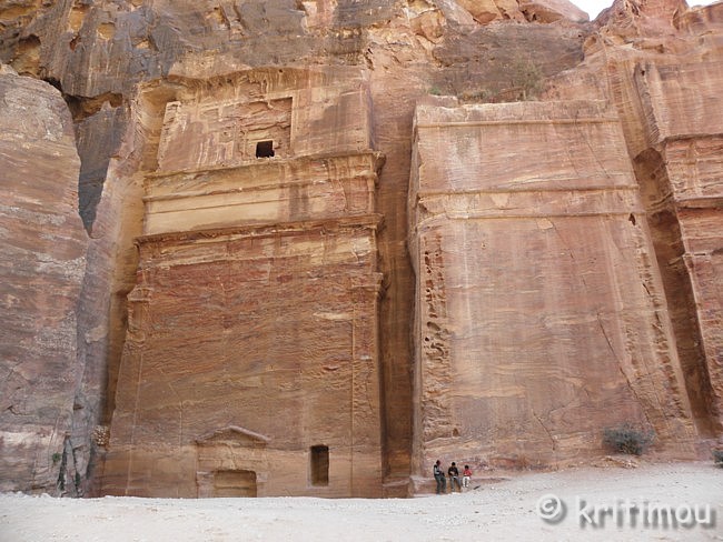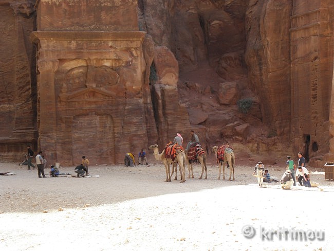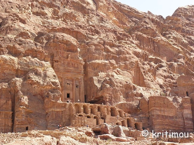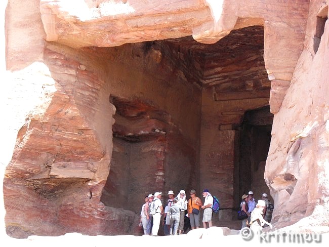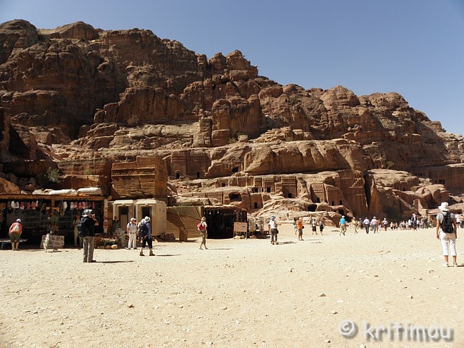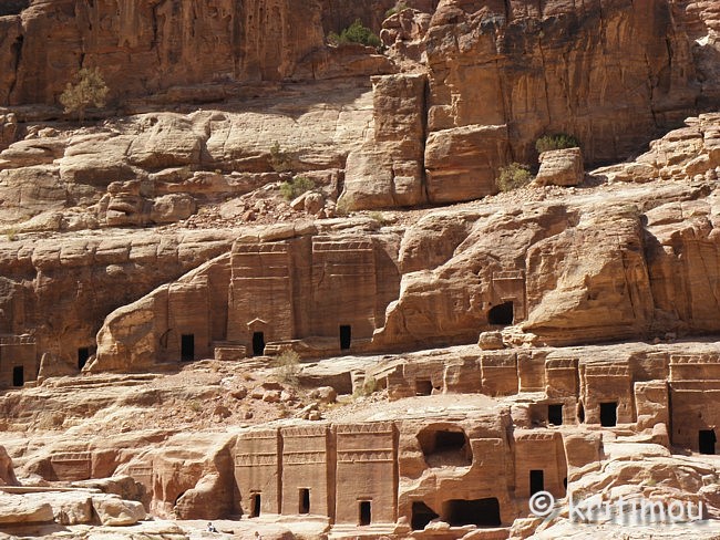 Noch gefangen von der Anziehungskraft, die das Khazne auf uns ausgeübt hat, biegen wir um die Ecke und finden ein ganz anderes Panorama vor. Zunächst gelangen wir auf einen kurzen Stichweg, den Äußeren Siq, der beiderseits umstanden ist von beeindruckend hohen und teilweise schon sehr verwitterten Gebäudefassaden. ![]() ![]() ![]() Grab Nr. 70 ![]() Der Äußere Siq mündet in die sogenannte Fassadenstraße, auf der sich die Fronten gleichartig aussehender Zinnen- und Treppengräber homogen aneinanderreihen und einen lebendigen Platz umsäumen. ![]() ![]() ![]() Im Schatten einer Höhle auf der rechten Seite lassen wir uns auf einer steinernen Bank nieder. Von hier aus kann man die gesamte Szene in Ruhe erfassen. Jemand singt ein Lied mit klarer Stimme. Sie gehört einem älteren Beduinen, der vielleicht 10 Meter entfernt am Wegesrand hockt. Eigentlich singt er recht leise, doch das leichte Echo hat verstärkende Wirkung. Viele Händler sind unterwegs, auch Kinder. Sie verkaufen Postkarten, Schmuck und Steine und versuchen oft, dem Vorbeigehenden einen Besuch an einem größeren Verkaufsstand schmackhaft zu machen. Oder einen Ritt auf einem Kamel oder Esel, was auch gerne angenommen wird. ![]() ![]() Marguerite von Geldermalsen, eine Neuseeländerin, beschreibt in ihrem Buch Im Herzen Beduinin ihre Ehe als junge Frau mit einem Beduinen und das Zusammenleben in Petra auf sehr eindrückliche Weise. „Unter uns erstreckte sich Petra wie eine bewohnte Landkarte. Wir sahen die Felsnase unserer Höhle und das Zelt, das man für unsere Hochzeit aufgestellt hatte. Wir sahen Mädchen, die mit Blechkanistern beladene Esel vor sich hertrieben, Ziegenhirten, die Felsstufen hinab ihrer Herde folgten, Holzsammler, Reiter, die gemächlich dahinritten, Souvenirverkäufer – und die Beduinen, die nach Hause eilten. Die ehemals nomadischen Beduinen, deren Stamm ich angehören würde.“ (S. 69) ![]() ![]() ![]() Nach der Aussiedlung (bis 1985) in ein eigens in der Nähe errichtetes Dorf empfand die Autorin das neue Leben in festen Steinhäusern als Verlust einer Lebensweise: „Die Beduinen stellen nicht mehr ihre Ziegenhaarzelte auf den langen, windgepeitschten Bergrücken von Petra auf. Sie wohnen nicht mehr in der Sicherheit ihrer alten Höhlen und schlafen nicht mehr unter dem Sternenhimmel. (...) Die Beduinen haben sich in Umm Sayhun niedergelassen, doch tagsüber bevölkern sie die Ruinen von Petra. Sie lassen sie lebendig werden – sie bringen Touristen mit ihren Eseln zum Großen Opferplatz und zum Kloster, mit ihren Kamelen ins Wadi es-Sabra und zum Jebel Harun, und locken sie mit allen Mitteln in den Schatten auf eine Tasse Minztee.“ (S. 346/7) ![]() Es stimmt, die Menschen gehen in großer Zahl tagsüber ihren offensichtlich gut florierenden Geschäften in Petra nach. Was die Autorin aus ihrer subjektiven Sicht vor dem prägenden Hintergrund ihres Lebens in jener Zeit schildert, erleben wir heute - als Touristen - als ein permanentes Buhlen um unsere Kaufkraft. Nach einigen Stunden geht es uns ziemlich auf die Nerven. Wir fühlen uns auf Geldbringer reduziert, unser Menschsein, unsere augenblicklichen Wünsche und Bedürfnisse bleiben außer Acht. Und umgekehrt fühlt es sich auch so an: Die Geschäftstüchtigkeit überragt die Menschen, die hinter dieser Fassade fast verborgen bleiben. Eine zwischenmenschliche Begegnung jenseits des Business scheint kaum möglich. Auswüchse des (Petra-)Tourismus. Und so mag so mancher Händler denken: Wenn Touristen es sich leisten können, 90 JOD für ein Ticket zu bezahlen oder 200 JOD für eine Übernachtung, dann werden auch ein paar JOD für Andenken übrig bleiben. Und wer nicht fragt, geht leer aus. Also fragt man. Und zwar pausenlos. Der Sänger, den wir eben gehört haben, ist schon seit einiger Zeit verstummt und unterhält sich mit einem Kollegen, während wir langsam unsere Pause beenden und zu einem weiteren Teil unserer Erkundung Petras aufbrechen. Etwas weiter unterhalb, linkerhand, befindet sich ein großes Theater. Man nimmt an, dass die Sitzreihen bis zu 7.000 Personen aufnehmen konnten! Zur Zeit unseres Besuches (Oktober 2010) ist der Theaterbereich für den Publikumsverkehr jedoch nicht zugänglich. ![]() An diesem Bauwerk kann man den Einfluss fremder Kulturen auf den nabatäischen Baustil deutlich nachvollziehen: „Nabatäisch ist der Felsbau der Cavea, die Sitzreihen wurden unmittelbar aus dem gewachsenen Gestein gemeißelt; griechisch ist die Hanglage, zugleich hält sich das Theater in seiner Form jedoch an das römische Halbrund (...).“ (Dumont, S. 339) ![]() Hinter den steinernen Sitzen, in einer Felswand, befinden sich Grabnischen. Sehr außergewöhnlich, dass die Besucher zu jener Zeit die Theateraufführungen mitten in einer Nekropole, im Schatten ihrer Ahnen, erleben wollten, und Laborde interpretierte: „Merkwürdig die Geisteshaltung eines Volkes, das sich so an den Gedanken des Todes gewöhnte, dass es ihm gegenüber unempfindlich wurde.“ (Bourbon, S. 26) Schräg gegenüber dem Theater erkennen wir die glatte Fassade des zwischen 70 und 76 n. Chr. entstandenen Uneishu-Grabes, das auch als Grab Nr. 813 bezeichnet wird. Es gehört zwar zu den Königsgräbern, die noch weiter unterhalb liegen, doch steht es losgelöst an anderer Stelle, über einigen kleineren Grabhöhlen. Uneishu war der Minister der Königin Shaqilat, die mit ihrem Bruder und Gatten Malichus II sechs Jahre lang regierte. ![]() Der geweitete Weg setzt sich fort. Linkerhand befindet sich ein Café mit hölzernen Sitzbänken, wo man auch Lunchpakete, kalte Getränke und einen wundervollen arabischen Mokka mit Kardomom oder schwarzen Tee mit Minzblättern bekommt. All die Köstlichkeiten genießt man mit einem unglaublichen Blick auf die gegenüberliegende Königswand, einen langgezogenen Fels mit monumentalen Gräbern: Ganz links das breite Palastgrab; daneben, halb um die Ecke das korinthische Grab mit der verfallenen Tholos. ![]() Schon recht ve