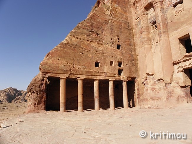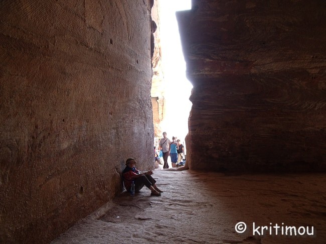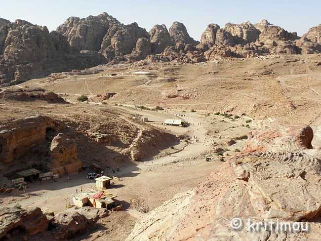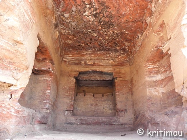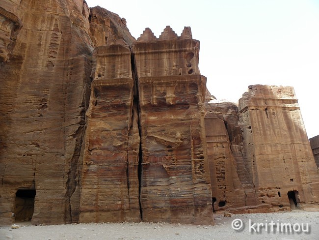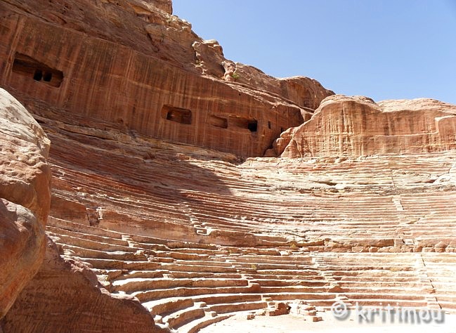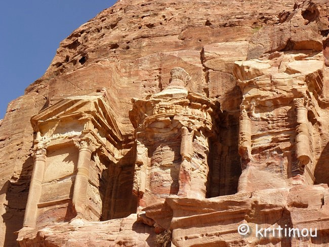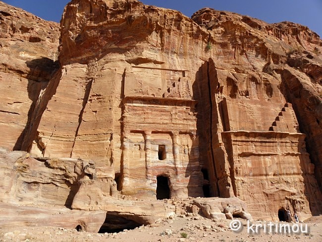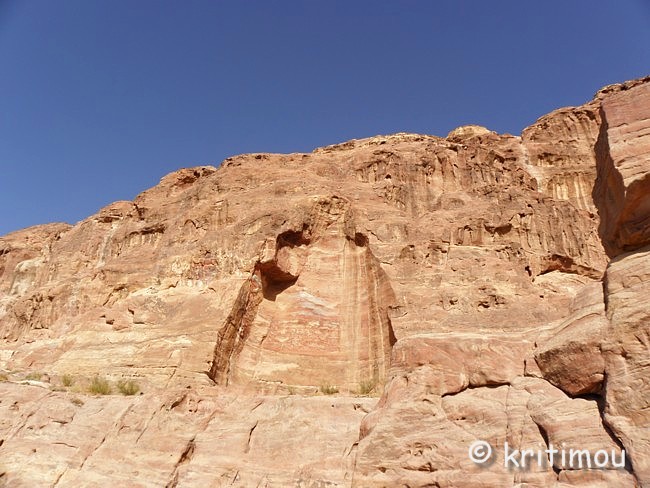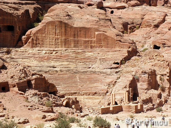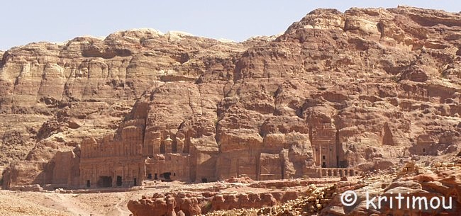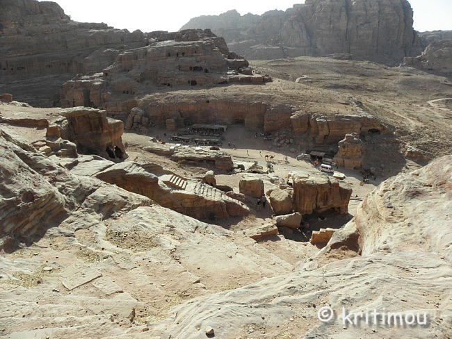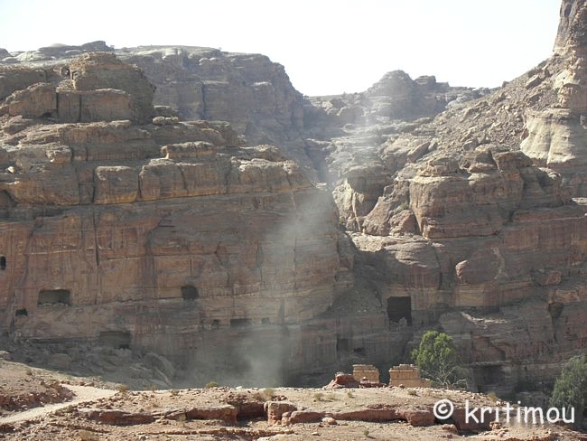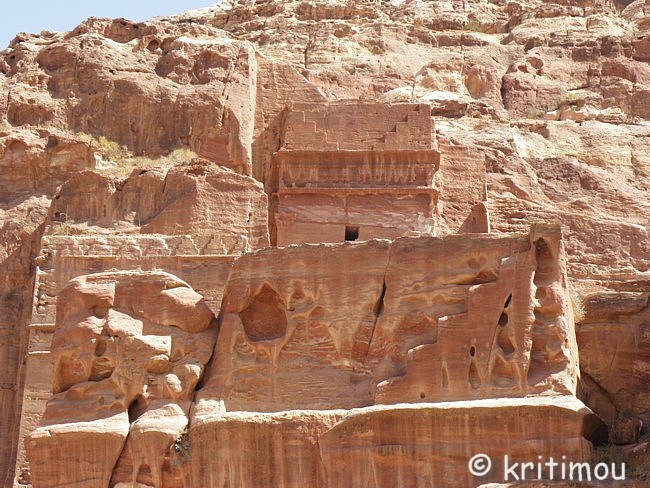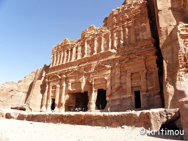 Noch gefangen von der Anziehungskraft, die das Khazne auf uns ausgeübt hat, biegen wir um die Ecke und finden ein ganz anderes Panorama vor. Zunächst gelangen wir auf einen kurzen Stichweg, den Äußeren Siq, der beiderseits umstanden ist von beeindruckend hohen und teilweise schon sehr verwitterten Gebäudefassaden. ![]() ![]() ![]() Grab Nr. 70 ![]() Der Äußere Siq mündet in die sogenannte Fassadenstraße, auf der sich die Fronten gleichartig aussehender Zinnen- und Treppengräber homogen aneinanderreihen und einen lebendigen Platz umsäumen. ![]() ![]() ![]() Im Schatten einer Höhle auf der rechten Seite lassen wir uns auf einer steinernen Bank nieder. Von hier aus kann man die gesamte Szene in Ruhe erfassen. Jemand singt ein Lied mit klarer Stimme. Sie gehört einem älteren Beduinen, der vielleicht 10 Meter entfernt am Wegesrand hockt. Eigentlich singt er recht leise, doch das leichte Echo hat verstärkende Wirkung. Viele Händler sind unterwegs, auch Kinder. Sie verkaufen Postkarten, Schmuck und Steine und versuchen oft, dem Vorbeigehenden einen Besuch an einem größeren Verkaufsstand schmackhaft zu machen. Oder einen Ritt auf einem Kamel oder Esel, was auch gerne angenommen wird. ![]() ![]() Marguerite von Geldermalsen, eine Neuseeländerin, beschreibt in ihrem Buch Im Herzen Beduinin ihre Ehe als junge Frau mit einem Beduinen und das Zusammenleben in Petra auf sehr eindrückliche Weise. „Unter uns erstreckte sich Petra wie eine bewohnte Landkarte. Wir sahen die Felsnase unserer Höhle und das Zelt, das man für unsere Hochzeit aufgestellt hatte. Wir sahen Mädchen, die mit Blechkanistern beladene Esel vor sich hertrieben, Ziegenhirten, die Felsstufen hinab ihrer Herde folgten, Holzsammler, Reiter, die gemächlich dahinritten, Souvenirverkäufer – und die Beduinen, die nach Hause eilten. Die ehemals nomadischen Beduinen, deren Stamm ich angehören würde.“ (S. 69) ![]() ![]() ![]() Nach der Aussiedlung (bis 1985) in ein eigens in der Nähe errichtetes Dorf empfand die Autorin das neue Leben in festen Steinhäusern als Verlust einer Lebensweise: „Die Beduinen stellen nicht mehr ihre Ziegenhaarzelte auf den langen, windgepeitschten Bergrücken von Petra auf. Sie wohnen nicht mehr in der Sicherheit ihrer alten Höhlen und schlafen nicht mehr unter dem Sternenhimmel. (...) Die Beduinen haben sich in Umm Sayhun niedergelassen, doch tagsüber bevölkern sie die Ruinen von Petra. Sie lassen sie lebendig werden – sie bringen Touristen mit ihren Eseln zum Großen Opferplatz und zum Kloster, mit ihren Kamelen ins Wadi es-Sabra und zum Jebel Harun, und locken sie mit allen Mitteln in den Schatten auf eine Tasse Minztee.“ (S. 346/7) ![]() Es stimmt, die Menschen gehen in großer Zahl tagsüber ihren offensichtlich gut florierenden Geschäften in Petra nach. Was die Autorin aus ihrer subjektiven Sicht vor dem prägenden Hintergrund ihres Lebens in jener Zeit schildert, erleben wir heute - als Touristen - als ein permanentes Buhlen um unsere Kaufkraft. Nach einigen Stunden geht es uns ziemlich auf die Nerven. Wir fühlen uns auf Geldbringer reduziert, unser Menschsein, unsere augenblicklichen Wünsche und Bedürfnisse bleiben außer Acht. Und umgekehrt fühlt es sich auch so an: Die Geschäftstüchtigkeit überragt die Menschen, die hinter dieser Fassade fast verborgen bleiben. Eine zwischenmenschliche Begegnung jenseits des Business scheint kaum möglich. Auswüchse des (Petra-)Tourismus. Und so mag so mancher Händler denken: Wenn Touristen es sich leisten können, 90 JOD für ein Ticket zu bezahlen oder 200 JOD für eine Übernachtung, dann werden auch ein paar JOD für Andenken übrig bleiben. Und wer nicht fragt, geht leer aus. Also fragt man. Und zwar pausenlos. Der Sänger, den wir eben gehört haben, ist schon seit einiger Zeit verstummt und unterhält sich mit einem Kollegen, während wir langsam unsere Pause beenden und zu einem weiteren Teil unserer Erkundung Petras aufbrechen. Etwas weiter unterhalb, linkerhand, befindet sich ein großes Theater. Man nimmt an, dass die Sitzreihen bis zu 7.000 Personen aufnehmen konnten! Zur Zeit unseres Besuches (Oktober 2010) ist der Theaterbereich für den Publikumsverkehr jedoch nicht zugänglich. ![]() An diesem Bauwerk kann man den Einfluss fremder Kulturen auf den nabatäischen Baustil deutlich nachvollziehen: „Nabatäisch ist der Felsbau der Cavea, die Sitzreihen wurden unmittelbar aus dem gewachsenen Gestein gemeißelt; griechisch ist die Hanglage, zugleich hält sich das Theater in seiner Form jedoch an das römische Halbrund (...).“ (Dumont, S. 339) ![]() Hinter den steinernen Sitzen, in einer Felswand, befinden sich Grabnischen. Sehr außergewöhnlich, dass die Besucher zu jener Zeit die Theateraufführungen mitten in einer Nekropole, im Schatten ihrer Ahnen, erleben wollten, und Laborde interpretierte: „Merkwürdig die Geisteshaltung eines Volkes, das sich so an den Gedanken des Todes gewöhnte, dass es ihm gegenüber unempfindlich wurde.“ (Bourbon, S. 26) Schräg gegenüber dem Theater erkennen wir die glatte Fassade des zwischen 70 und 76 n. Chr. entstandenen Uneishu-Grabes, das auch als Grab Nr. 813 bezeichnet wird. Es gehört zwar zu den Königsgräbern, die noch weiter unterhalb liegen, doch steht es losgelöst an anderer Stelle, über einigen kleineren Grabhöhlen. Uneishu war der Minister der Königin Shaqilat, die mit ihrem Bruder und Gatten Malichus II sechs Jahre lang regierte. ![]() Der geweitete Weg setzt sich fort. Linkerhand befindet sich ein Café mit hölzernen Sitzbänken, wo man auch Lunchpakete, kalte Getränke und einen wundervollen arabischen Mokka mit Kardomom oder schwarzen Tee mit Minzblättern bekommt. All die Köstlichkeiten genießt man mit einem unglaublichen Blick auf die gegenüberliegende Königswand, einen langgezogenen Fels mit monumentalen Gräbern: Ganz links das breite Palastgrab; daneben, halb um die Ecke das korinthische Grab mit der verfallenen Tholos. ![]() Schon recht ve