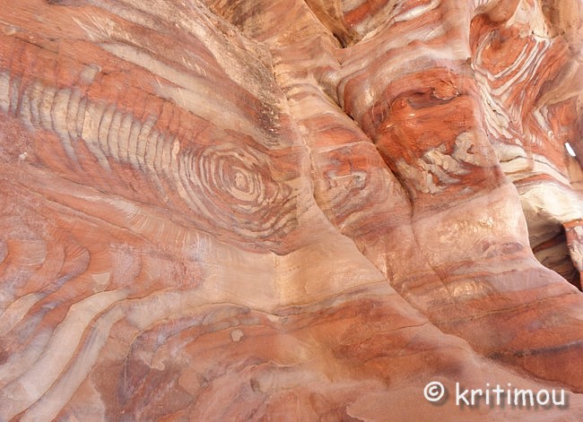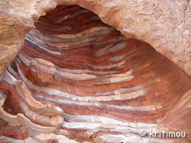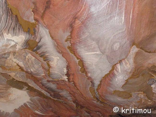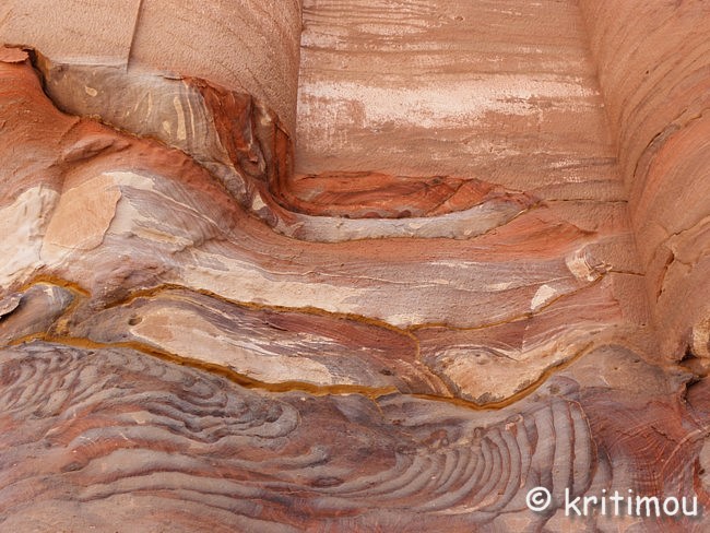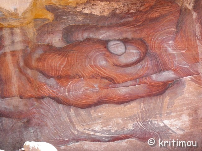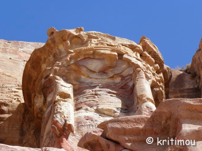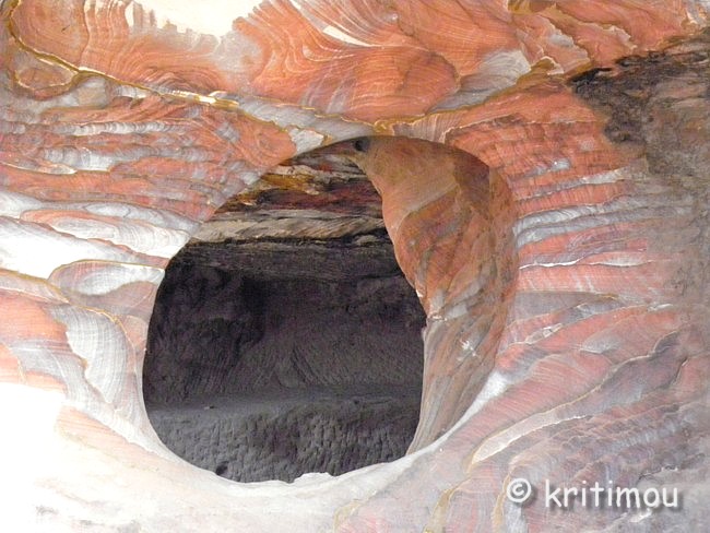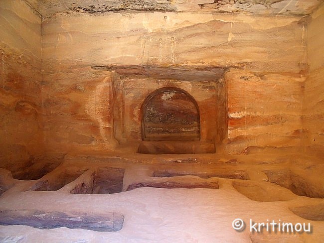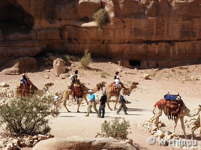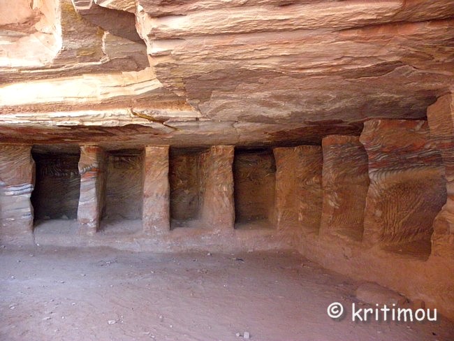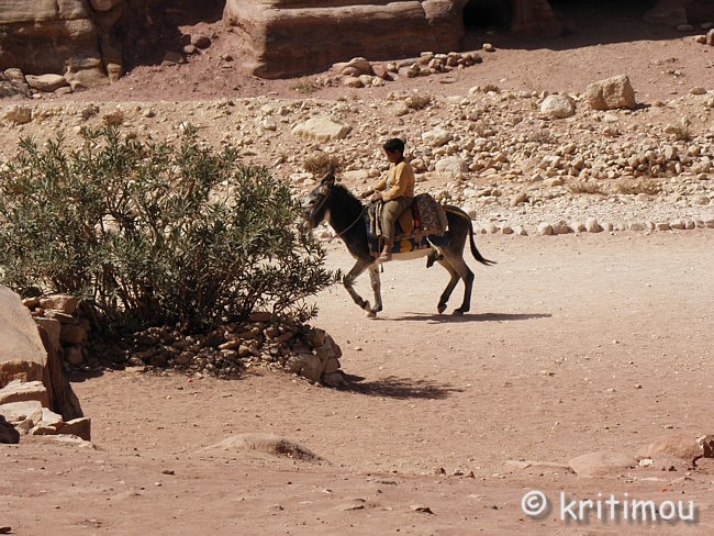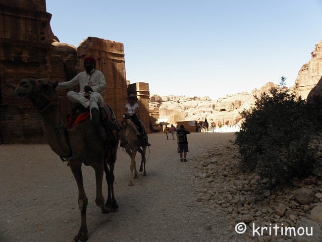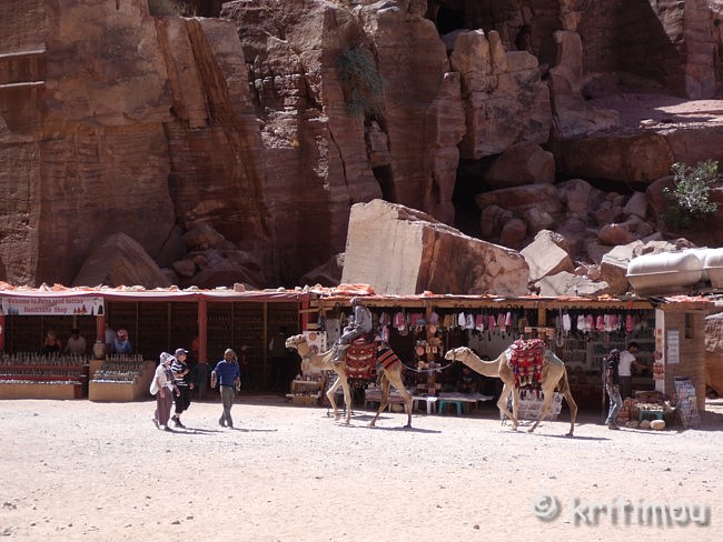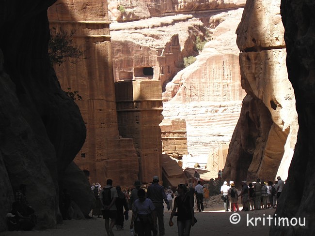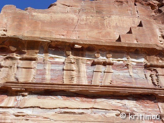 Noch gefangen von der Anziehungskraft, die das Khazne auf uns ausgeübt hat, biegen wir um die Ecke und finden ein ganz anderes Panorama vor. Zunächst gelangen wir auf einen kurzen Stichweg, den Äußeren Siq, der beiderseits umstanden ist von beeindruckend hohen und teilweise schon sehr verwitterten Gebäudefassaden. ![]() ![]() ![]() Grab Nr. 70 ![]() Der Äußere Siq mündet in die sogenannte Fassadenstraße, auf der sich die Fronten gleichartig aussehender Zinnen- und Treppengräber homogen aneinanderreihen und einen lebendigen Platz umsäumen. ![]() ![]() ![]() Im Schatten einer Höhle auf der rechten Seite lassen wir uns auf einer steinernen Bank nieder. Von hier aus kann man die gesamte Szene in Ruhe erfassen. Jemand singt ein Lied mit klarer Stimme. Sie gehört einem älteren Beduinen, der vielleicht 10 Meter entfernt am Wegesrand hockt. Eigentlich singt er recht leise, doch das leichte Echo hat verstärkende Wirkung. Viele Händler sind unterwegs, auch Kinder. Sie verkaufen Postkarten, Schmuck und Steine und versuchen oft, dem Vorbeigehenden einen Besuch an einem größeren Verkaufsstand schmackhaft zu machen. Oder einen Ritt auf einem Kamel oder Esel, was auch gerne angenommen wird. ![]() ![]() Marguerite von Geldermalsen, eine Neuseeländerin, beschreibt in ihrem Buch Im Herzen Beduinin ihre Ehe als junge Frau mit einem Beduinen und das Zusammenleben in Petra auf sehr eindrückliche Weise. „Unter uns erstreckte sich Petra wie eine bewohnte Landkarte. Wir sahen die Felsnase unserer Höhle und das Zelt, das man für unsere Hochzeit aufgestellt hatte. Wir sahen Mädchen, die mit Blechkanistern beladene Esel vor sich hertrieben, Ziegenhirten, die Felsstufen hinab ihrer Herde folgten, Holzsammler, Reiter, die gemächlich dahinritten, Souvenirverkäufer – und die Beduinen, die nach Hause eilten. Die ehemals nomadischen Beduinen, deren Stamm ich angehören würde.“ (S. 69) ![]() ![]() ![]() Nach der Aussiedlung (bis 1985) in ein eigens in der Nähe errichtetes Dorf empfand die Autorin das neue Leben in festen Steinhäusern als Verlust einer Lebensweise: „Die Beduinen stellen nicht mehr ihre Ziegenhaarzelte auf den langen, windgepeitschten Bergrücken von Petra auf. Sie wohnen nicht mehr in der Sicherheit ihrer alten Höhlen und schlafen nicht mehr unter dem Sternenhimmel. (...) Die Beduinen haben sich in Umm Sayhun niedergelassen, doch tagsüber bevölkern sie die Ruinen von Petra. Sie lassen sie lebendig werden – sie bringen Touristen mit ihren Eseln zum Großen Opferplatz und zum Kloster, mit ihren Kamelen ins Wadi es-Sabra und zum Jebel Harun, und locken sie mit allen Mitteln in den Schatten auf eine Tasse Minztee.“ (S. 346/7) ![]() Es stimmt, die Menschen gehen in großer Zahl tagsüber ihren offensichtlich gut florierenden Geschäften in Petra nach. Was die Autorin aus ihrer subjektiven Sicht vor dem prägenden Hintergrund ihres Lebens in jener Zeit schildert, erleben wir heute - als Touristen - als ein permanentes Buhlen um unsere Kaufkraft. Nach einigen Stunden geht es uns ziemlich auf die Nerven. Wir fühlen uns auf Geldbringer reduziert, unser Menschsein, unsere augenblicklichen Wünsche und Bedürfnisse bleiben außer Acht. Und umgekehrt fühlt es sich auch so an: Die Geschäftstüchtigkeit überragt die Menschen, die hinter dieser Fassade fast verborgen bleiben. Eine zwischenmenschliche Begegnung jenseits des Business scheint kaum möglich. Auswüchse des (Petra-)Tourismus. Und so mag so mancher Händler denken: Wenn Touristen es sich leisten können, 90 JOD für ein Ticket zu bezahlen oder 200 JOD für eine Übernachtung, dann werden auch ein paar JOD für Andenken übrig bleiben. Und wer nicht fragt, geht leer aus. Also fragt man. Und zwar pausenlos. Der Sänger, den wir eben gehört haben, ist schon seit einiger Zeit verstummt und unterhält sich mit einem Kollegen, während wir langsam unsere Pause beenden und zu einem weiteren Teil unserer Erkundung Petras aufbrechen. Etwas weiter unterhalb, linkerhand, befindet sich ein großes Theater. Man nimmt an, dass die Sitzreihen bis zu 7.000 Personen aufnehmen konnten! Zur Zeit unseres Besuches (Oktober 2010) ist der Theaterbereich für den Publikumsverkehr jedoch nicht zugänglich. ![]() An diesem Bauwerk kann man den Einfluss fremder Kulturen auf den nabatäischen Baustil deutlich nachvollziehen: „Nabatäisch ist der Felsbau der Cavea, die Sitzreihen wurden unmittelbar aus dem gewachsenen Gestein gemeißelt; griechisch ist die Hanglage, zugleich hält sich das Theater in seiner Form jedoch an das römische Halbrund (...).“ (Dumont, S. 339) ![]() Hinter den steinernen Sitzen, in einer Felswand, befinden sich Grabnischen. Sehr außergewöhnlich, dass die Besucher zu jener Zeit die Theateraufführungen mitten in einer Nekropole, im Schatten ihrer Ahnen, erleben wollten, und Laborde interpretierte: „Merkwürdig die Geisteshaltung eines Volkes, das sich so an den Gedanken des Todes gewöhnte, dass es ihm gegenüber unempfindlich wurde.“ (Bourbon, S. 26) Schräg gegenüber dem Theater erkennen wir die glatte Fassade des zwischen 70 und 76 n. Chr. entstandenen Uneishu-Grabes, das auch als Grab Nr. 813 bezeichnet wird. Es gehört zwar zu den Königsgräbern, die noch weiter unterhalb liegen, doch steht es losgelöst an anderer Stelle, über einigen kleineren Grabhöhlen. Uneishu war der Minister der Königin Shaqilat, die mit ihrem Bruder und Gatten Malichus II sechs Jahre lang regierte. ![]() Der geweitete Weg setzt sich fort. Linkerhand befindet sich ein Café mit hölzernen Sitzbänken, wo man auch Lunchpakete, kalte Getränke und einen wundervollen arabischen Mokka mit Kardomom oder schwarzen Tee mit Minzblättern bekommt. All die Köstlichkeiten genießt man mit einem unglaublichen Blick auf die gegenüberliegende Königswand, einen langgezogenen Fels mit monumentalen Gräbern: Ganz links das breite Palastgrab; daneben, halb um die Ecke das korinthische Grab mit der verfallenen Tholos. ![]() Schon recht ve