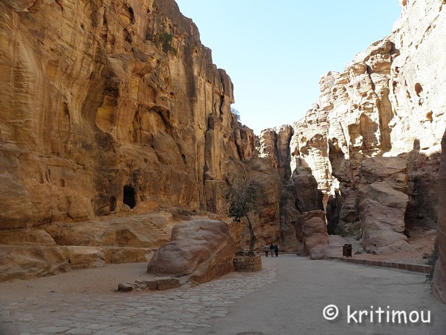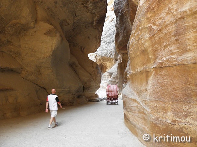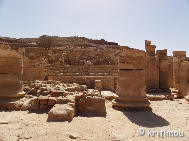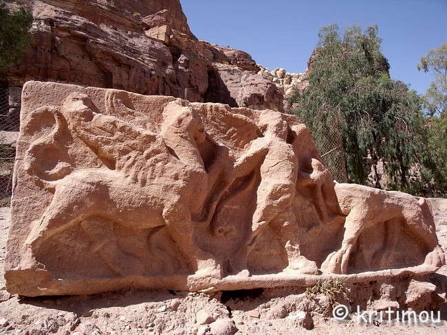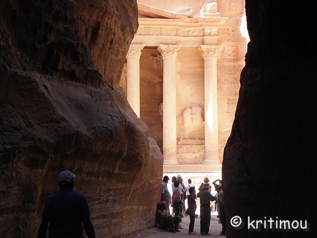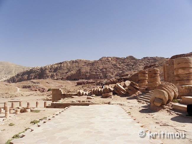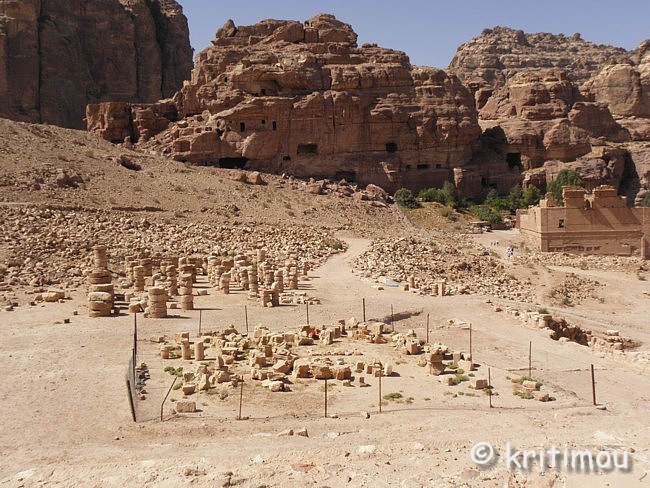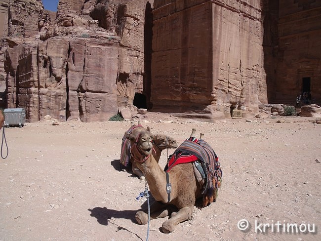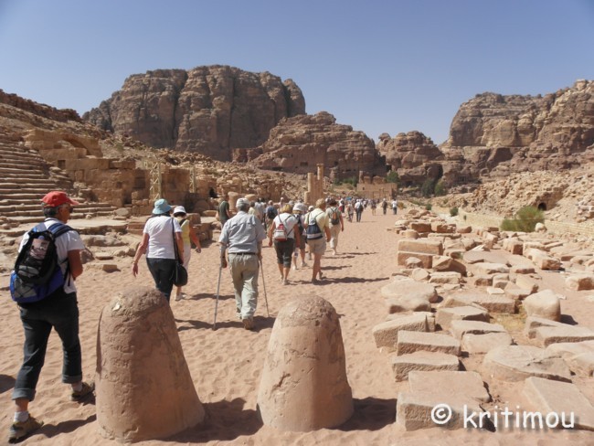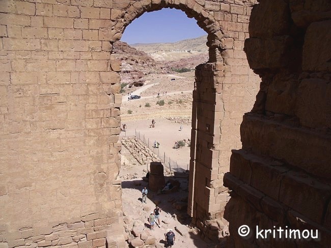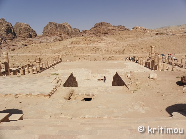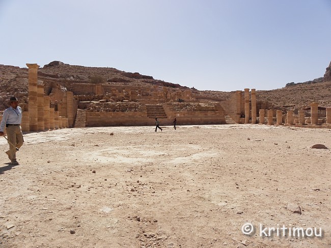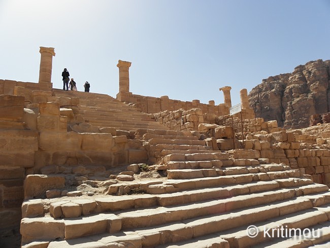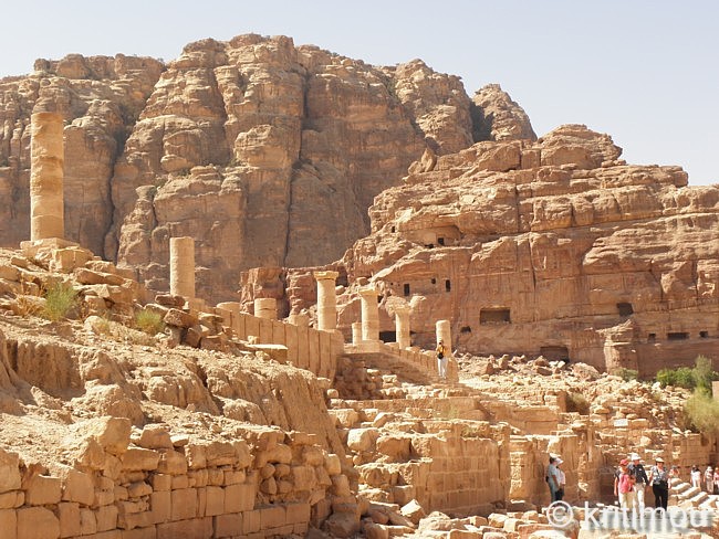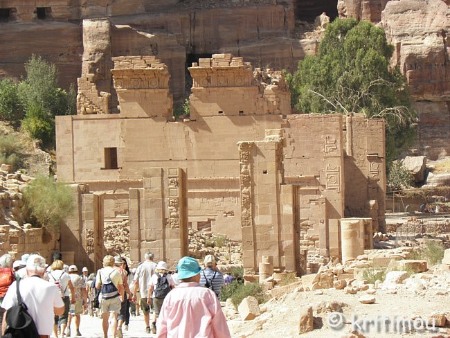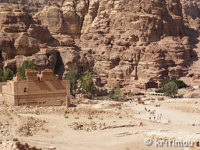 Wie gut, dass wir noch einen zweiten Tag in Petra haben! Für heute haben wir uns vorgenommen, das eigentliche Stadtgebiet Petras und Ed-Deir zu besichtigen, das auch das „Kloster“ genannt wird. Doch bei Ed-Deir handelt es sich ebenso wenig um ein „Kloster“ wir beim Khazne um ein „Schatzhaus“, sondern vielmehr um ein weiteres monumentales, hoch oben in den Bergen gelegenes Mausoleum. Die Abfahrtszeit des vielgepriesenen, kostenlosen Shuttle-Busses des Hotels wird uns auf Nachfrage mit „at any time“ angekündigt, während sich der Zuständige im Sessel räkelt und überhaupt nichts tut. Wir nehmen daraufhin ein Taxi. Die Taxipreise variieren von Mal zu Mal: An diesem Morgen kostet eine Fahrt 3 JOD, am Abend in umgekehrter Richtung 5 JOD und ein anderes Mal 2 JOD. Man kann also nach Herzenslust handeln. Der Fahrer des Taxis an diesem Morgen ist sehr gut aufgelegt. Er spricht Alex auf Arabisch an und legt eine CD auf mit Musik von Fayruz, der berühmten libanesischen Sängerin. Während wir also die kurze Strecke bergab in Richtung Petra rollen, genießen wir für einen Augenblick diese vollkommene Musik, Alex mit feuchten Augen, der Fahrer mit glücklichem Gesicht und ich ebenfalls entzückt ob dieser spontanen Darbietung: A best Song Nachdem uns der Taxifahrer am Visitor Center in Petra abgesetzt hat, beschließen wir, heute mit dem Pferd bis zum Eingang des Siq zu reiten. Noch nie habe ich auf einem Ross gesessen. Mit Kennerblick bietet mir einer der Guides ein zahmes, weißes Pferdchen an. Als wir lostraben, sitze ich ganz komfortabel, habe aber nach ein paar Metern das Gefühl, seitlich herunterzukippen. Das Pferd ist geduldig und erfahren, denn es dreht sein Hinterteil genau in die richtige Richtung, um mir Halt zu geben, bis ich mich an den Sitz gewöhnt habe. Wenig später überhole ich Alex lässig in leichtem Trabschritt, der auf seinem nicht minder zahmen Gaul verwegen wie Indiana Jones daherreitet. Am Ziel angekommen möchten wir jedem der Guides 1 JOD Bakschisch in die Hand drücken, denn der Ritt war im Ticket inbegriffen. Doch sie verlangen jeder 5 JOD! Das kann doch wohl nicht wahr sein! Auch unser Hinweis auf das Ticket interessiert sie nicht, denn schließlich müssten die Pferde ja versorgt werden. Wir geben ihnen verärgert 5 JOD zusammen und beschließen, heute überhaupt keine ihrer Dienste mehr in Anspruch zu nehmen. Erst als wir die Schlucht betreten, verfliegt der Ärger wieder. Und ein weiteres Mal erleben wir die eigentümliche Atmosphäre in diesem Felsriss, dem langgezogenen Eintritt nach Petra. ![]() ![]() ![]() Am Khazne angelangt bestaunen wir wieder für eine Weile mit vielen anderen Besuchern die einzigartige Fassade und erleben die Atmosphäre drum herum. ![]() ![]() ![]() ![]() Wir möchten weiter, haben noch einen ordentlichen Fußmarsch vor uns, durchqueren den Äußeren Siq, bewundern einmal mehr die unzähligen Fassaden und die Architektur des Theaters und lassen uns von der Monumentalität der Königsgräber beeindrucken. Die Sicht auf diese Königswand hat sich seit gestern – neben dem Khazne – zu meinem Lieblingsblick hier entwickelt. Es ist die Einzigartigkeit der einzelnen Gebäude und ihr harmonisches Zusammenspiel, was mich so fasziniert. Im Verlauf unseres weiteren Weges werden wir zwischendurch immer wieder die Aussicht auf diese Wand haben, die auch aus luftiger Höhe als etwas Besonderes erscheint; dann besticht allerdings – in meinen Augen – weniger das Urnengrab, sondern eindeutig das breite Palastgrab links außen. Auf dem Boden, in der Nähe der Königswand, sitzt ein älterer Mann und spielt ein Instrument mit einer Saite, die aus Ziegenhaar gezwirbelt ist, ebenso wie der Streichbogen. Wir hören ihm eine Weile zu, die Musik klingt eigentümlich und wiederholt immer wieder dieselbe Tonfolge. ![]() ![]() Nach diesem kurzen Zwischenspiel biegen wir nach links in die Säulenstraße ein. Erst hier beginnt der innere Stadtbezirk Petras, im hinteren Teil begrenzt vom Temenos-Tor, das einmal mit schweren Holztüren versehen war, und den heiligen Bezirk Petras vom Rest der Stadt trennte. ![]() ![]() Die Säulenstraße ist nicht vergleichbar mit der von Jerash, die jetzt sichtbaren Säulenstümpfe in Petra wurden rekonstruiert. Allerdings ist es leicht vorstellbar, wie der gepflasterte Weg von großartigen Bauten umsäumt war. Es gab ein Nymphäum, von dem heute leider auch nicht mehr viel zu sehen ist. Jedoch stehen im hinteren Teil der Straße, auf der linken Seite, zwei interessante Ruinen: zum einen die des Großen Tempels, und daneben die von Qasr el-Bint. Steigt man die wenigen Stufen zum Großen Tempel empor, dem größten freistehenden Gebäude Petras mit einer Grundfläche von über 7.500 qm, erreicht man zunächst eine große rechteckige Steinterrasse. ![]() ![]() ![]() An der einen Seite der Freifläche wird gerade ein Videoclip gedreht. Eine – wie es scheint - bekannte junge Sängerin zieht die Aufmerksamkeit der Jugendlichen auf sich, die bewundernd in einigem Abstand zuschauen dürfen, wie immer wieder dieselbe Stelle des Musikstücks abgespielt wird und die junge Frau sich dazu bewegt. Gegen die Sonne wurden große Schirme aufgespannt, die Crew ist voll bei der Sache. Hinter der Freifläche befinden sich weitere Gebäudeteile, die um das Allerheiligste angelegt sind, darunter sogar ein Theater, das etwa 600 Personen fasste; die Ruinen eines nabatäischen Bades und mehrerer Zisternen konnten neben dem Tempel freigelegt werden. ![]() Besondere Verdienste haben sich Mitglieder der Brown University in Providence, Rhode Island/USA erworben, die mit der Abteilung für Antiquitäten/Jordanien diese Ausgrabungen seit 1993 vorgenommen haben. Die Restaurierung dauert gegenwärtig noch an. ![]() ![]() ![]() Eine ältere Beduinin sitzt auf einem erhöhten Mauervorsprung und lädt mich ein, neben ihr im Schatten Platz zu nehmen, es sei sehr heiß. Sie sitzt dort alleine und hat ihr spärliches Angebot am Rand der Fre