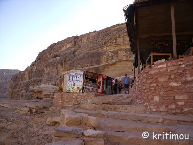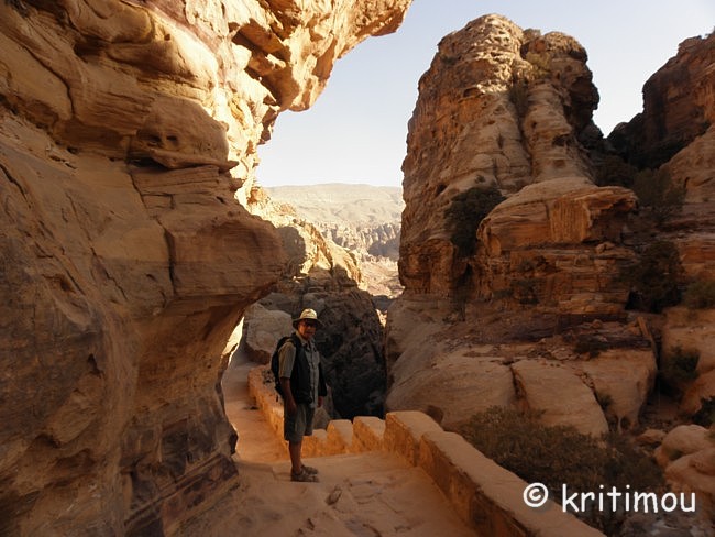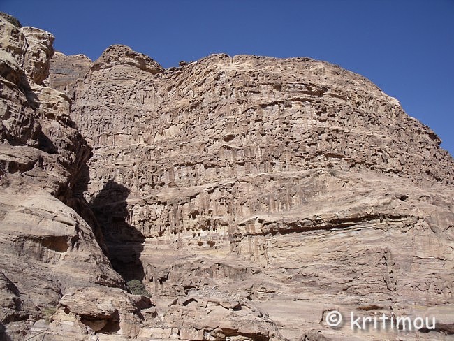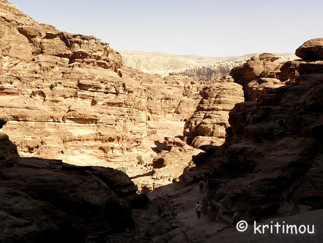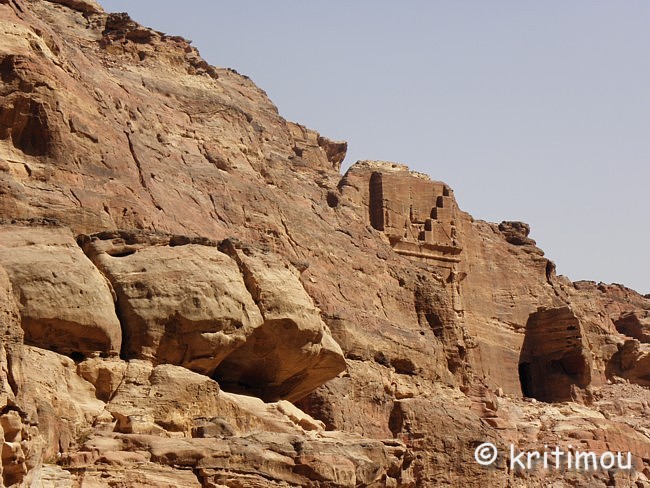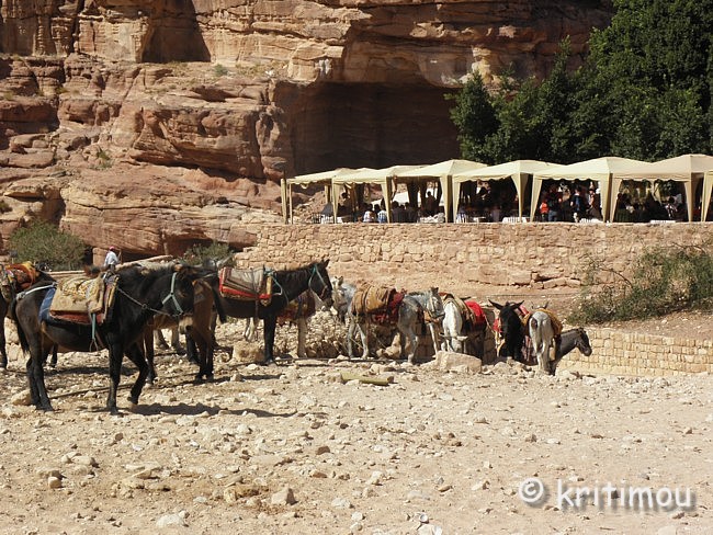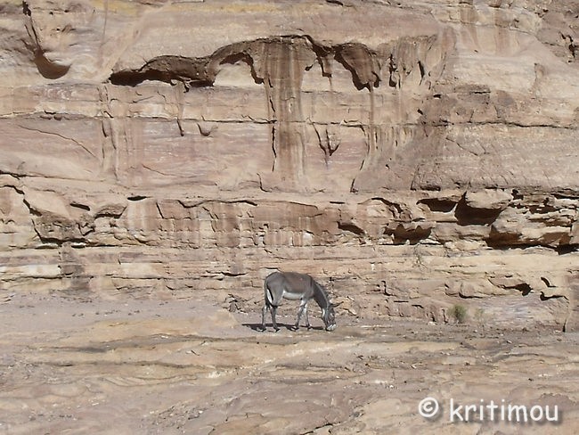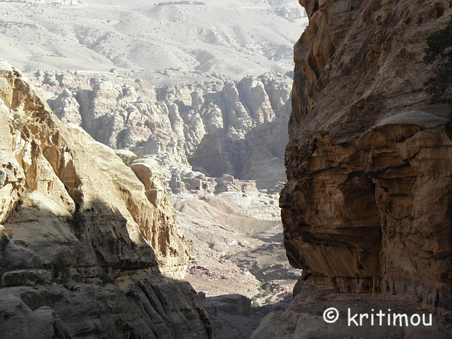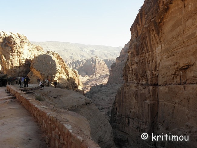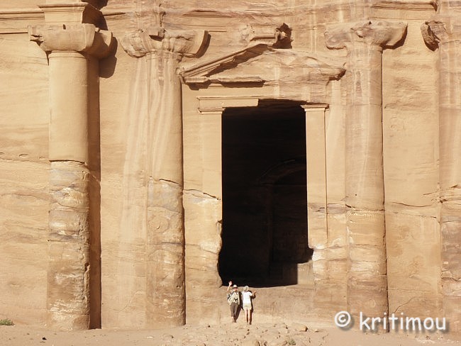 Vom Eingang des Qasr el-Bint aus sehen wir die Zelte des gut besetzten Open-Air-Restaurants, aus dem es verführerisch duftet, und den Parkplatz für die Biotaxis. ![]() Man bedeutet uns, durch das Restaurant zu gehen und vorbei am sich anschließenden Museums-Gebäude, für das wir bei unserem nur zweitägigen Aufenthalt leider auch keine Zeit mehr haben werden. Ab hier beginnt der Prozessionsweg nach Ed-Deir in den Bergen. ![]() Zunächst weichen wir jedoch etwas vom Hauptweg ab und steigen in einer kleinen Nebenschlucht auf zu einer Plattform mit zwei Gräbern und, rechts daneben, dem Löwentriklinium. ![]() Noch zu erkennen, wenn auch schon ziemlich verwittert, sind die Löwen rechts und links des Eingangs und die beiden Medusenköpfe auf dem Fries darüber. ![]() ![]() Nach der Besichtigung begeben wir uns wieder auf den Hauptpfad nach Ed-Deir. An einer Schlucht entlang führt er zu einem großen Teil über Treppenstufen; insgesamt sollen es über 800 sein. Glücklicherweise liegt der Weg weitestgehend im Schatten, sodass wir die Hitze kaum spüren. ![]() ![]() ![]() ![]() Ab und an stehen auf dem Weg auch Stände mit touristischen Andenken, aber längst nicht in einer solchen Dichte wie unten in der Nekropole. Immer wieder passieren uns Esels- und Pferdekarawanen aus beiden Richtungen, mit und ohne Personenfracht. ![]() Ein Eselchen mit seinem Führer möchte uns überholen. Wir treten zur Seite. Bei jedem Schritt entweicht aus den hinteren Regionen des Esels Luft, was sehr lustig klingt. Es wird viel gelacht, doch ist man froh, als das von Blähungen geplagte Tier weitergezogen ist. Immer höher steigen wir bergan, wobei ich feststelle, dass die ausgewaschenen nabatäischen Treppen wesentlich einfacher zu gehen sind als die neuen, kantigen. Sehr interessant wiederum die kleinen Details: erodierte Felsen, verwitterte Reliefs und Fassaden und bizarre Gebilde, vom Wind oder von Menschenhand geformt? ![]() ![]() ![]() Zwischenzeitlich bieten sich atemberaubende Ausblicke!