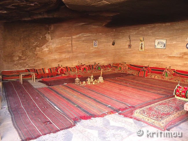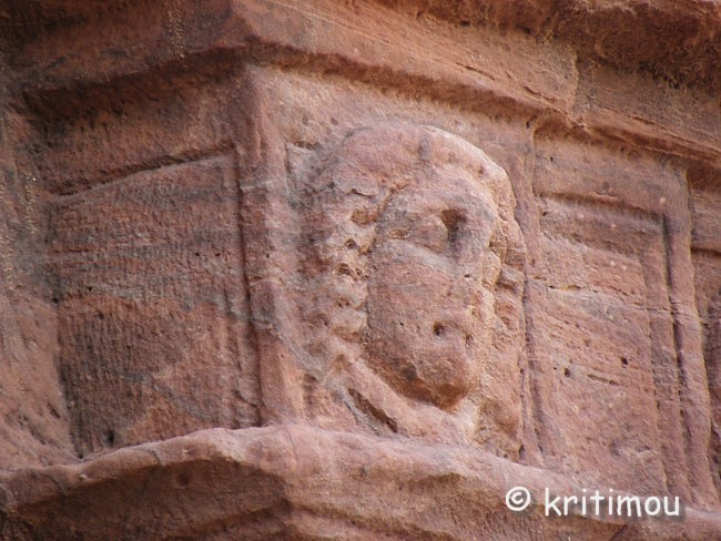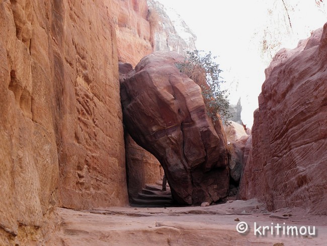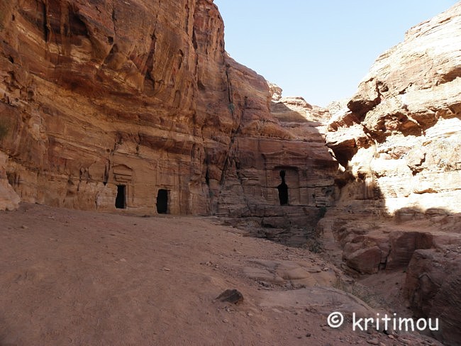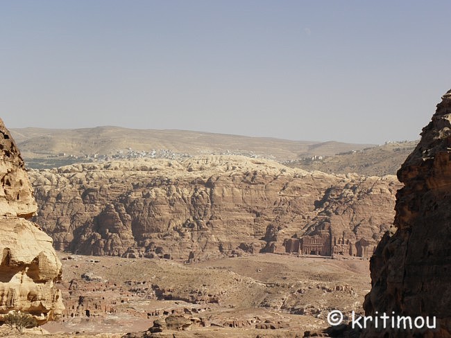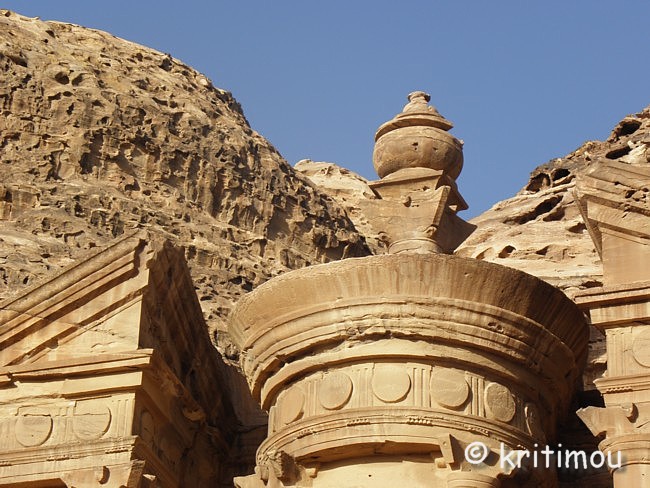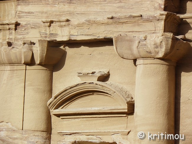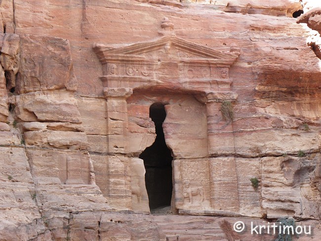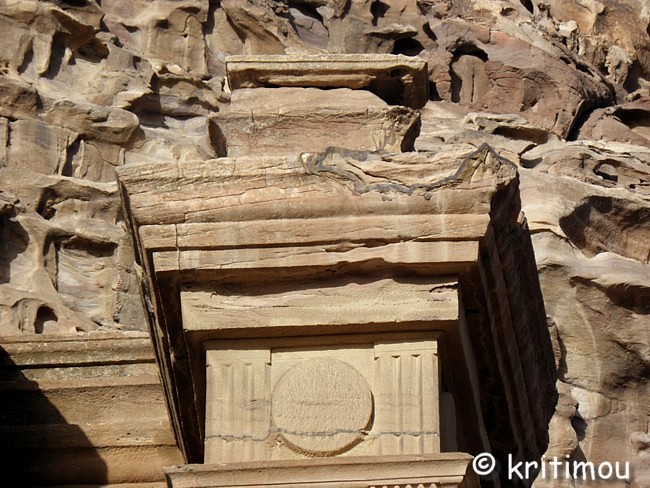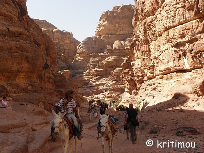 Vom Eingang des Qasr el-Bint aus sehen wir die Zelte des gut besetzten Open-Air-Restaurants, aus dem es verführerisch duftet, und den Parkplatz für die Biotaxis. ![]() Man bedeutet uns, durch das Restaurant zu gehen und vorbei am sich anschließenden Museums-Gebäude, für das wir bei unserem nur zweitägigen Aufenthalt leider auch keine Zeit mehr haben werden. Ab hier beginnt der Prozessionsweg nach Ed-Deir in den Bergen. ![]() Zunächst weichen wir jedoch etwas vom Hauptweg ab und steigen in einer kleinen Nebenschlucht auf zu einer Plattform mit zwei Gräbern und, rechts daneben, dem Löwentriklinium. ![]() Noch zu erkennen, wenn auch schon ziemlich verwittert, sind die Löwen rechts und links des Eingangs und die beiden Medusenköpfe auf dem Fries darüber. ![]() ![]() Nach der Besichtigung begeben wir uns wieder auf den Hauptpfad nach Ed-Deir. An einer Schlucht entlang führt er zu einem großen Teil über Treppenstufen; insgesamt sollen es über 800 sein. Glücklicherweise liegt der Weg weitestgehend im Schatten, sodass wir die Hitze kaum spüren. ![]() ![]() ![]() ![]() Ab und an stehen auf dem Weg auch Stände mit touristischen Andenken, aber längst nicht in einer solchen Dichte wie unten in der Nekropole. Immer wieder passieren uns Esels- und Pferdekarawanen aus beiden Richtungen, mit und ohne Personenfracht. ![]() Ein Eselchen mit seinem Führer möchte uns überholen. Wir treten zur Seite. Bei jedem Schritt entweicht aus den hinteren Regionen des Esels Luft, was sehr lustig klingt. Es wird viel gelacht, doch ist man froh, als das von Blähungen geplagte Tier weitergezogen ist. Immer höher steigen wir bergan, wobei ich feststelle, dass die ausgewaschenen nabatäischen Treppen wesentlich einfacher zu gehen sind als die neuen, kantigen. Sehr interessant wiederum die kleinen Details: erodierte Felsen, verwitterte Reliefs und Fassaden und bizarre Gebilde, vom Wind oder von Menschenhand geformt? ![]() ![]() ![]() Zwischenzeitlich bieten sich atemberaubende Ausblicke!