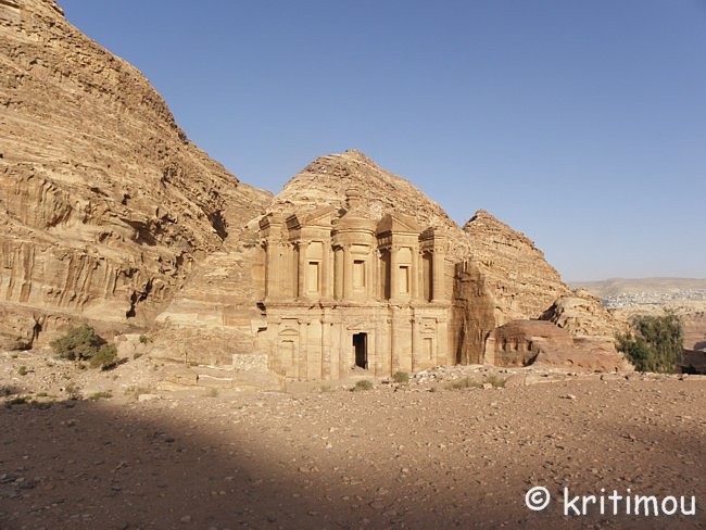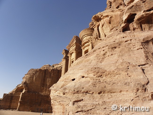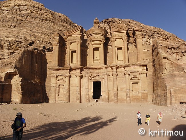 ![]() Und während wir nach oben stapfen, passiert es: Ohne Anlass knicke ich um und stürze auf den Weg. Ich habe mich zwar nicht verletzt, aber der Knöchel tut höllisch weh. Sofort bleibt ein englisches Paar stehen und fragt, ob man helfen kann, während ich versuche, den Schmerz unter Kontrolle zu bekommen. Sogleich eilt eine Beduinin herbei, nicht etwa, um ihre Hilfe anzubieten, sondern um Geschäfte zu machen: „Taxi, Taxi!“ schreit sie mir zu (und meint dabei einen Esel), doch ich winke ab. Tapfer ziehe ich meine Stützsocke, die ich vorsorglich eingepackt habe, aus dem Rucksack und stülpe sie mir über den Fuß. Danach kann ich wieder aufstehen und weitergehen. Bis zu einem kleinen Platz mit einem Open-Air-Café kraxeln wir, wo wir uns für eine Weile niederlassen. ![]() Erfrischende Getränke werden hier angeboten. Insbesondere Lemon schmeckt traumhaft und besteht aus einem Teil frischem Zitronensaft; der Rest des Glases ist aufgefüllt mit Wasser. Frische, gehackte Minze rundet den Geschmack ab. Gut gekühlt - ein göttlicher Nektar (und - Lopedum sei Dank - mache ich mir keine Gedanken mehr darum, ob das Wasser aus der Leitung, einer Zisterne oder einer abgepackten Flasche kommt). Von diesem Platz aus kann man auch die auf- und absteigenden Wanderer beobachten; einige kriechen mit sehr erhitzten Gesichtern den Berg hoch, andere, erprobte Bergbezwinger, kommen recht entspannt und munter hier an, wieder andere lassen sich von Eseln tragen. Ein Eselchen sucht sich sofort seinen Weg zu einer schmalen Felsnase, trittsicher und schwindelfrei. ![]() Am besten gefällt uns jedoch das Panorama von hier oben, der weite Blick über einen Teil der Shara-Berge, den Ort Wadi Musa und die Königswand von Petra mit dem imposanten Palastgrab. Irre! ![]() Nach unserer ausgiebigen Pause nehmen wir den letzten Anstieg. Jetzt reiht sich Stufe an Stufe, flachere Stücke gibt es kaum noch. Humpelnd und ächzend setzen wir Fuß vor Fuß. An einer Stelle führt der Weg einige Meter leicht nach unten, durch einen Felsspalt. Und dann sind wir angekommen: Zu unserer Rechten erblicken wir die Spitzen von Ed-Deir! ![]() Ebenso überraschend, wie der Wanderer das vollendete Khazne zwischen den Wänden des Siq erblickt, genauso unvermittelt steht man vor dem faszinierenden Bauwerk von Ed-Deir, das sich schnörkellos einfach aus einer Felswand heraushebt. ![]() Ed-Deir besitzt eine vollkommen glatte Fassade vor einem gewaltigen Gewölbe, beides nach nabatäischer Art aus dem Sandstein gemeißelt. Die Schönheit des Gebäudes wird durch den Kontrast zwischen seinen glatten Formen, der eleganten Schlichtheit, einer perfekten Symmetrie und den es umgebenden, verwitterten Felsen betont. Das Gebäude misst ca. 50 Meter in der Breite und ist ca. 40 Meter hoch. „Alles ist monumental an Ed-Deir: das Eingangsportal mit ca. 4 Metern Breite und 8 Metern Höhe ebenso wie die krönende Urne über dem Hörnerkapitell der Tholos.“ (Dumont S. 374). Man nimmt an, dass in den jetzt leeren Nischen einmal Statuen standen. ![]() ![]() ![]()