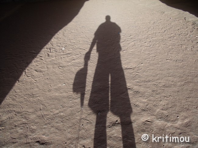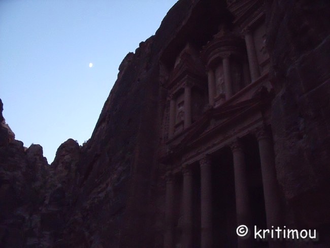 Alex hat eine eigene Art, sich dem Gebäude anzunähern: Er spielt mit Licht und Schatten im Eingang von Ed-Deir. ![]() ![]() Gegenüber, auf der anderen Seite des großen Vorplatzes, nehmen wir später bei einem weiteren Lemon-Getränk in einem Freiluft-Café Platz. ![]() Während Alex ein kleines Spontannickerchen hält, folge ich einem Schild oberhalb des Cafés, das eine Aussicht über die Wüste am Gipfel eines Hügels verspricht. Dabei falle ich fast über ein riesiges Insekt und knicke vor Schreck im Sand wieder sehr schmerzhaft um, trotz Bandage. ![]() Nichts wird es mit einem „Blick über die Wüste"! Ohnehin ist es schon spät geworden, und so humpele ich unverrichteter Dinge wieder zurück. Macht aber nichts, denn ein weiteres Mal verzaubert mich der Anblick von Ed-Deir, und zwar im allerbesten Spätnachmittagslicht. ![]() Eine knappe Stunde werden wir wohl für den Abstieg brauchen, durch das Stadtgebiet Petras gehen bis zum Khazne, den Siq durchqueren und schließlich noch den Kilometer bis zum Ausgang wandern. Das werden wir bei Helligkeit sowieso nicht mehr schaffen, doch wird es beruhigend sein, wieder auf ebener Erde zu sein, bevor es ganz dunkel geworden ist. Beide ächzen wir die Treppen hinunter: Alex mit beginnenden Knieschmerzen, ich wegen des verstauchten Knöchels. Wir stützen uns abwechselnd, achten auf jeden Schritt, kommen aber doch recht schnell voran. Fast alle Händler haben ihre Verkaufszelte hier oben schon abgebaut, auf Esel verladen oder Huckepack die Waren nach unten geschafft. Eine himmlische Ruhe ist eingekehrt. An einem Felsen bleiben wir stehen und nehmen einige schöne, bunte Vögel wahr, die wir aus heimischen Gefilden nicht kennen. Im Trubel zeigen sie sich sicher nicht. Ein junger Mann aus den USA kommt uns entgegen und berichtet spontan und begeistert von einem Gespräch, das er soeben mit einem Mann aus Marokko geführt hat. Dieser habe den ganzen Weg von dort zu Fuß bzw. per Autostopp zurückgelegt. Diese Art zu reisen hat unseren Gesprächspartner ziemlich beeindruckt. Den marokkanischen Wanderer haben auch wir zwar noch gesehen, doch für uns ist er zu schnell unterwegs. Kurz darauf kommt uns tatsächlich noch eine Eselskarawane entgegen. Die Tiere tragen Touristen, offenbar will man noch nach Ed-Deir, obwohl es schon dämmrig geworden ist. Man wird nicht mehr allzu viel erkennen können, und zurück muss man ja auch wieder. Die Frau, die ganz vorne reitet, sitzt merkwürdig schief auf dem Tier, das unbeirrt seinen Weg nach oben sucht. Ganz verkrampft ist ihr Gesicht, während sie ausruft: „I’ m falling down!“, doch niemanden scheint sie zu hören. Der Verantwortliche geht ganz am Ende der Karawane und dürfte die Nöte der Frau kaum mitbekommen, weil er mit dem Antreiben der Tiere beschäftigt ist. Auf ebener Erde wäre das alles nicht gefährlich, doch hier oben, auf Treppenstufen und links eine tiefe, nicht gesicherte Schlucht neben sich, kann man im Dämmerlicht schon das Fürchten lernen, wenn man unsicher ist. Wir setzen unseren Abstieg fort, immer einen Schritt vor den anderen, und schauen genau, wo wir hintreten. Eine andere Eselskarawane ohne Kundschaft auf dem Rücken überholt uns schnellen Schrittes. Eines der Eselchen rutscht auf einer Stufe aus und stürzt. Nicht schlimm, es landet auf seinem Hinterteil und steht auch gleich wieder auf. Doch wo wäre die Fracht gelandet, wenn es beladen gewesen wäre? Angenehm ruhig verläuft der weitere Rückweg. Das Café gegenüber den Königsgräbern ist jedoch voll besetzt. Jetzt ist die Stunde der Einheimischen gekommen, die jungen Leute treffen sich hier. Immer mehr kommen uns entgegen. Die letzten Händler verlassen jetzt Petra, um in ihr Dorf zurückzukehren. Dicke Pickups fahren vor, werden mit Menschen und Waren beladen. Irgendwie sehen alle recht zufrieden aus. Viele junge Burschen haben ihre Pferde bestiegen. Einer gibt seinem Pferd übermütig die Sporen, und Ross und Reiter stürmen über die Ebene, gefolgt von einer dicken Staubfahne, davon. Mittlerweile haben wir das Khazne erreicht, vor dem immer noch jede Menge Leute stehen und beim allerletzten Tageslicht die Fassade fotografieren. ![]() So gerne hätten wir einmal Petra bei Nacht erlebt, eine Veranstaltung, bei der der Vorplatz des Khazne von unzähligen Kerzen erhellt wird und Flötenspieler durch die Lichterreihen schreiten. Als wir den Siq hinaufgehen, wird es gänzlich dunkel. Nichts ist beleuchtet, und so freuen wir uns einmal mehr über die Leuchtkraft des Mondes. Obwohl unsere Beine jetzt wirklich müde sind, lehnen wir eine Fahrt mit dem Pferdewagen für 20 JOD ab und nehmen zusammen mit vielen anderen Petrabesuchern den ansteigenden Weg zum Ausgang in Angriff. Müde und hungrig, aber glücklich über die gelungene körperliche Anstrengung, kehren wir im selben Restaurant (neben einem Hamam) wie am Abend zuvor ein und verdrücken eine ordentliche Portion. Zufälligerweise nimmt der Fußgänger aus Marokko wenig später an unserem Nachbartisch Platz. Sofort scharen sich Einheimische um ihn und hören fasziniert seinen Geschichten zu. Bald erhält er sein Essen. Beim Verlassen des Lokals spreche ich ihn an. Er legt sofort los. Sein Ziel sei auf dieser Reise Palästina, danach würde er ein Buch schreiben. Er habe schon fast alle Länder der Welt bereist. Auf unsere etwas indiskrete Frage nach der Finanzierung entgegnet er, er würde nicht rauchen und fast alle Wege zu Fuß oder per Anhalter zurücklegen. Er schliefe in Hostels und Herbergen, wo er immer sehr preisgünstig unterkomme. Bevor er in ein Land einreise, würde er auch Anträge auf Preisermäßigungen stellen, sodass er sich die Sehenswürdigkeiten für umsonst oder den Preis der Einheimischen ansehen könnte. Für Petra habe er auch nur 1 JOD! gezahlt, wie die Jordanier. Als Alex ihn fragt, ob er hier im Restaurant bekannt sei, meint er, nein, in diesem Lokal sei er noch nie gewesen. Und doch hat man den Eindruck, als ob er alle hier kennen würd