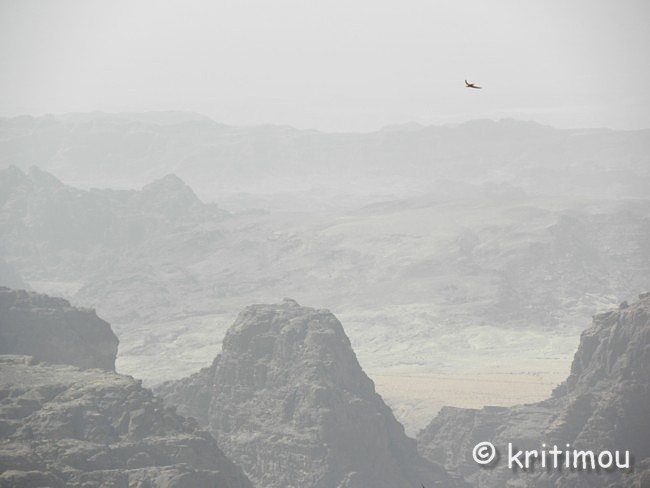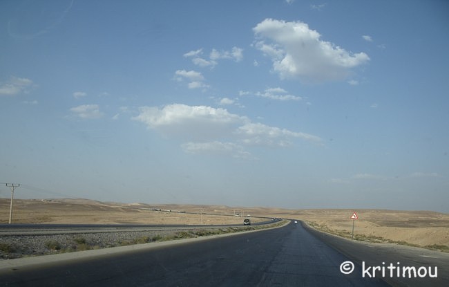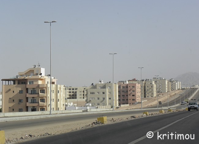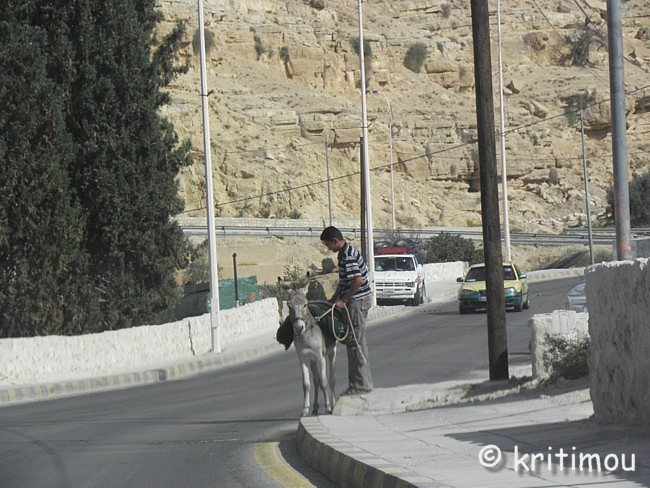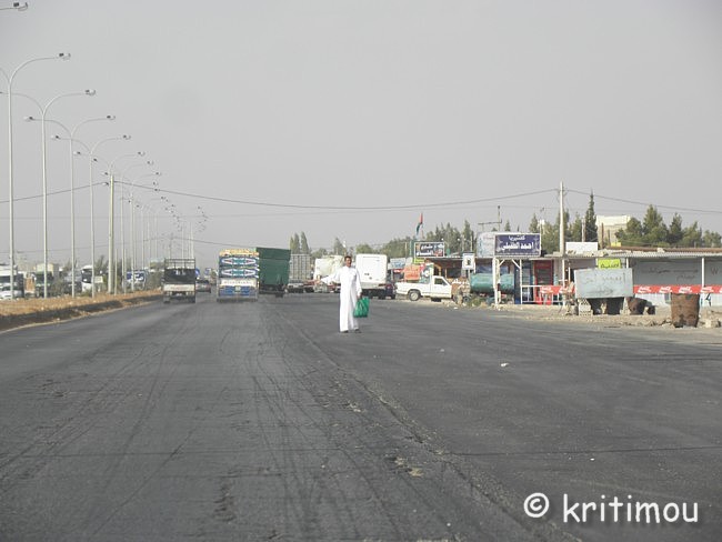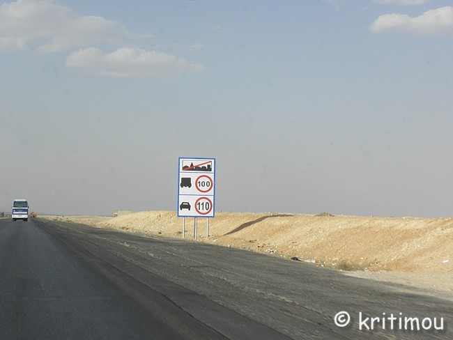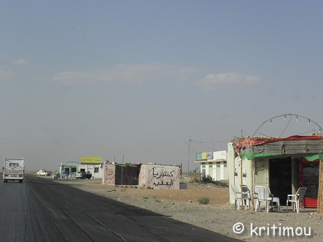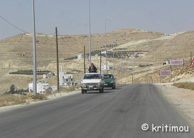 Um die Mittagszeit haben wir unsere Koffer fluggerecht gepackt und im Auto verstaut. Der ägyptische Hotelmanager macht uns noch ein Geschenk: eine schöne, handgearbeitete Schmuckschatulle aus Leder. Das hätten wir nicht erwartet und freuen uns sehr. Für unseren Rückweg nach Amman könnten wir die über 300 Kilometer in kürzester Zeit über die Wüstenautobahn zurücklegen. Doch wir hätten dann bis zum Abflug um 4.30 Uhr am darauffolgenden Morgen noch sehr lange Zeit. Daher möchten wir ein paar Schlenker einbauen und die wunderschöne Landschaft nochmals genießen. Zunächst nehmen wir zwar die Autobahn, doch nur bis zum Abzweig zur Königsstraße, die doch um einiges reizvoller und abwechslungsreicher ist. Außerdem kennen wir die Strecke zwischen Petra und Kerak auch nur im Dunkeln. Insgeheim hoffe ich auch noch auf einen Abstecher ins Dana Naturreservat, das ebenfalls dort in der Nähe liegt. Die Ausfahrt noch vor dem Innenstadtbereich von Aqaba kennen wir ja jetzt, sodass wir schon bald ein letzten Mal über die palmenumsäumte Straße nach Norden stadtauswärts fahren. Wieder lassen wir den Blick über die neuen Wohngebiete schweifen, die Stadt wächst, und man kann davon ausgehen, dass die ehrgeizigen Vorhaben das Gesicht der Stadt schon bald verändern werden. ![]() Ein letztes Mal kommt uns die Aqababahn entgegen, ihre Waggons voll beladen mit kostbaren Bodenschätzen. Wir passieren die Zollabfertigung (nur ein kurzer Stopp) und den Truck Compulsory. Und dann ist auch schon bald der Abzweig nach Wadi Rum erreicht. Der rote Sand und die Felsblöcke, die der Landschaft ihr charakteristisches Aussehen geben, lässt uns nochmals an unseren Ausflug in die Wüste erinnern. Im Folgenden wird die Umgebung der Schnellstraße immer flacher und langweiliger. Über die Wüstenstraße kann man daher auch in der Regel die 110 erlaubten Stundenkilometer für PKWs und 100 für LKWs voll nutzen, da die Strecke schnurgerade und ohne Berge öder Täler nach Norden führt. ![]() Vor tausenden von Jahren war das auch schon so, man kam einfach schneller voran. Doch häufig wurden die Karawanen überfallen, weil eben kein Schutz vorhanden war, keine Burg, in die man sich retten konnte, keine Felsenstadt wie Petra, in der man hätte Schutz suchen können. Die Autobahn zerteilt stellenweise Orte, statt sie zu umfahren. Angekündigt werden sie durch die Schilder mit den Piktogrammen einer Ortschaft (Häuser und Moschee) und einem großen roten Ausrufezeichen. Um auch wirklich die notwendige Geschwindigkeitsbeschränkung zu erreichen, wurden auch hier zig „Hubbel“ auf der Schnellstraße eingebaut, die man nur im Schritttempo überfahren kann. Auch hier gibt es maximal englische Hinweisschilder auf Ortschaften, die noch in einiger Entfernung liegen, und Amman ist auch immer wieder ausgeschildert. Doch englische Bezeichnungen der gerade durchfahrenen Orte gibt es auch auf der Autobahn nicht. Nur bei Eintritt bzw. Ausfahrt aus einer Municipality kann man ein Welcome oder Good-bye lesen. Die Dörfer gleichen sich alle: Kleine Geschäfte am Straßenrand bedienen insbesondere die passierenden LKWs. Jedes Dorf an der Durchgangstraße verfügt über Werkstätten. Auch Lebensmittel werden angeboten. Und vieles andere, was ein Brummifahrer braucht, denn zahlreiche LKWs sind über diese Strecke unterwegs, sicherlich von Aqaba nach Amman und vielleicht sogar bis nach Damaskus und zurück. ![]() Touristen halten aber eher nicht an. Als wir auf eine Zigarettenlänge in einem der für uns namenlosen Dörfer pausieren, kommen drei Jungs spontan auf uns zu, um uns kennenzulernen. Für sie ist es offensichtlich etwas Ungewöhnliches. Sie betrachten die Farbe meiner Augen und stellen sich vor. Als wir die Namen wiederholen, kichern sie schüchtern. Auch ihnen fällt es schwer, unsere Namen auszusprechen, doch es macht ihnen Spaß. Das Treiben wird von Erwachsenen in einem Geschäft hinter uns sorgfältig beobachtet. In einigen Dörfern hat man Schutzmauern um die Wohnhäuser gezogen, die etwas abseits der Straße liegen. Sie verhindern Einblicke in die Privatsphäre. Viele Einheimische sind noch per Anhalter unterwegs. Sie nutzen die langsame Durchfahrt der Wagen durch die Orte für eine Mitfahrgelegenheit. Einige warten noch darauf, andere haben sie bereits erhalten. ![]() ![]() Wieder kommt uns ein Abschleppwagen mit einem völlig zerbeulten Auto entgegen. Einige Unfälle haben wir gesehen, bei denen die Fahrer offenkundig die Kontrolle über den Wagen verloren hatten. Sie landeten im Graben, die Kutsche kaputt, sie selbst aber nur schockiert, ansonsten unverletzt. Statt in Richtung Ma’an weiterzufahren, biegen wir auf der Höhe von Ras an Naqab wieder auf die Königsstraße ein. Gleich führt die Straße bergan, sodass wir schon bald links im Dunst wieder das unter dem Meeresspiegel gelegene Wadi Araba ausmachen können, sicherlich auch heute wieder mit sehr hohen Temperaturen, wie im Jordantal. Al Tayyibah erleben wir bei der Durchfahrt als ein sehr grünes, wohl wasserreiches Dorf mit Olivenhainen. Die Ernte hat bereits begonnen. Vor einem Gebäude, auf einer Freifläche, wurden Oliven in der Sonne flach ausgelegt. (Oder sind es Trauben, aus denen jetzt Rosinen entstehen?) Noch vor Wadi Musa queren Kamele die Fahrbahn. Sie sehen so gutmütig aus. Die meisten haben eine herabhängende, samtige Unterlippe, die beim Daherschreiten immer auf- und niederhüpft. Und dann öffnet sich der Kessel von Petra mit den Shara Bergen, eine grandiose Aussicht! ![]() Im Randbezirk von Wadi Musa erhalten wir neben dem touristischen doch noch einen anderen Blick auf den Ort, nämlich den des Alltags der Bewohner. ![]() ![]() Nur wenige Meter weiter halten wir an einem Krämerladen, um Wasser zu kaufen. Doch der Besitzer hat noch ganz andere Köstlichkeiten. Er kann zwar kein Englisch, doch ein Freund hilft sprachlich aus. So erstehen wir z.B. ein Pfund Gewürzmischung aus Thymian, geröstetem Sesam und Weizen, Salz und weiter
