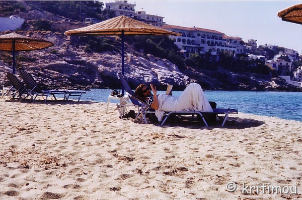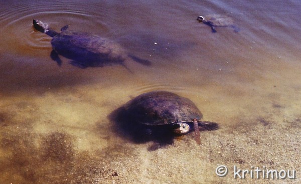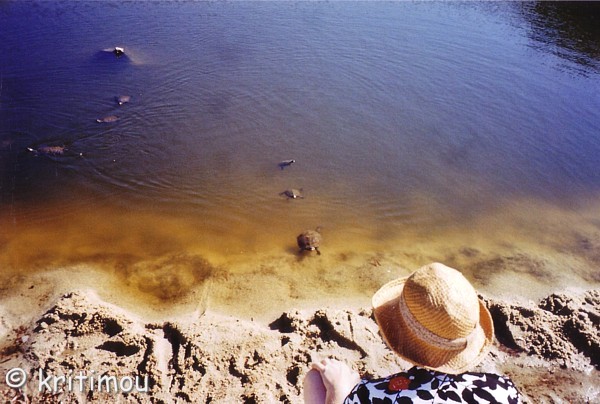 Ich muss gestehen, dass sie mich zu Beginn etwas abgeschreckt hat, die Information, dass Armenistís aufgrund der schönen Strände in der Nachbarschaft das touristische Mekka Ikarías sein soll. Ich stellte mir tausende von sonnenhungrigen Pauschaltouristen vor, die dem Ort ihren Stempel in Form von unzähligen Hotels und entsprechenden Geschäften mit Tourismusartikeln aufgedrückt haben. Doch kein Grund zur Besorgnis. Nun ja, ein bißchen trifft es zwar schon zu, nur die Zahl stimmt nicht. Wie wir erfuhren geht es außerhalb der Saison sehr ruhig und beschaulich zu, während im Juli die Zahl der Touristen ständig zunimmt. Auch wir konnten beobachten, wie insbesondere zu den Wochenenden immer mehr (Bade-)Gäste, vor allem Griechen, auf die Insel kamen. Nur wenige reisten zum Wochenbeginn wieder ab. Allerdings hielt sich der „Ansturm“ noch sehr in Grenzen. Viele kommen vom Festland, aus Athen, eine nicht unbeachtliche Zahl aber auch aus Übersee, Exil-Ikarióten, die ihr Glück in der Fremde gesucht haben. Im August ist es dann brechend voll, die Tavernen im Ort sehr gut besucht und in Ermangelung von genügend anderen Lokalen, in denen man den Abend ausklingen lassen könnte, meist auch bis tief in die Nacht besetzt. Ich stelle mir vor, wie man mit hungrigem Magen von einem Restaurant zum nächsten zieht und einfach keinen Platz mehr bekommt. Ich glaube, dieses Szenario ist gar nicht so abwegig, und bin froh, dass jetzt noch Juli ist. Doch ich wette, in anderen, ebenfalls warmen Monaten außerhalb der griechischen Ferienzeit, wenn die Hitze nicht so lähmend wirkt, kann man hier in aller Ruhe und doch nicht vollkommen abgeschieden, wundervolle Wochen verbringen. Hauptanziehungspunkt von Armenistís sind zweifelsohne die wunderschönen Strände. Wie wir erfahren sind manche Inselfahrer, die in der absoluten Hochzeit um den 15. August herum keine Zimmer vorbestellt haben, zum Übernachten auch schon an diese Strände ausgewichen. Zum Glück erleben wir diese Massen nicht, haben eine schöne Unterkunft und können die Bademöglichkeiten um Armenistís herum am Tage genießen. Während wir den Strand von Mesachtí ja schon bei der Superpuma-Vorstellung erlebt haben, beschließen wir, heute unserem Bedürfnis nach Badeerfrischung an dem näher zu Armenistís gelegenen Livádhi-Strand nachzukommen. Auf dem Weg dorthin passieren wir die kleine Sand-Kies-Bucht, an der wir schon einmal gebadet haben. Dahinter befindet sich eine weitere, die einem Südseestrand gleicht. Heller Sand und auch im Wasser kein einziger Stein. Eingerahmt von Felsen trifft auch hier der Wind nicht direkt auf den Strand. Die Bucht ist dicht belegt. Ein kleiner Junge mit Schwimmflügeln lässt selbstvergessen sein Spielzeugboot schwimmen. Am Livádhi-Strand angekommen breiten wir unser großes Strandlaken auf dem Sand, direkt neben den bambusgedeckten Sonnenschirmen und Liegen, aus. Allerdings lässt die Stabilität unseres eigenen Schirmes, den wir in den Sand gerammt haben, zu wünschen übrig. Bedrohlich schwankt er im immer kräftiger wehenden Meltémi, so dass wir uns kurzerhand auf zwei der vielen freien Liegen niederlassen. Der Wind treibt die Wellen frontal auf die Uferlinie zu. Da wir uns mit den Strömungen hier nicht auskennen, bleiben wir in der Nähe des Strandes. Doch wie toll es ist, hier herumzuplantschen. Der erste kühle Eindruck weicht einem himmlischen Badegefühl, als wir uns kopfüber und mit ein paar kräftigen Bewegungen ins klare Wasser stürzen. Fantastisch! Nach einer Weile, als wir schon wieder im Bambusschatten liegen, kommt der Kassierer und nimmt von uns beiden zusammen sieben Euro ein. Das ist ein stolzer Preis, denken wir, und rechnen ihn auf die Dauer unseres Urlaubs hoch, wenn wir jeden Tag hierher kämen. Ach egal, hier sind wir jetzt, genießen die Erholung und lassen die nächsten Stunden ganz entspannt an uns vorüberziehen. Im Schatten wird es durch den Wind zwischenzeitlich so kühl, dass wir uns in die Strandtücher wickeln. ![]() Lesend, dösend und ab und an ins Wasser tauchend vergeht die Zeit. Ein Eis wäre nicht schlecht. Dem Wunsch kann entsprochen werden, denn in einer Kantina gibt es Erfrischungen. Direkt dahinter sehen wir einen schilfgesäumten Fluss, der als bräunliche Brühe im Sand versickert. In der nassen Jahreszeit wird er jedoch bestimmt soviel Wasser führen, dass er sich über den Strand ins Meer ergießt. Ob dies der Fluss ist, in den ein Ikarus-Darsteller vor einigen Tagen anlässlich einer Theateraufführung gestürzt ist? Die Kinder sollen kreischend vor Vergnügen hinterher gesprungen sein. ![]() Fische und Schildkröten tummeln sich zahlreich. Letztere kommen näher, recken neugierig ihre Hälse über die Wasseroberfläche. Ob der Besucher etwas zum Fressen dabei hat? Wie wir feststellen, mögen sie vegetarische Kost in Form von Feigenstückchen, wagen sich dafür sogar eine kleine Strecke aus dem Wasser heraus, um den verlockenden Bissen zu schnappen und schleunigst wieder abzutauchen. ![]() ![]() Mit der Fortsetzung unserer Siesta im Bambusschatten lassen wir einen süßen Nachmittag verstreichen. Eine kleine Gruppe weiterer Badegäste ist angekommen, die sich gleich neben uns niedergelassen hat. Die jungen Leute haben ein ausgesprochenes Kommunikationsbedürfnis, das sich nach einer halben Stunde aber etwas legt. Andere haben es sich direkt am Wasser auf dem eigenen Handtuch bequem gemacht. Eine Fähre kreuzt das Meer in nicht allzu weiter Entfernung. Unsere Blicke begleiten sie. Wie schnell die Schiffe heutzutage doch unterwegs sind. Time ist money! Mit einem Mal rollt eine Welle auf den Strand zu, die viel höher als alle vorangegangenen ist und offensichtlich von ebendiesem Schiff verursacht wurde. Wie aus dem Nichts überschwemmt sie mehrere Meter des Strandes, erwischt die Badegäste, die in der Nähe der Wasserkante liegen, durchnässt Kleidung und Bücher, alles, was dort hingelegt wurde. Da kommt Bewegung in die Menschen! In der kleinen B